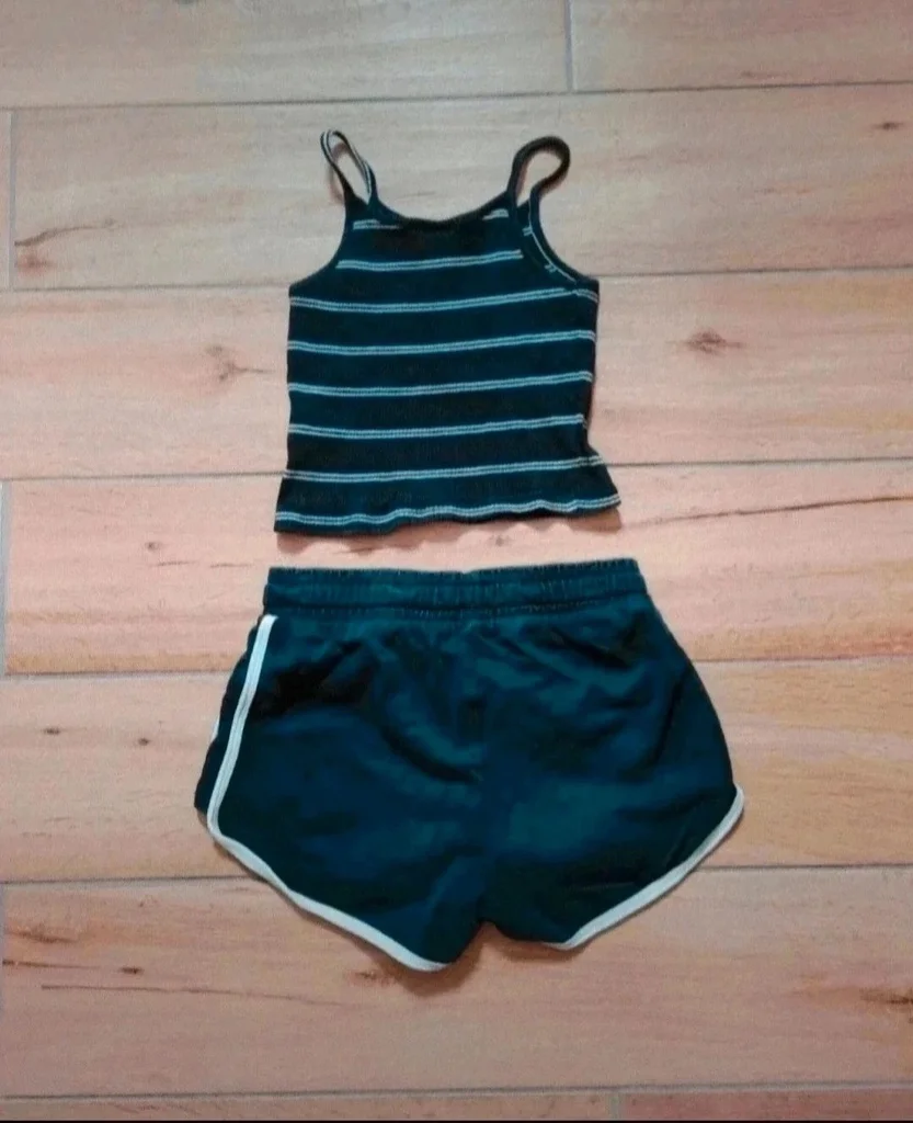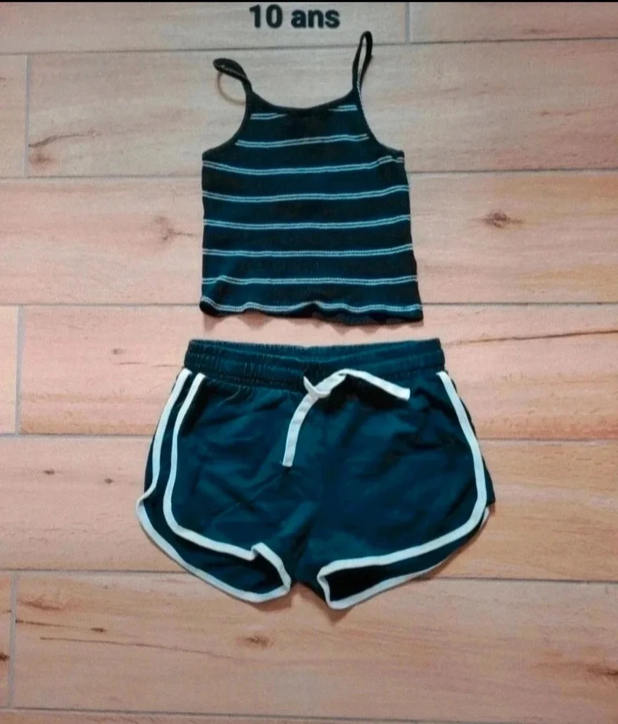 Je vends cet ensemble comprenant : Un débardeur noir à rayures blanches Un short de sport assorti noir avec liséré blanc Taille : 10 ans Marque : Gémo En très bon état. 📦 Envoi rapide et soigné