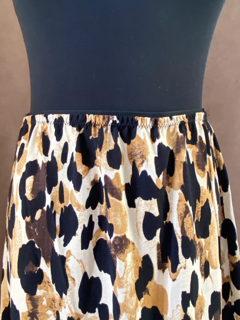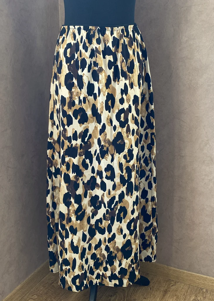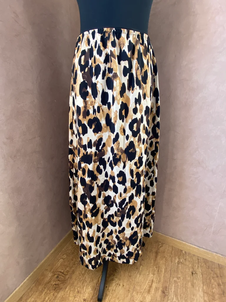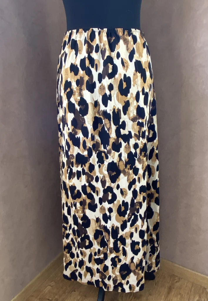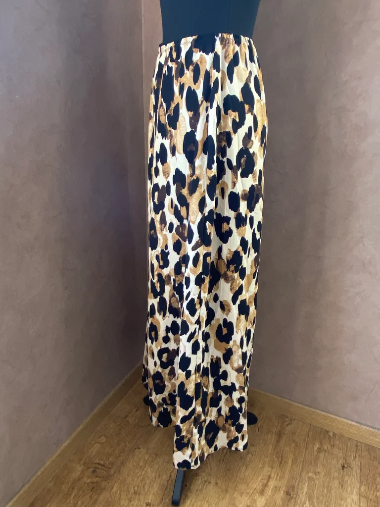 Ultra tendance et facile à porter, cette jupe longue avec son imprimé léopard dans des tons beige, camel, noir et écru 🐆motif intemporel, à la fois chic et moderne ✨ Marque : SFERA Taille : S En excellent état (jamais portée) 💫 Description : Beau mouvement au porté Large élastique noir à la taille : confortable et s’adapte parfaitement à la silhouette Coupe longue et fluide 📏 Mesures : Longueur : 90 cm Largeur taille à plat : 32 cm (élastique extensible) 🧵 Composition : 100% polyester 👌Idéale pour un look bohème, casual ou habillé ⚡envoi rapide du colis ⚡