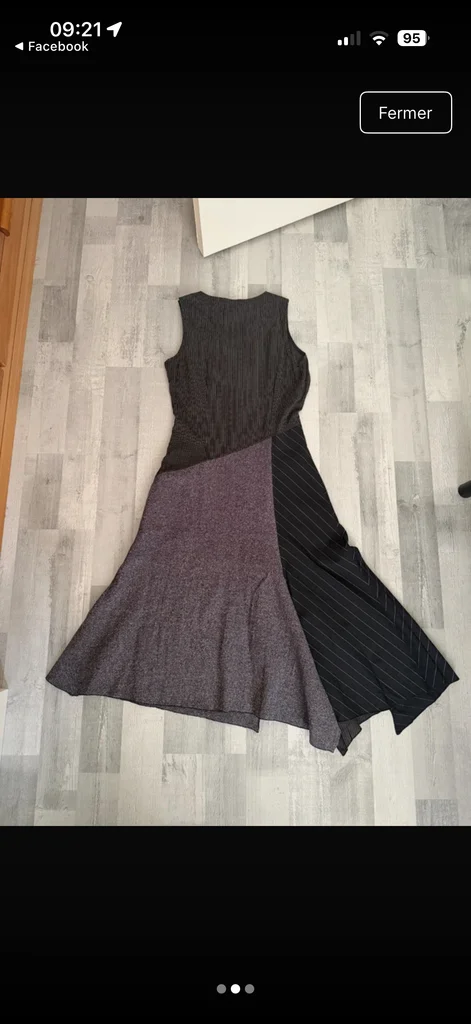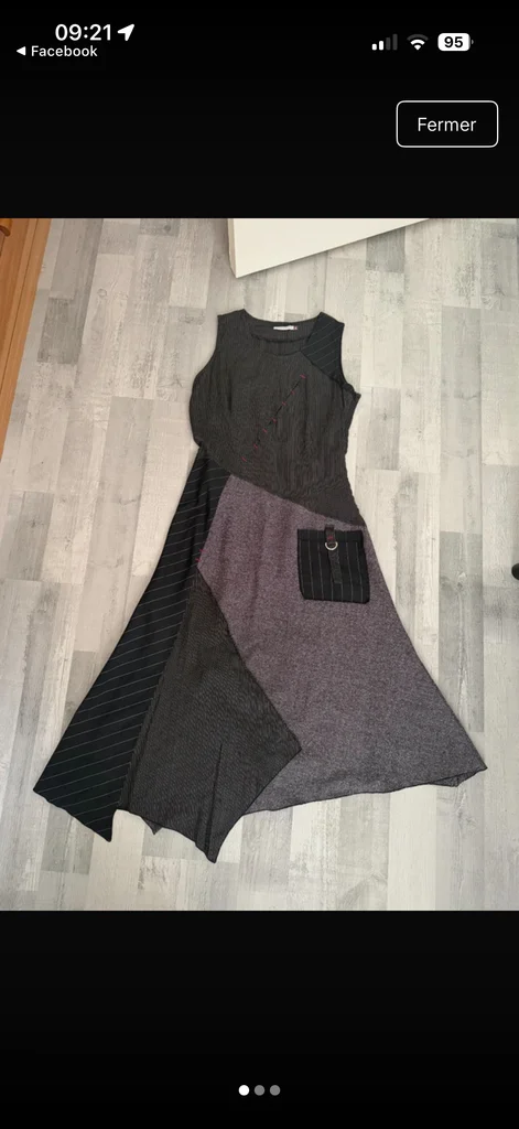 Vends robe sans manches de la marque Patrice Bréal, coupe asymétrique et originale. Très confortable à porter. Design : Mélange de motifs (patchwork) avec des rayures verticales et horizontales, et un empiècement gris chiné. Détails de surpiqûres rouges et petite poche fantaisie sur le côté. Coupe : Coupe évasée dans le bas avec des pointes (style mouchoir), très fluide. Taille : Étiquetée 38. La coupe est fidèle à la taille, elle convient parfaitement à un 38 (M). État : Très bon état général. Envoi : Rapide, effectué sous 24h à 48h maximum. #patricebreal #robeasymetrique #robepatchwork #styleoriginal #bohochic #robemidre #taille38 #moderesponsable #envoirapide