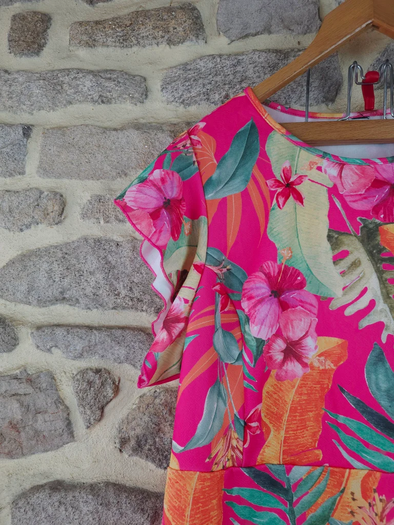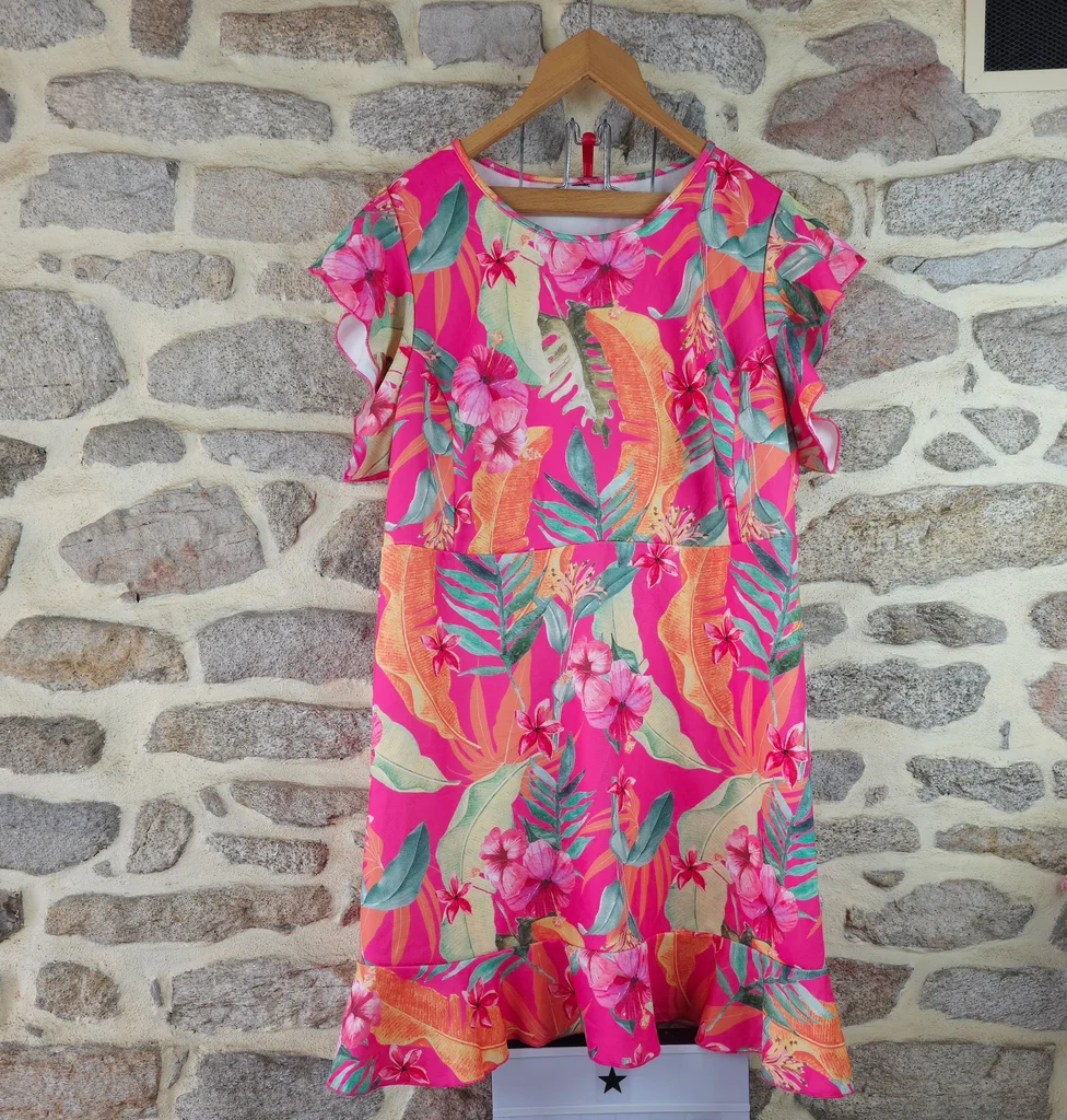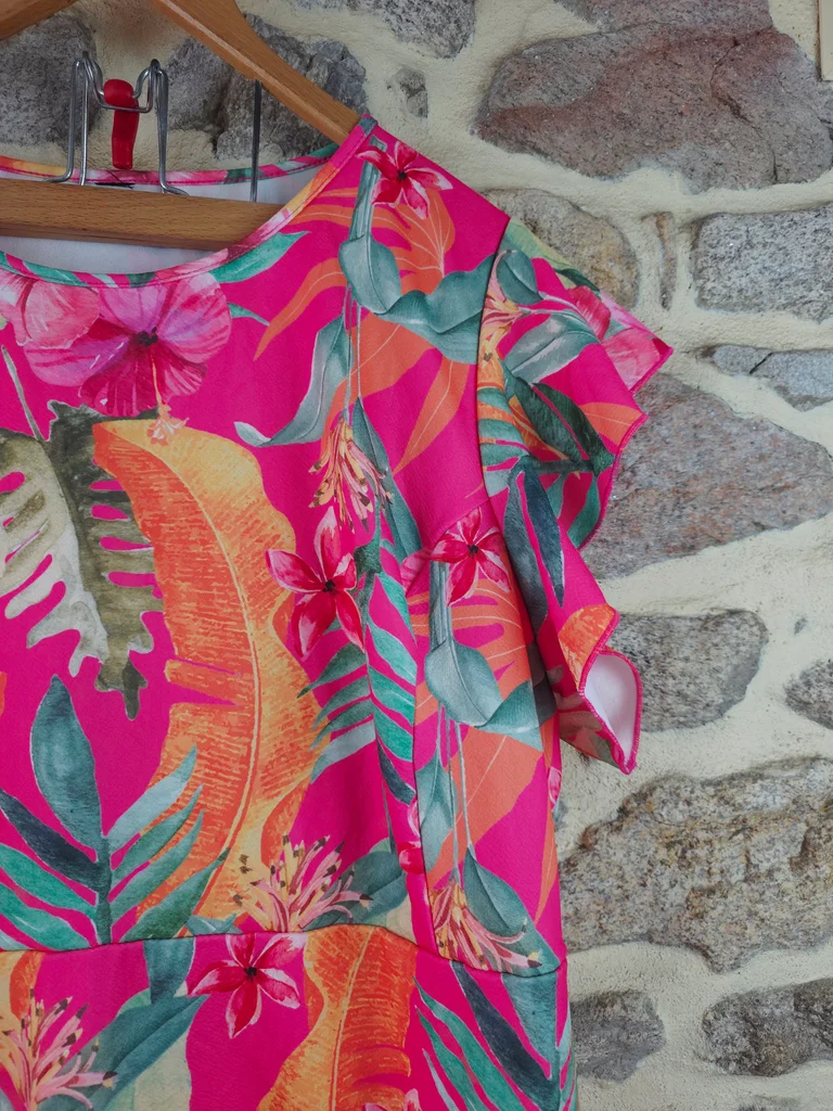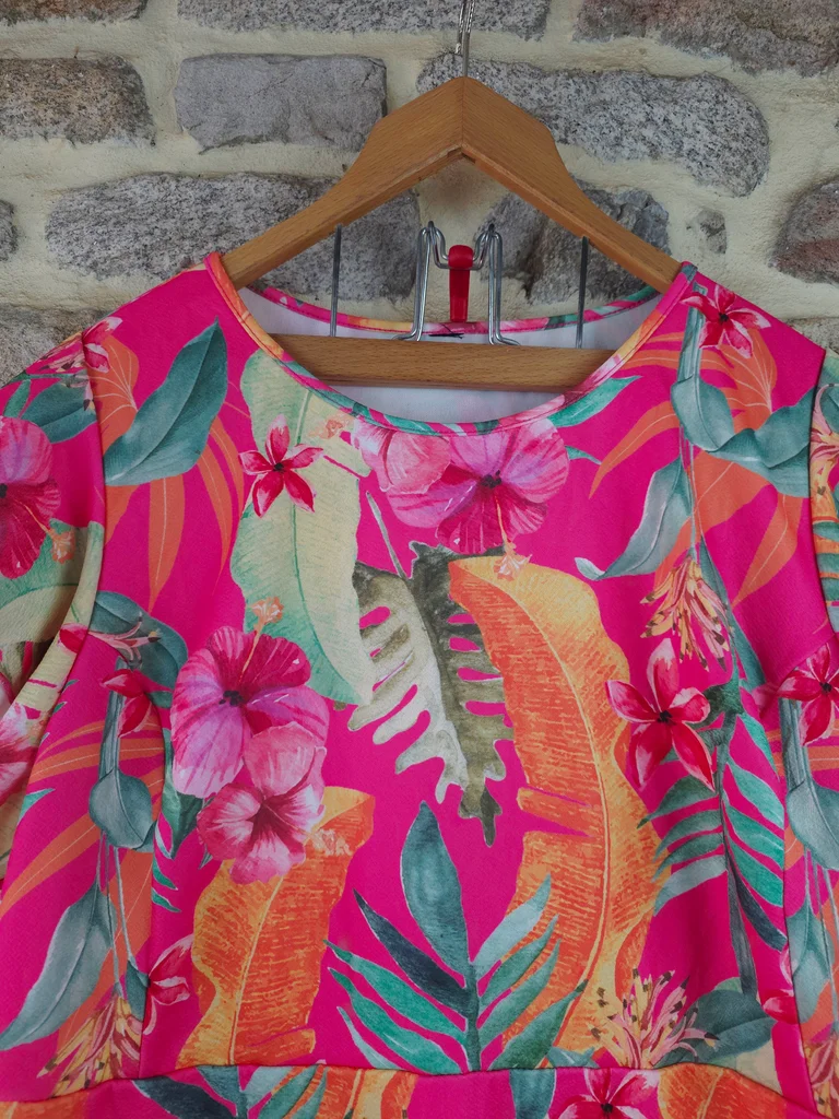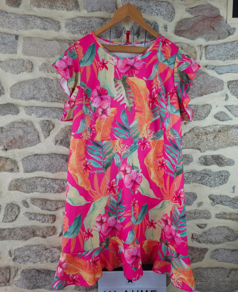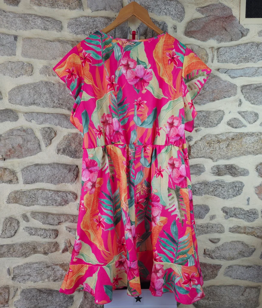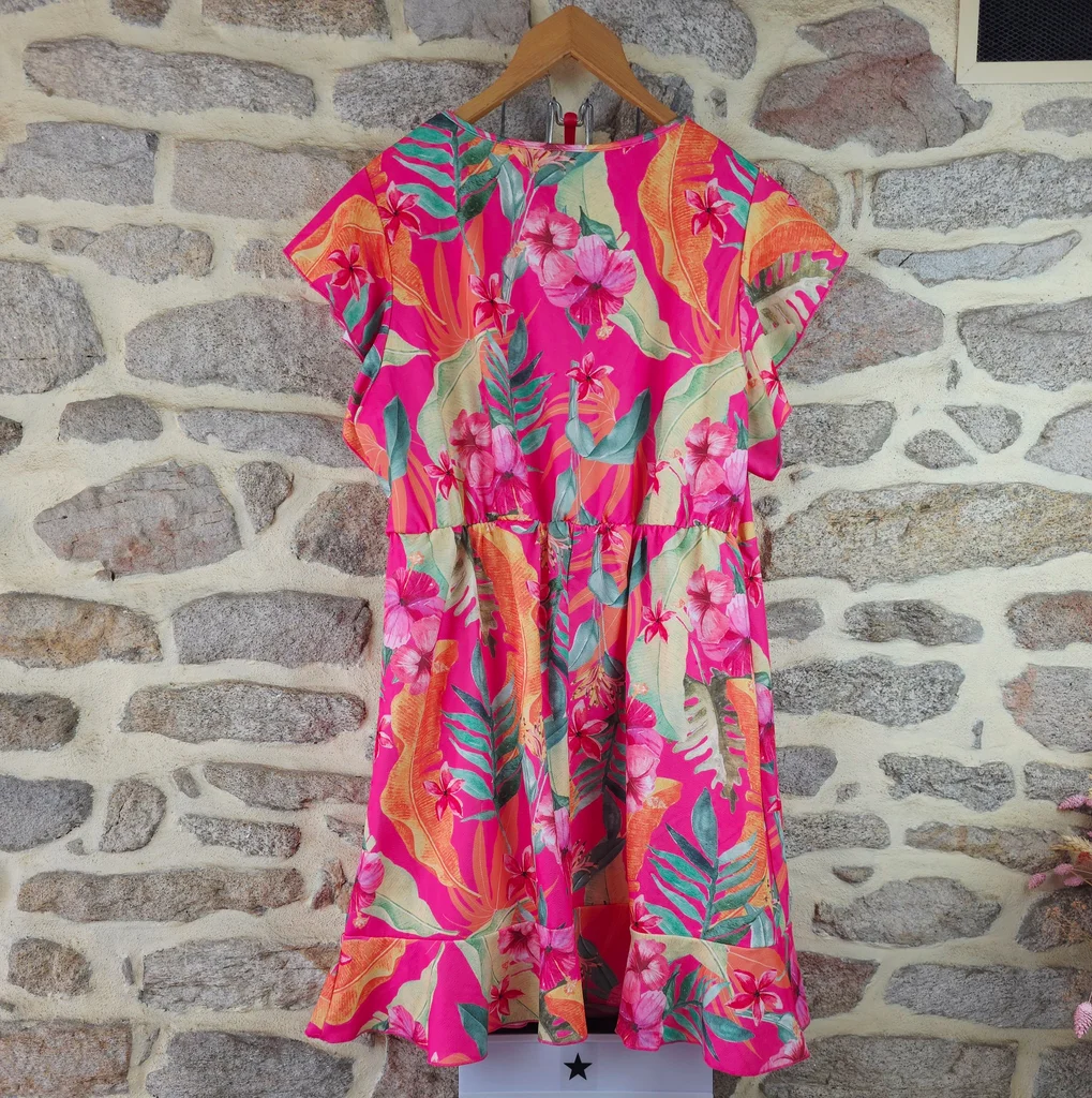 Robe babydoll flashy rose fushia à imprimé tropical exotique Femme Taille 54 marque Paprika ✴️ Col rond ✴️ Manches courtes papillon ✴️ Taille élastiquée froncée ✴️ Coupe ample et confortable ou se déploient de grandes feuilles de palmier, des bananiers dles fleurs exotiques (hibiscus ) dans des nuances vives d'orange corail, de jaune ensoleilé, vert émeraude, de vert anis et de rose plus pâle sur un fond rose fuchsia intense ✴️ Composition => 100 % polyester ✴️ Longueur => 100,5 centimètres ✴️ Mesure épaules à épaules => 43 centimètres ✴️ Tour de poitrine => 135 centimètres