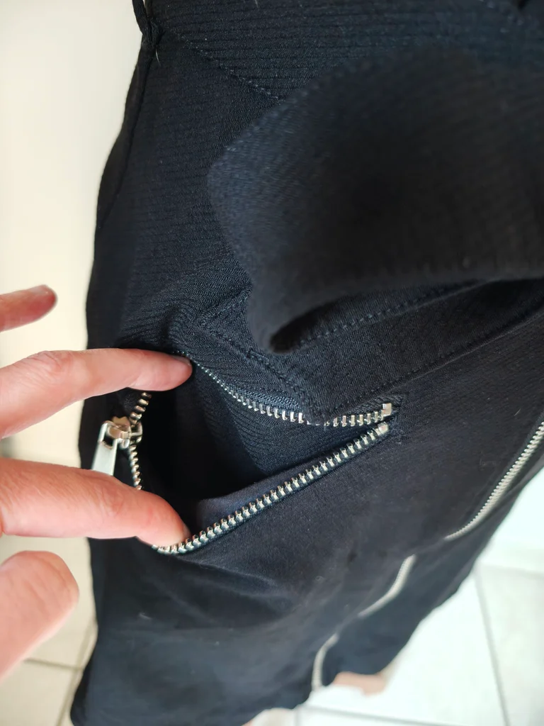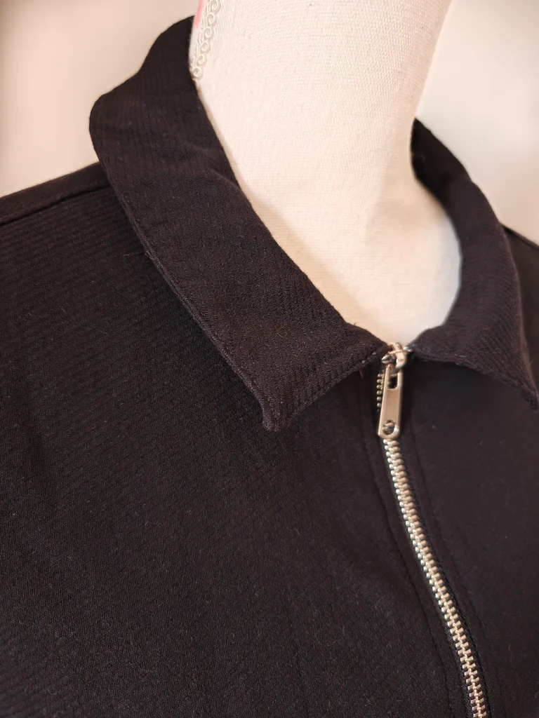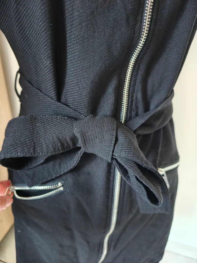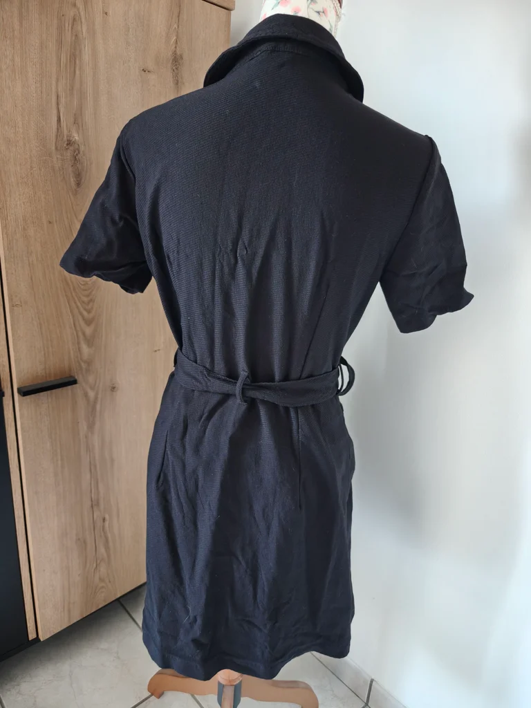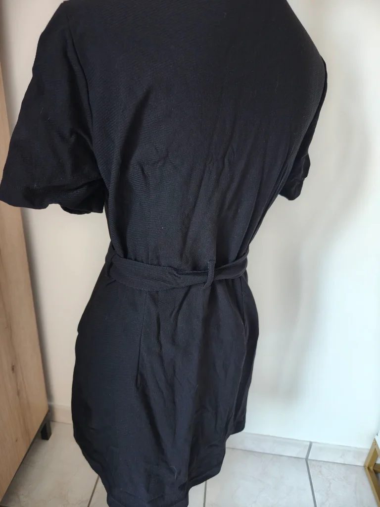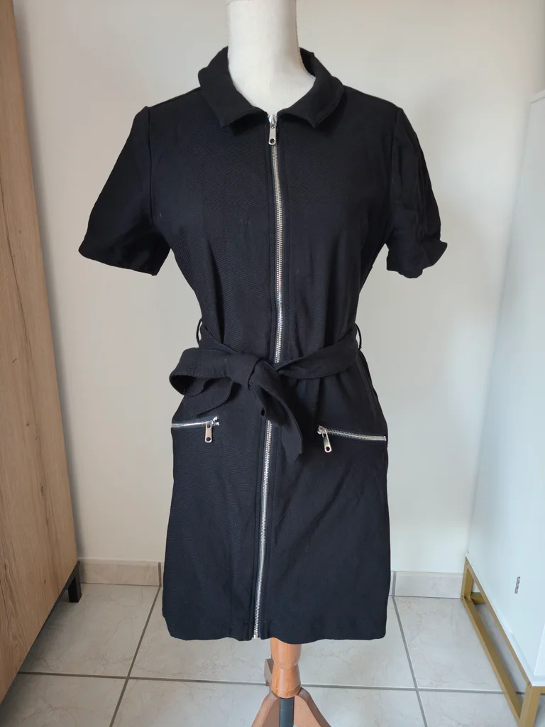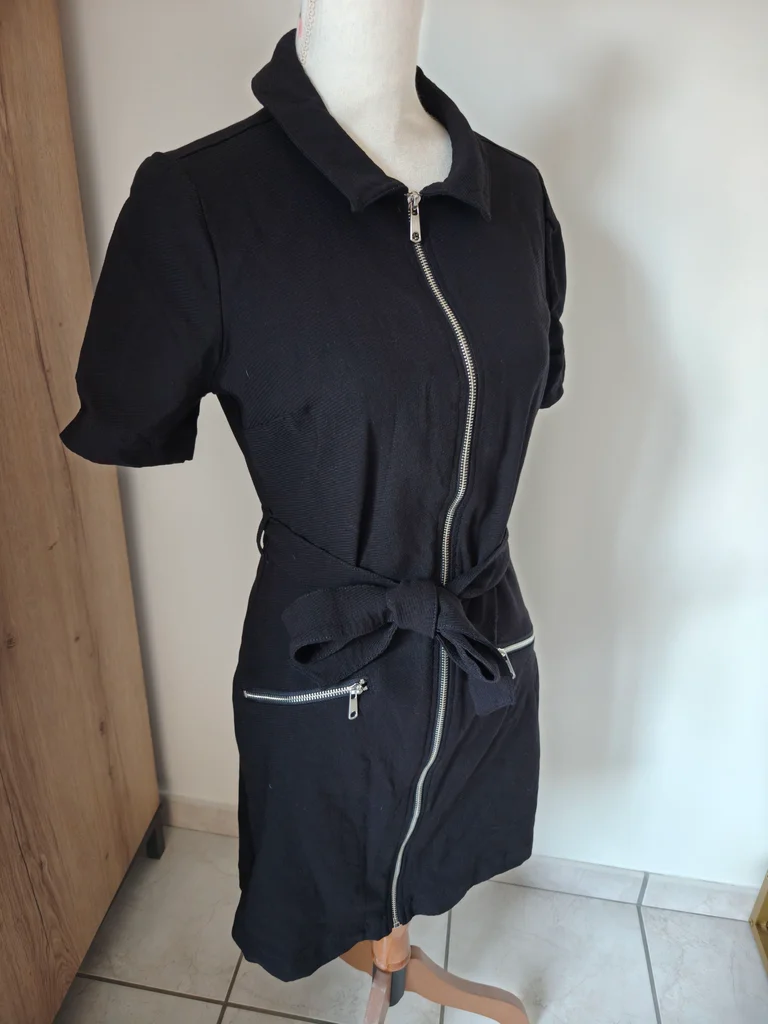 Petite robe noire demie saison Manches courtes S'ouvre entièrement avec fermeture éclair Longueur 90 Largeur aisselle à aisselle 46 Largeur taille 40 Ceinture noire à la taille, poches à l'avant 🏷️ Étiquette de taille et composition coupée. 🐱 Maison avec animaux 🐕 🚭 Non fumeur 🚭