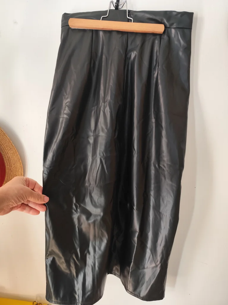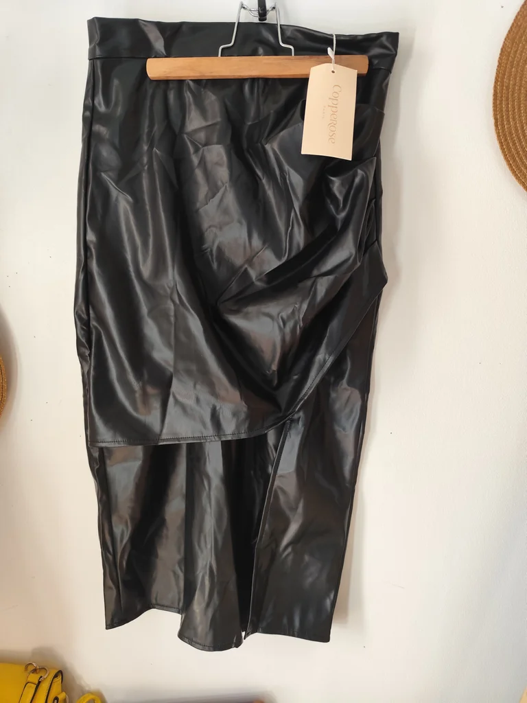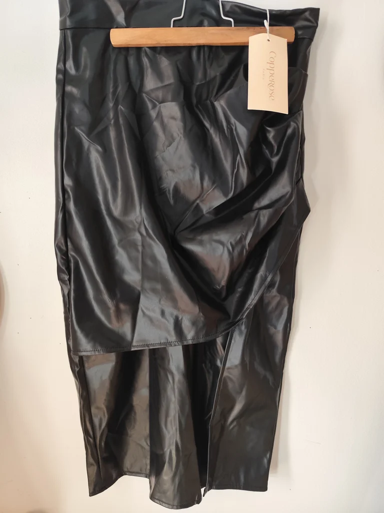 Jupe longue noire neuve avec étiquette marque Copperose Taille M taille petit 36 à petit 38 voir Mensurations ci dessous Simili fin et léger Empiècement à pince devant et fente devant sur la jambe Fermeture éclair dans le dos et pinces Élégante et raffinée convient en toute occasions La matière bouge bien elle est très extensible contrairement à la ceinture qui est moins extensible Largeur taille 36 la taille est légèrement extensible petit 38 Longueur 78 environ