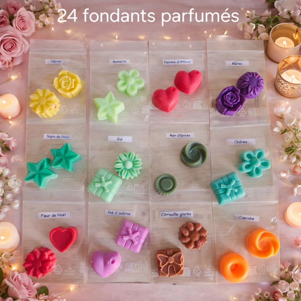 Bonjour 👋 24 fondants parfumés 100 % naturels N'hésitez pas à me demander la liste des senteurs. 🪶 Fabriqués avec des ingrédients de haute qualité 🪶 Parfums longue durée 🪶 Parfaits pour créer une atmosphère chaleureuse dans chaque pièce Un cadeau 🎁 offert dès 10 senteurs achetées. #creinstantdedouceur #bougieparfumée #cadeaudenoel #cadeaunaturel #faismain #artisanal #bougiesparfumées #bougiegourmande #bougiechantilly