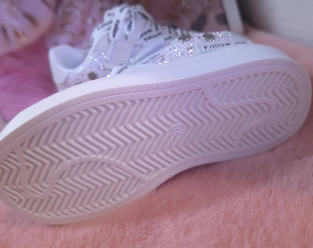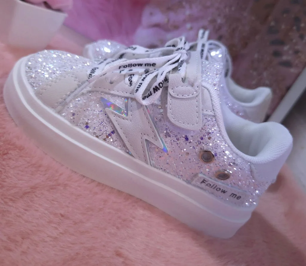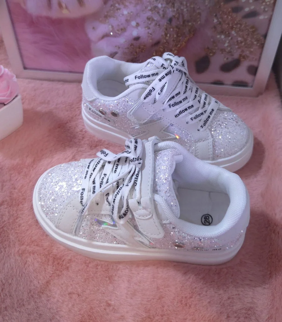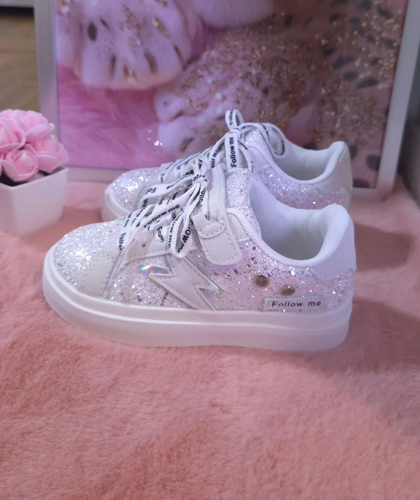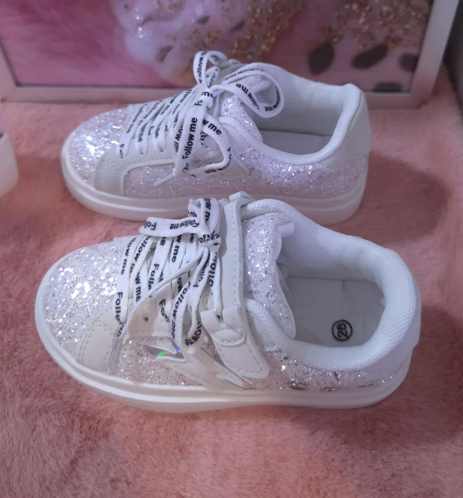 Baskets pailletées argentées taille 28. Elles taillent très bien. Munies d'un scratch en + des lacets