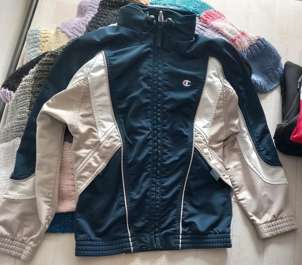 Description : Vends une veste zippée de la marque Champion en taille 8 ans. Couleurs : Bleu marine, beige/crème et blanc. Style : Sportswear / Vintage avec empiècements contrastés. Détails : Logo Champion brodé sur la poitrine. Col montant avec cordon de serrage décoratif. Poches latérales. Poignets et bas de veste élastiqués pour un meilleur maintien. État : Très bon état. La fermeture éclair fonctionne parfaitement.