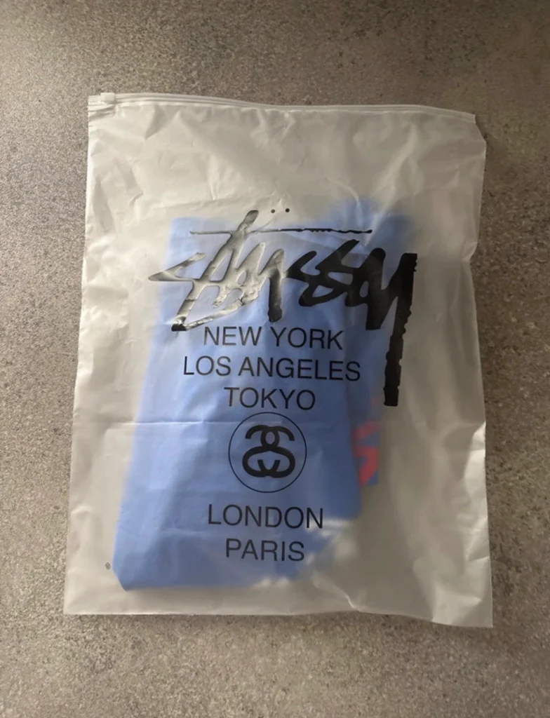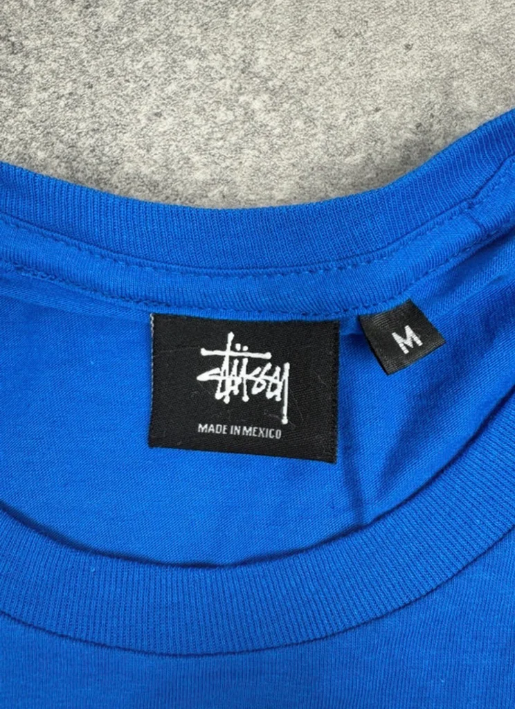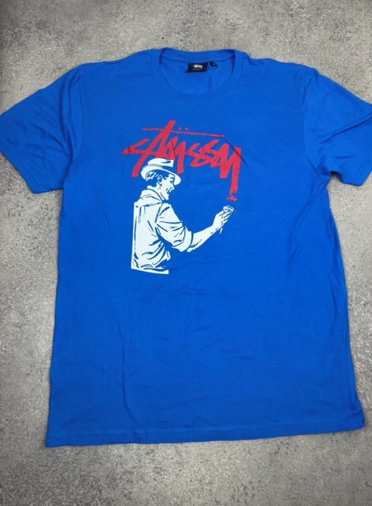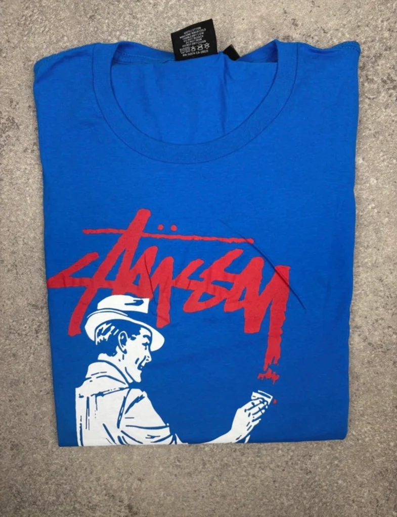 T-shirt Stüssy bleu avec logo rouge. Design original avec illustration style graffiti + logo signature Stüssy. Il est en très bon état et sera lavé pour la vente! ✅ Envoi sous 24/48h ✅ Dimensions largeur 51cm longueur 69cm
