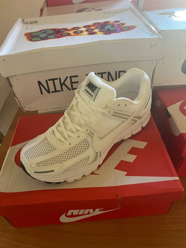 Nike Zoom Vomero 5 – Triple White / Silver Pointure : à préciser Tige mesh blanc intégral Overlays synthétiques blancs Swoosh blanc ton sur ton Détails argentés réfléchissants Semelle blanche chunky Zoom Air + Cushlon Boîte Nike originale 📦 NEUF avec boîte ✅ Coloris triple white ultra clean 🤍 Un des modèles les plus hype du moment 🔥