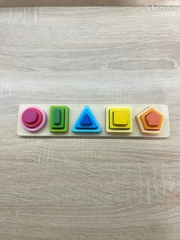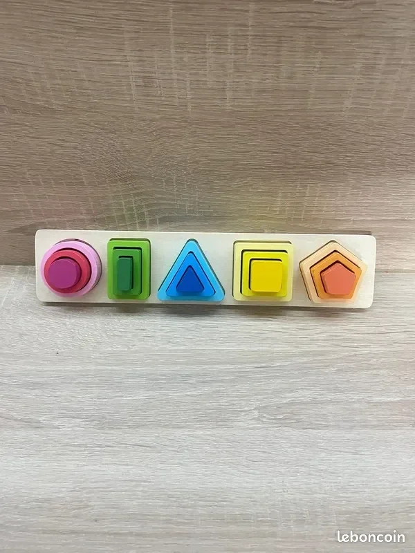 Jouet d'éveil aux formes et couleurs, parfait pour stimuler l'imagination et l'apprentissage des tout-petits. Un support visuel ludique et éducatif pour les enfants dès la naissance. - Type de produit : Jouet d'éveil - Âge recommandé : De 0 à 3 ans - Composition du lot : 1 plateau avec 5 formes gigognes (cercles, carrés, triangles, pentagones) - Formes : Cercles emboîtables, carrés emboîtables, triangles emboîtables, pentagones emboîtables - Couleurs : Rose, vert, bleu, jaune, orange - Matière : Plastique - Fonctionnalités : Formes gigognes à emboîter, apprentissage des couleurs et des formes Très bon état. Un excellent jouet pour l'éveil des enfants !