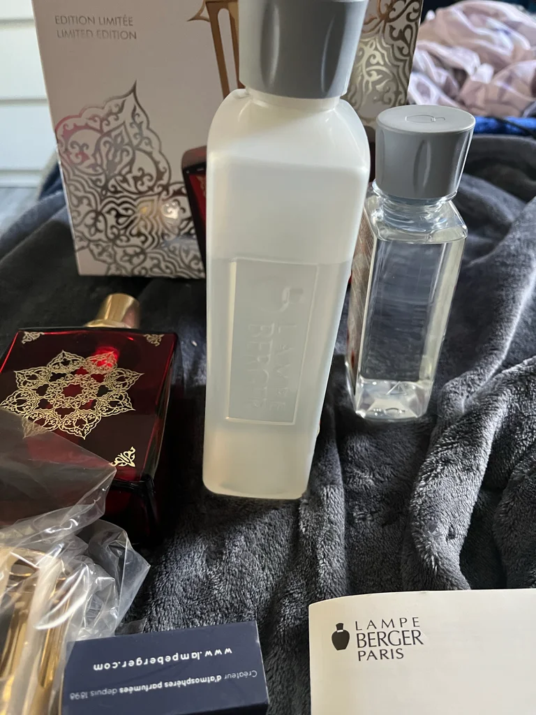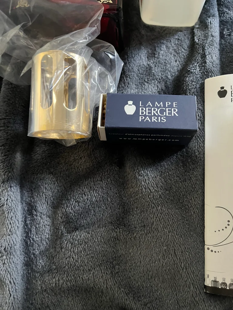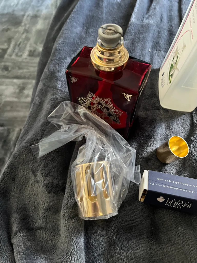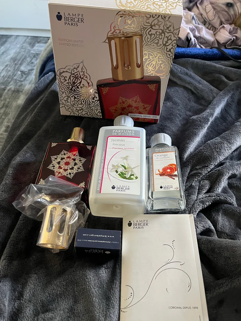 Coffret lampe Berger Paris de style classique avec son flacon en verre rouge rubis et son brûleur doré, parfaite pour parfumer votre intérieur avec élégance. - Matière : Verre et métal doré - Accessoires inclus : Flacon de parfum jasmin, un flacon orange cannelle,boite d’allumettes berger - Marque : Lampe Berger Paris - Édition limitée - Parfums inclus : Jasmin et Orange Cannelle Très bon état