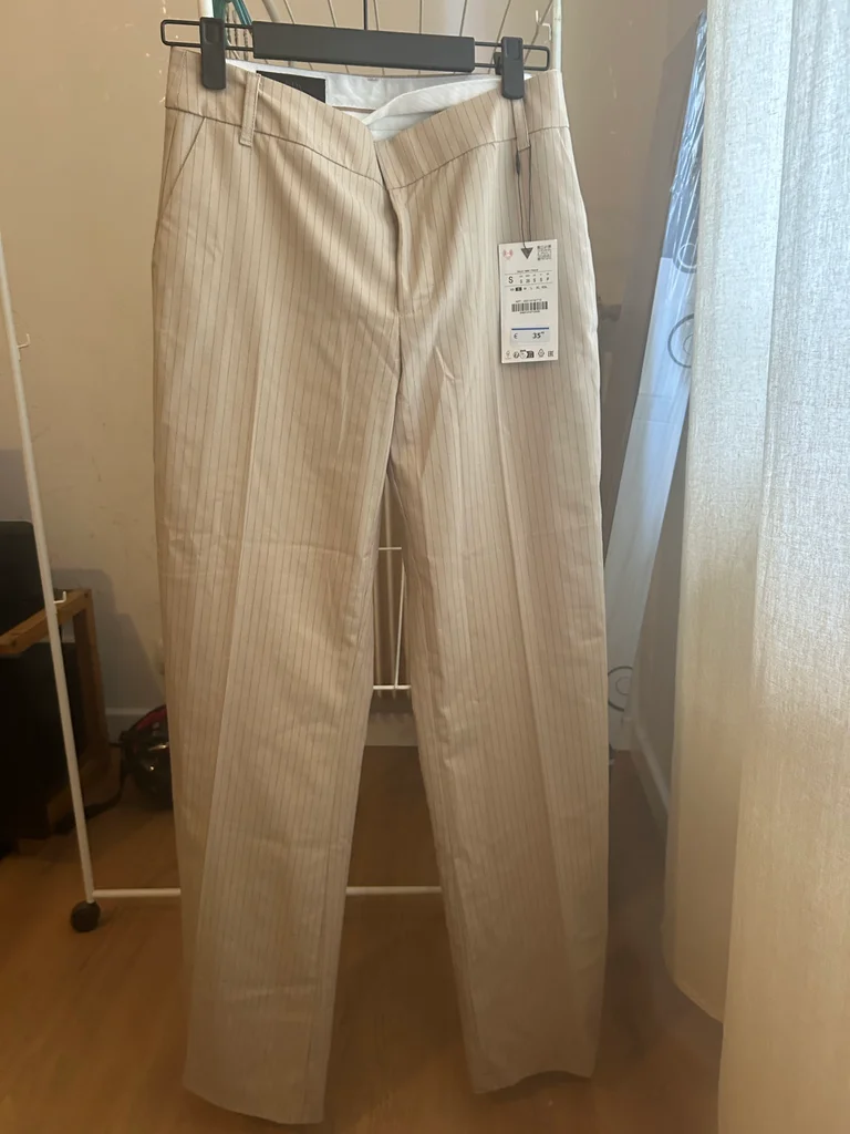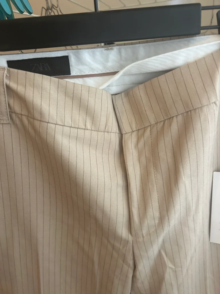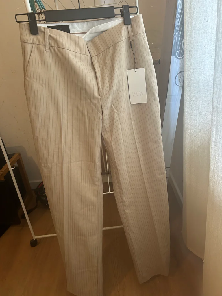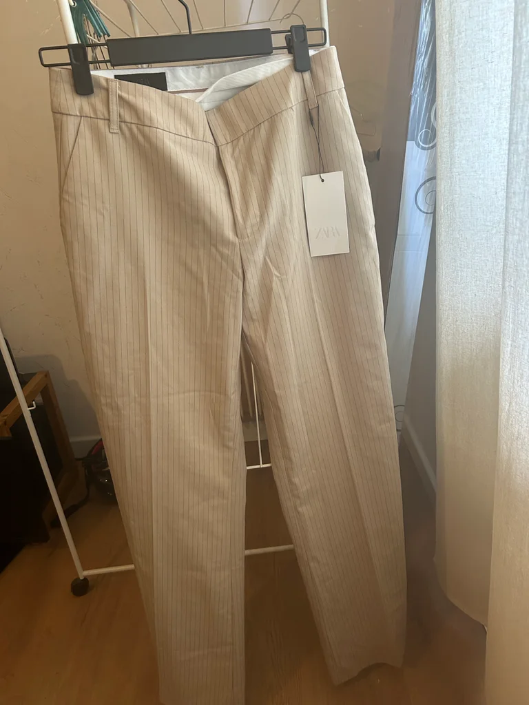 Pantalon droit Zara beige à fines rayures, taille S, neuf avec étiquette. Coupe élégante et intemporelle, parfaite pour un look chic, bureau ou casual. Matière agréable et facile à associer avec tout (chemise, top, blazer...). Jamais porté, état impeccable.