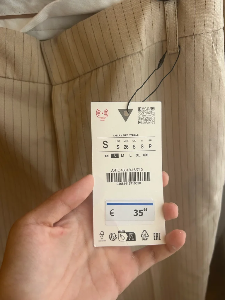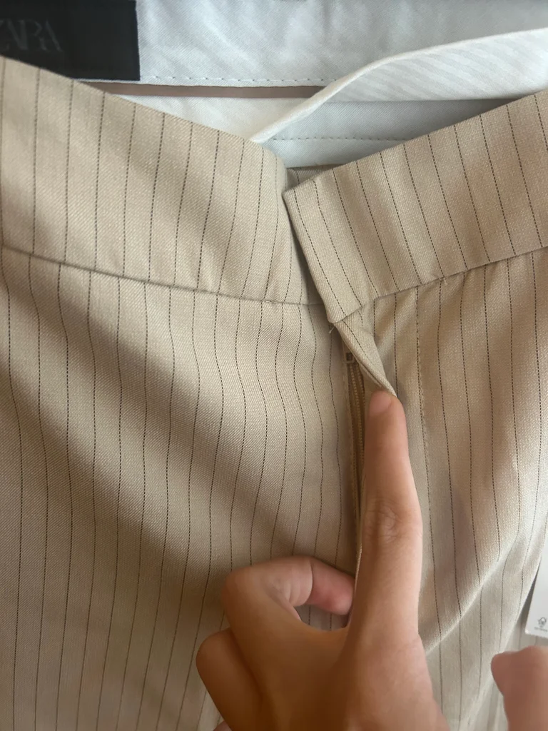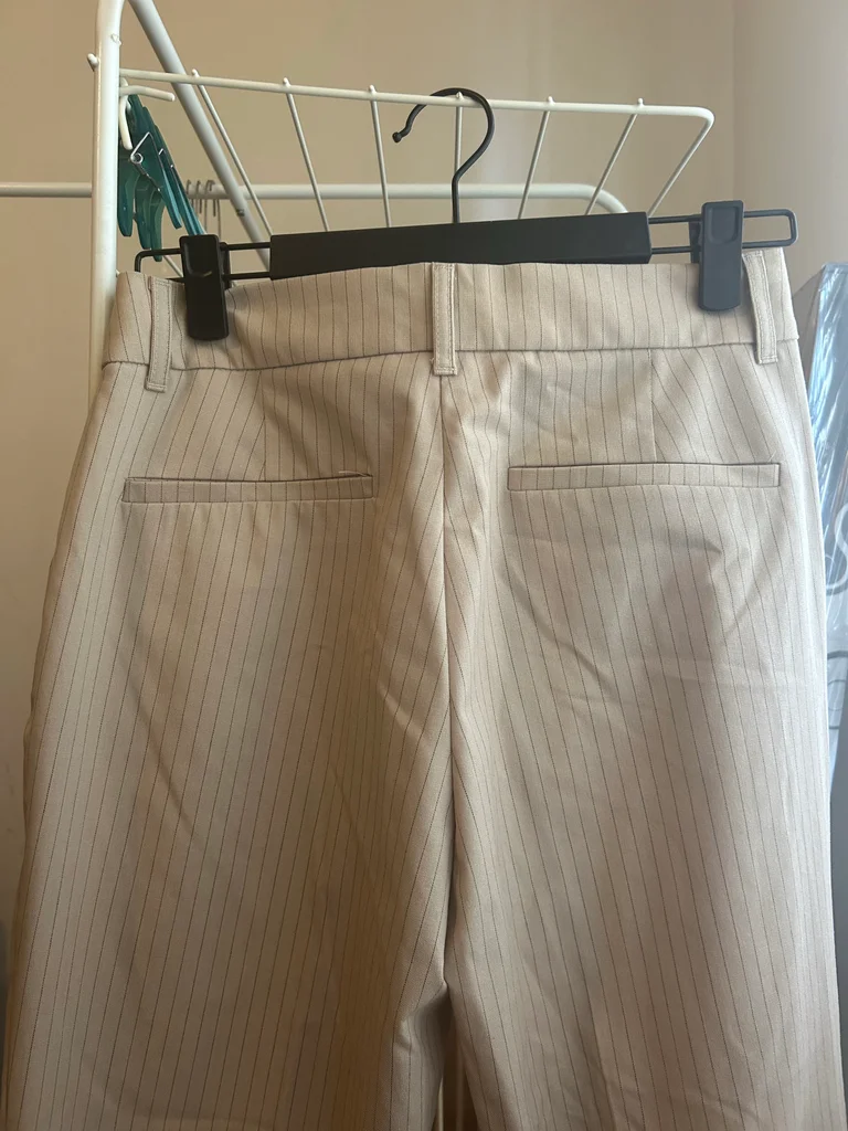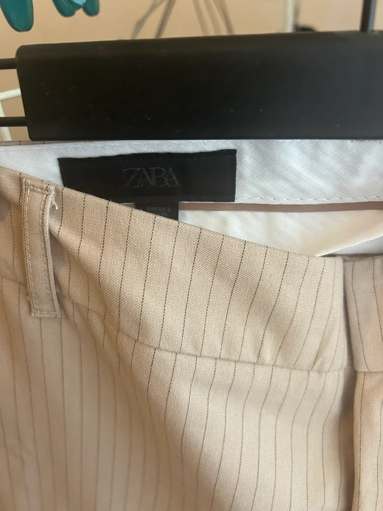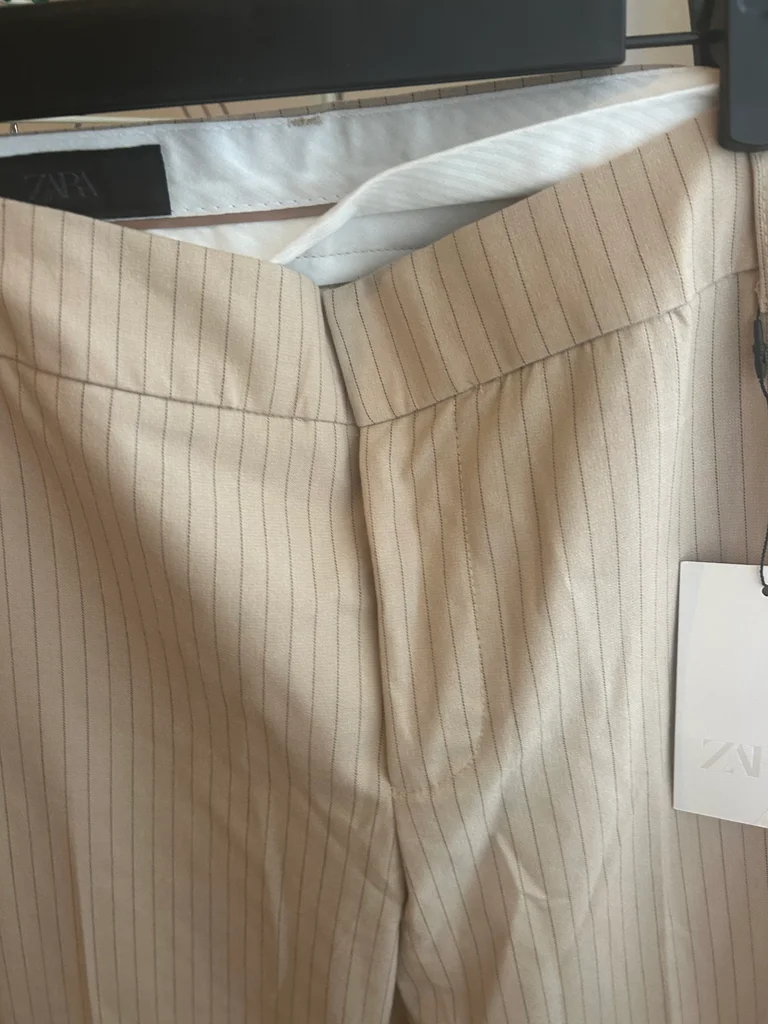 Pantalon droit Zara beige à fines rayures, taille S, neuf avec étiquette. Coupe élégante et intemporelle, parfaite pour un look chic, bureau ou casual. Matière agréable et facile à associer avec tout (chemise, top, blazer...). Jamais porté, état impeccable.