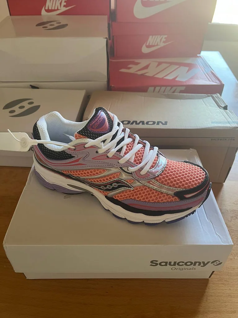 Saucony Progrid Omni 9 – Coral / Purple / Black / White Pointure : à préciser Tige mesh corail vif Overlays noirs & argentés Accents violet lavande Logo Saucony argenté Semelle blanche & violette chunky Étiquette encore attachée 🏷️ Boîte Saucony Originals 📦 NEUF avec boîte ✅ Coloris corail/violet ultra original 🪸💜 Modèle très tendance 🔥