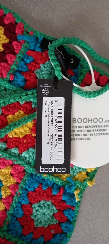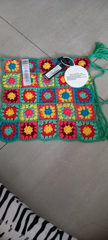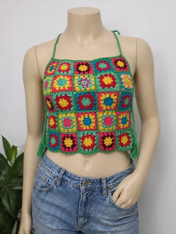Top crochet multicolore style bohème, fait en assemblage de carrés granny très colorés (vert, rouge, jaune, turquoise). Coupe courte avec forme triangle devant, lien à nouer autour du cou et dans le dos, avec petites franges sur les côtés. Parfait pour l’été, les festivals ou un look vintage/hippie 🌼 Peut se porter avec un jean taille haute, un short ou une jupe. État : neuf avec étiquette Taille : XS (matière extensible) Matière : crochet / maille