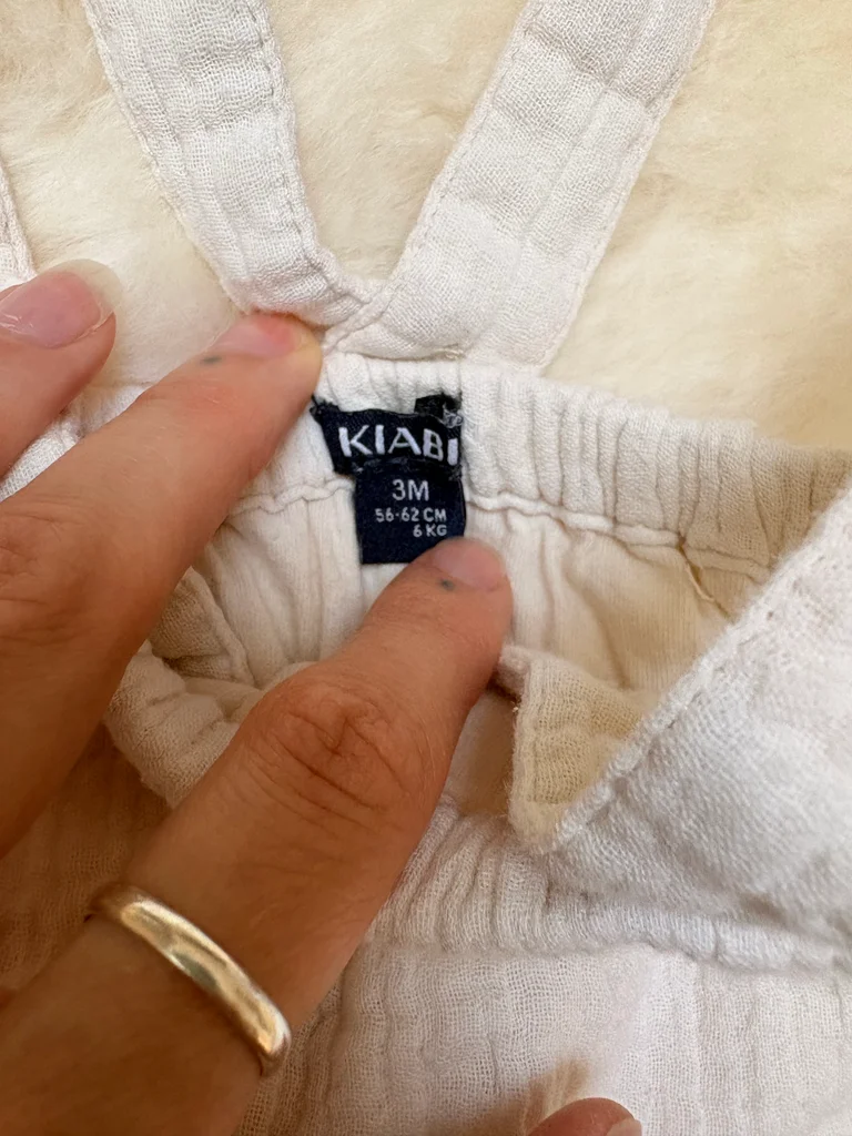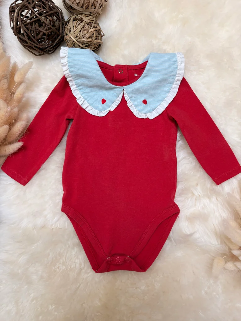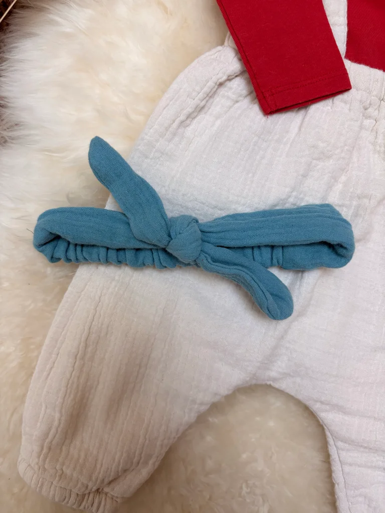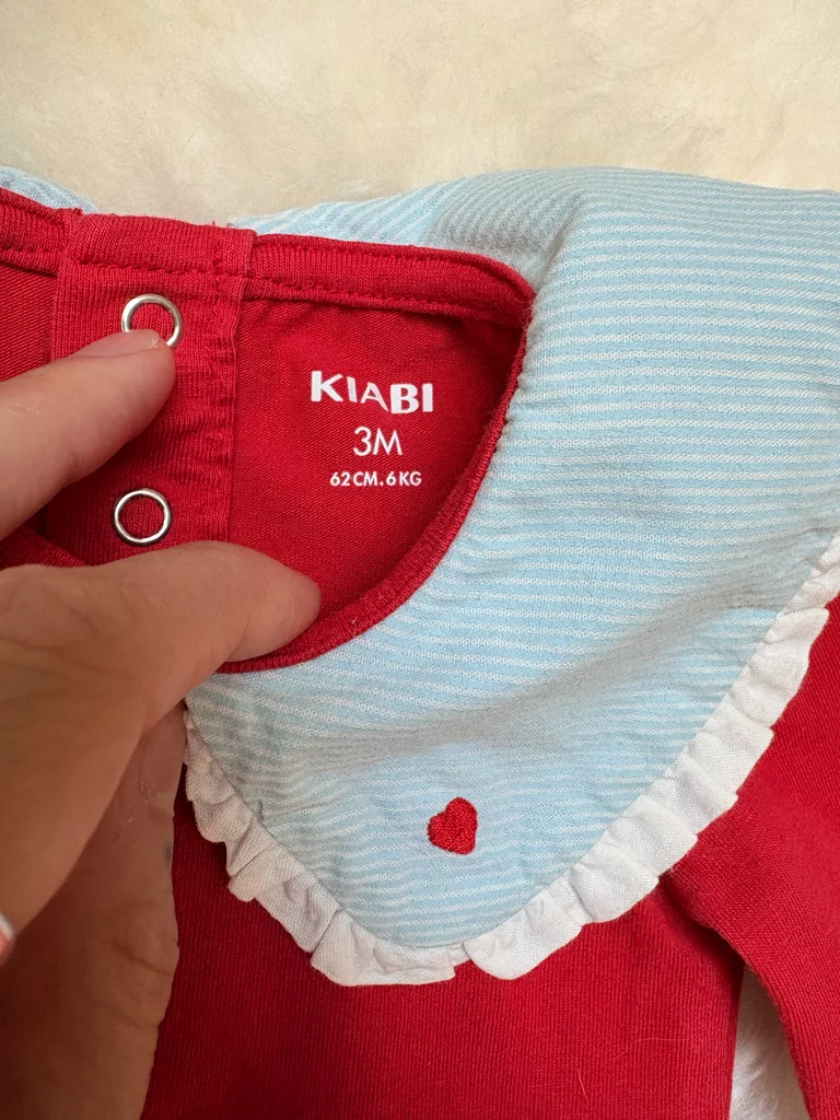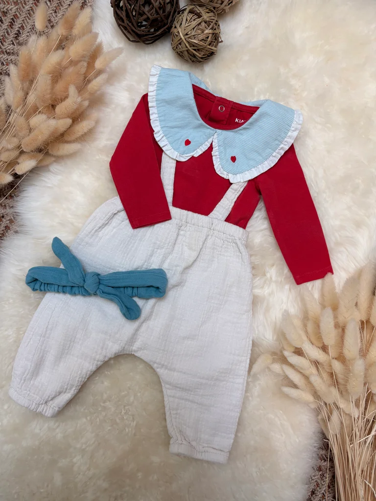 Body rouge avec un gros col Claudine Salopette en gaze de coton beige Bandeau bleu sans étiquette Kiabi 3 mois Très bon état