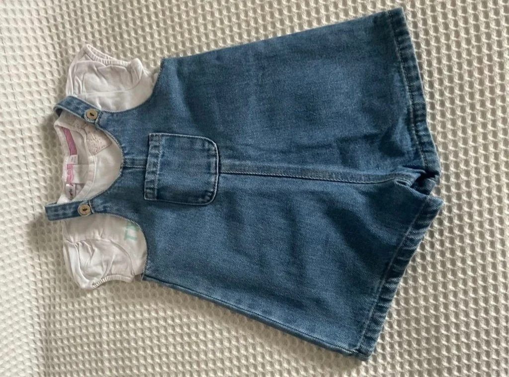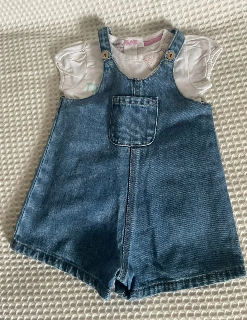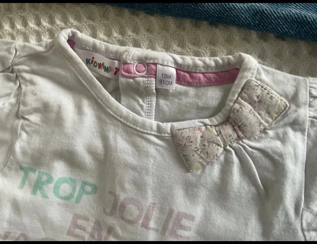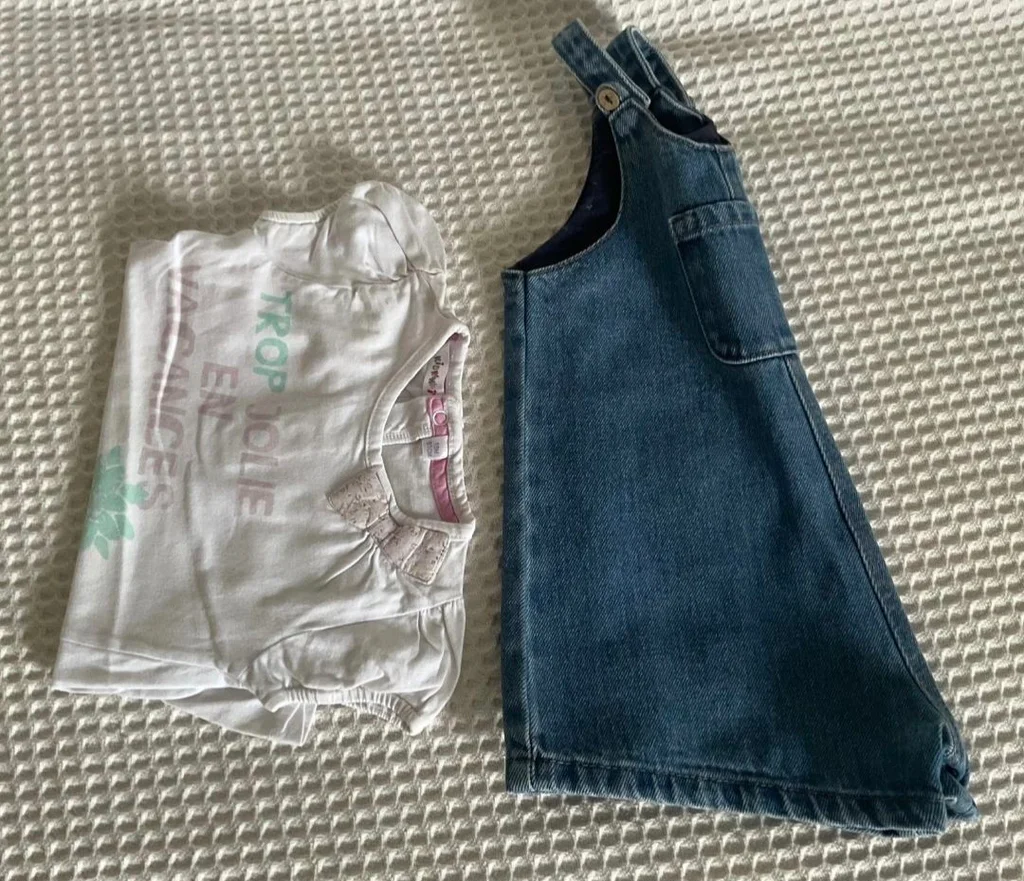 Magnifique lot Kiabi, parfait pour les beaux jours ! La Salopette : En jean bleu (coton recyclé "Éco-conception"), coupe short avec une petite poche sur le devant. Bretelles ajustables avec boutons aspect bois. Taille 24 mois (86 cm). Le Tee-shirt : Blanc avec l'inscription "Trop jolie en vacances", petites manches ballons et un joli nœud fleuri en relief au col. Ouverture pressions au dos pour un habillage facile. Taille 18 mois (81 cm) – taille grand, idéal avec la salopette. Très bon état. Décontracté et craquant pour l'été.