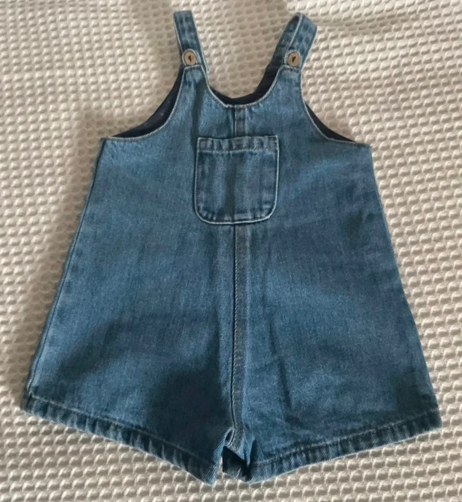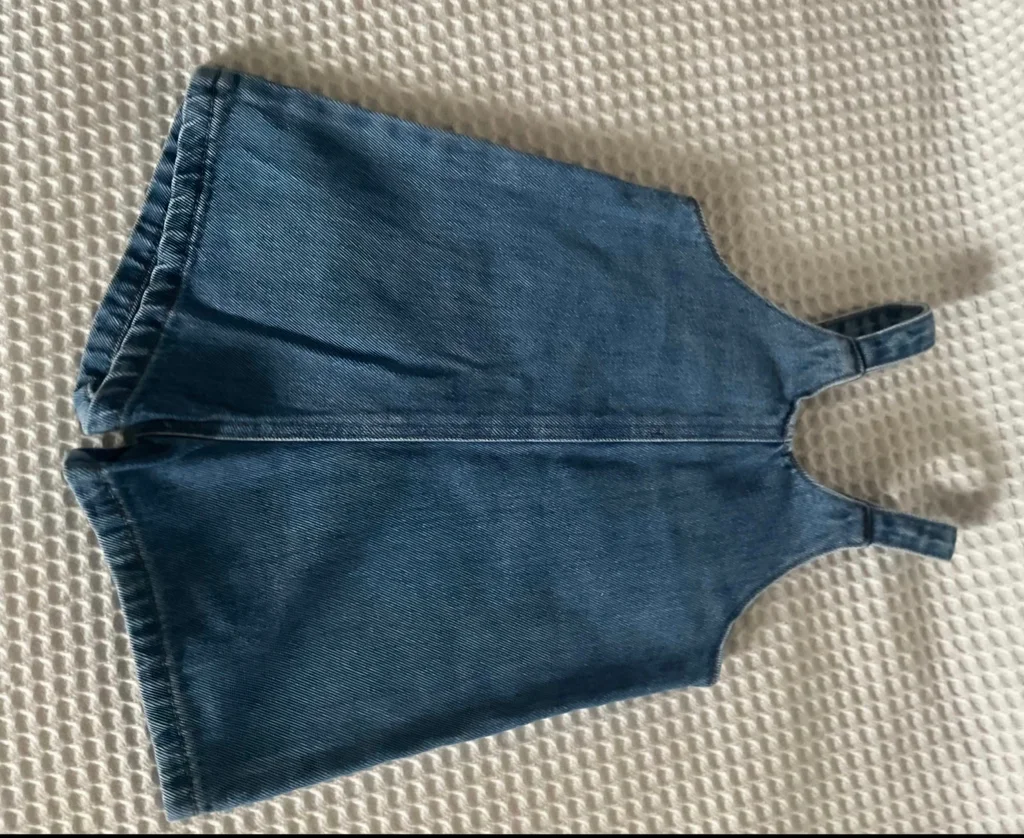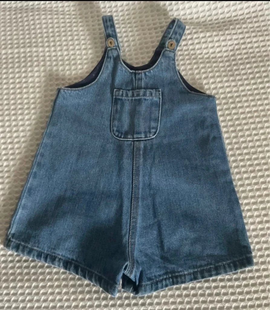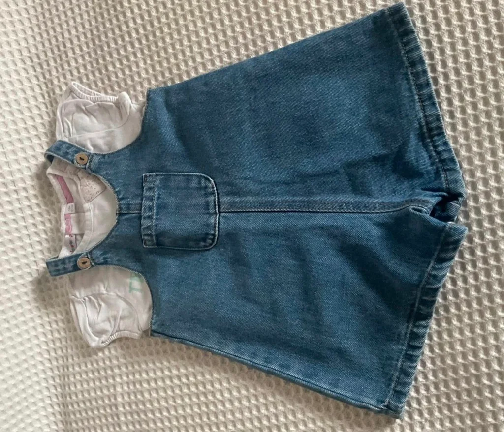 Magnifique lot Kiabi, parfait pour les beaux jours ! La Salopette : En jean bleu (coton recyclé "Éco-conception"), coupe short avec une petite poche sur le devant. Bretelles ajustables avec boutons aspect bois. Taille 24 mois (86 cm). Le Tee-shirt : Blanc avec l'inscription "Trop jolie en vacances", petites manches ballons et un joli nœud fleuri en relief au col. Ouverture pressions au dos pour un habillage facile. Taille 18 mois (81 cm) – taille grand, idéal avec la salopette. Très bon état. Décontracté et craquant pour l'été.