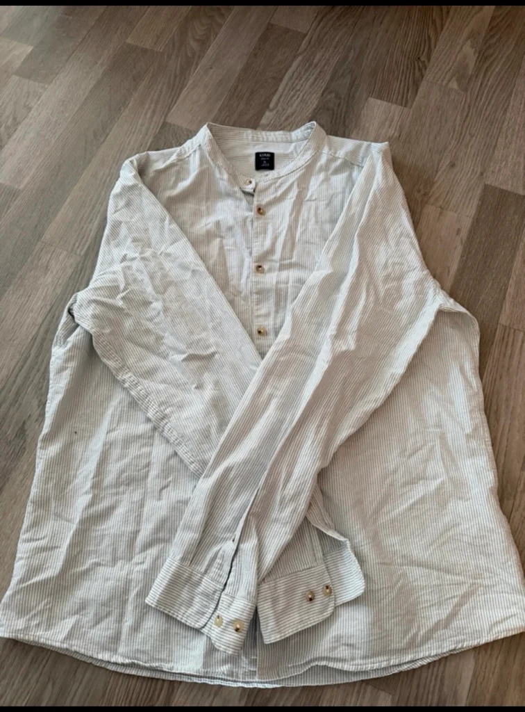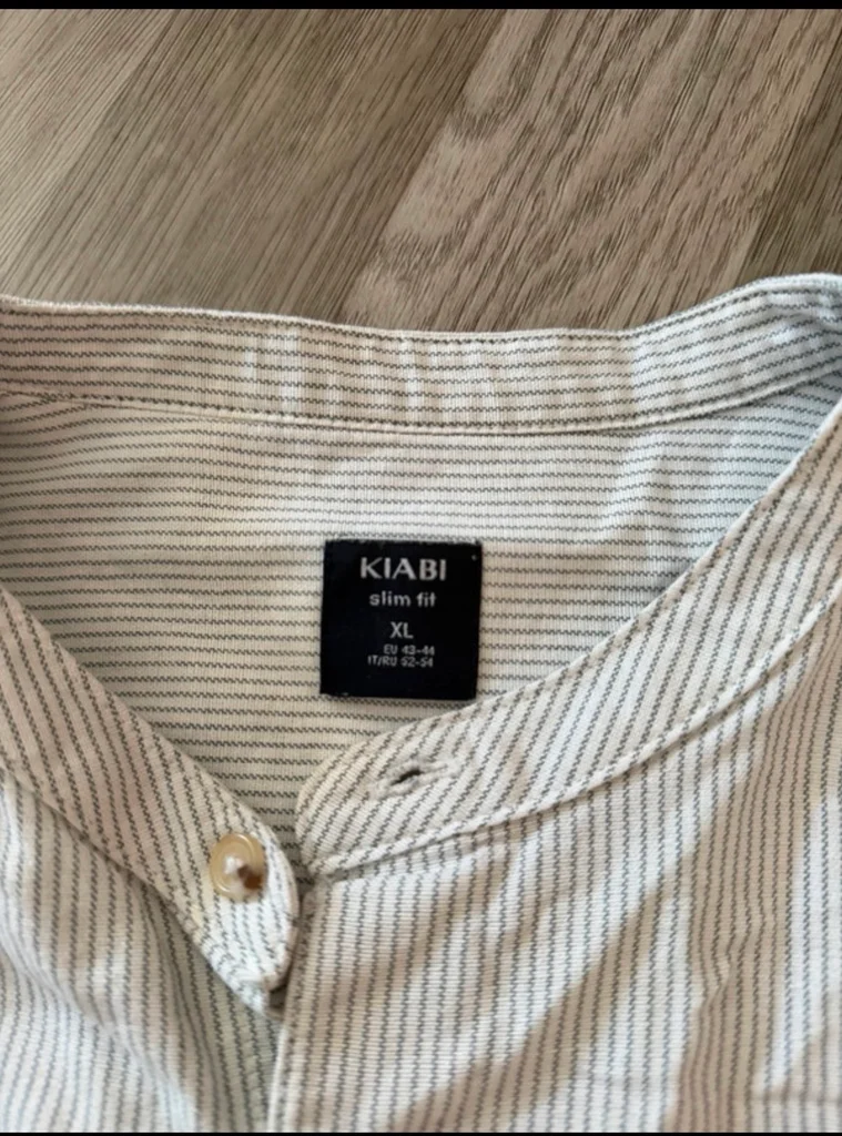Chemise Kiabi slim fit en taille XL Style col mao (sans col classique) = look moderne 🔥 🤍 Couleur : blanc/beige rayures fines (très propre) 👔 Col mao (effet minimaliste tendance) 🧵 Tissu léger et agréable à porter 📏 Taille XL – coupe slim ✔️ Bon état général (voir photos) ⚠️ Non repassée sur les photos, mais rendra nickel après repassage 👌 ⸻ 💡 Idéal pour : * tenue casual chic * printemps / été ☀️ * look simple mais stylé ⸻ 🚀 Envoi rapide