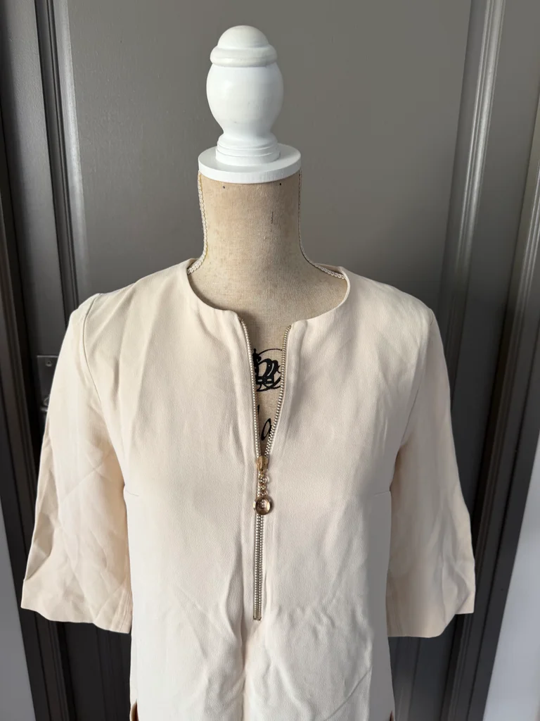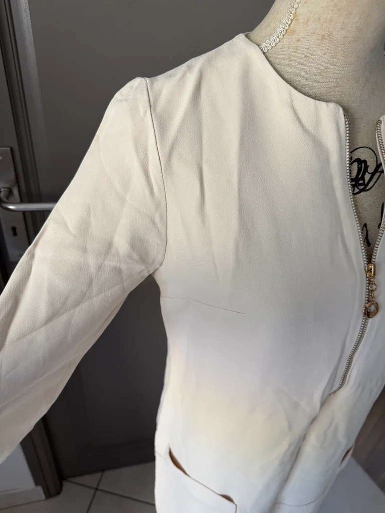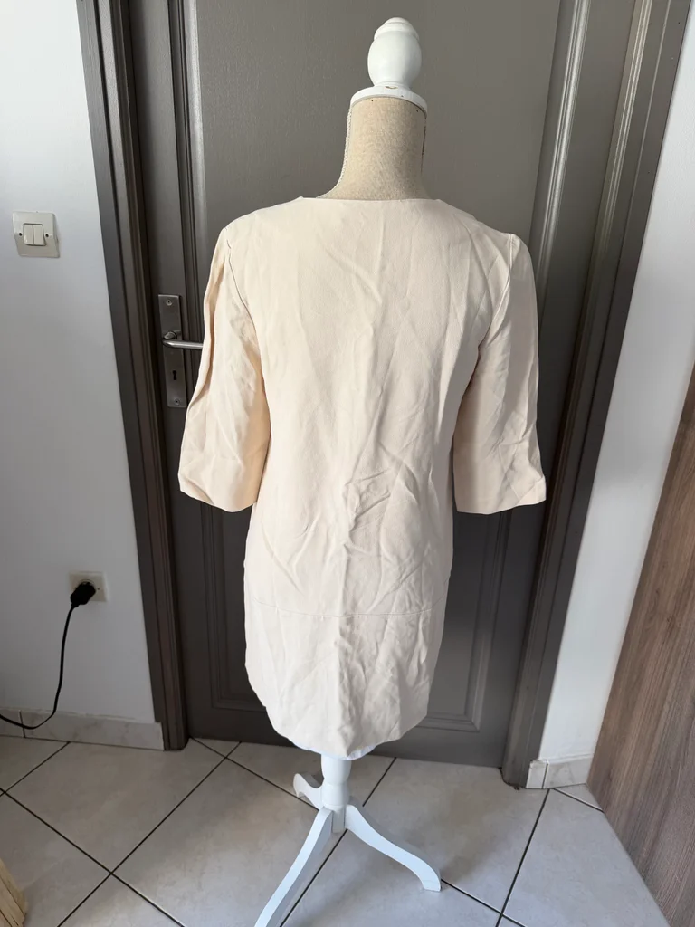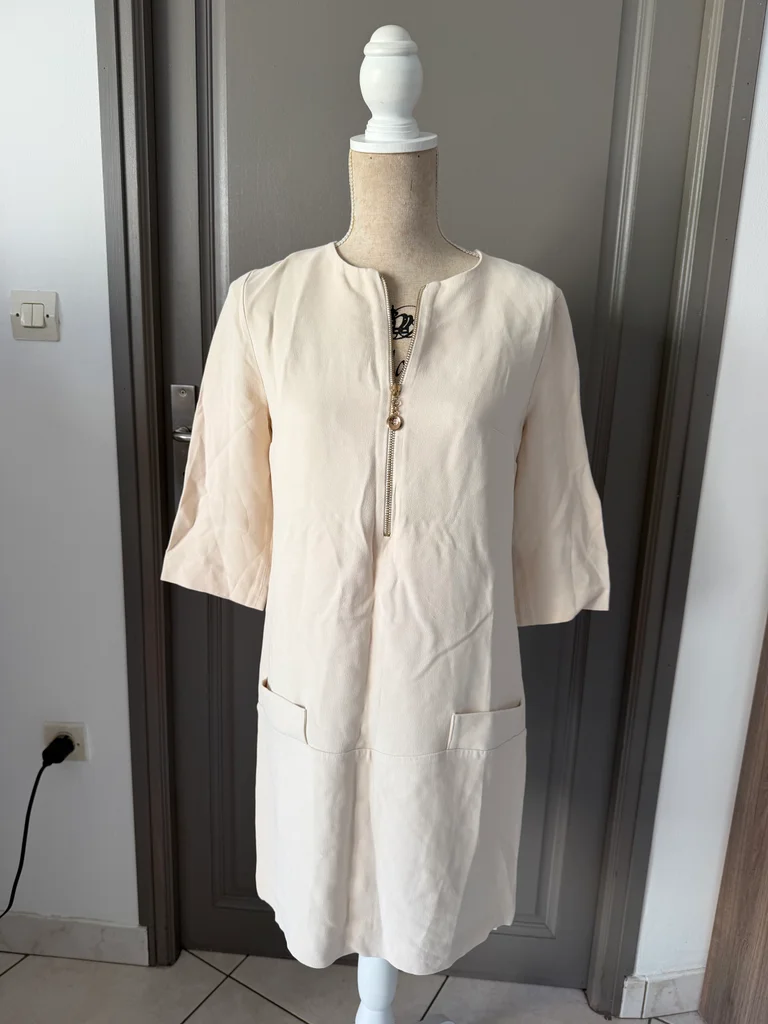 Je vends cette robe chic et légère, parfaite pour la saison printemps-été. Une pièce intemporelle aux teintes neutres qui s'adapte à tous vos styles. - Type de produit : Robe - Univers : Femme - Taille : 38 - M - Couleur : Crème / Blanc cassé - Caractéristiques : Manches 3/4, Fermeture éclair frontale, Poches latérales, Col rond N'hésitez pas à me contacter pour plus d'informations ou de photos.