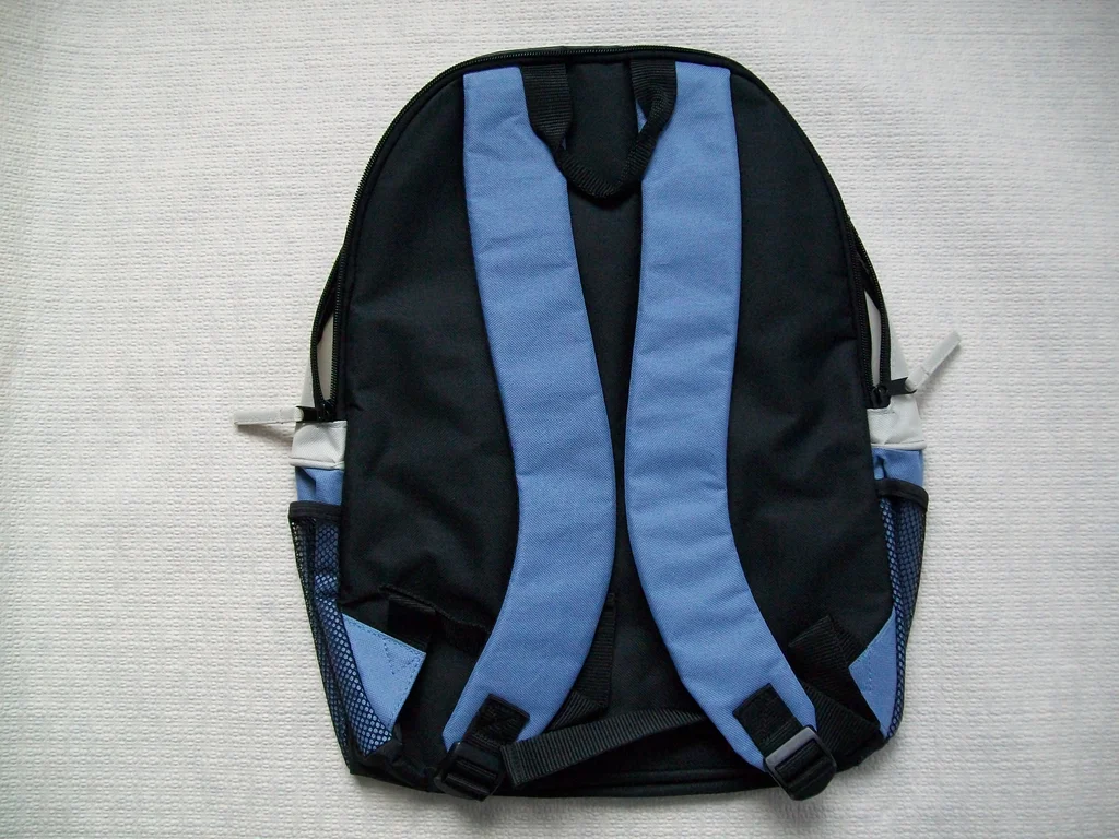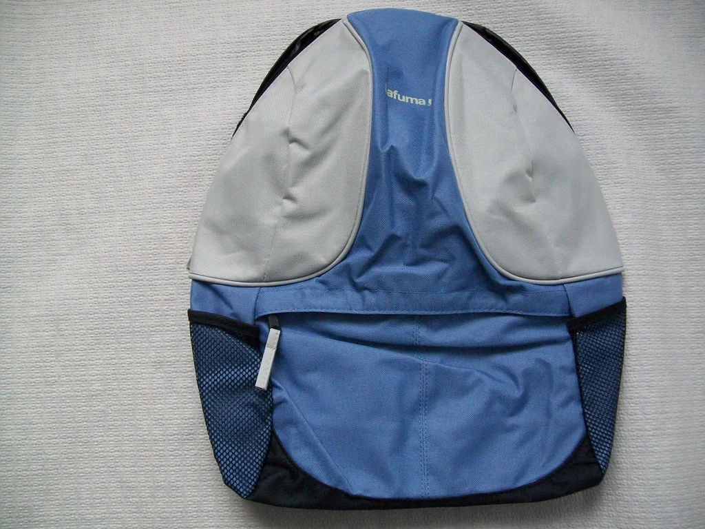 Sac à dos " LAFUMA " , bleu ciel et beige, dos noir, à bretelles larges, 100 % polyester, 42 x 30 cm, 1 poche sur le devant , 1 poche filet de chaque côté, 1 poche intérieure, * Article Neuf n'ayant jamais servi. Possibilité d'envoi.