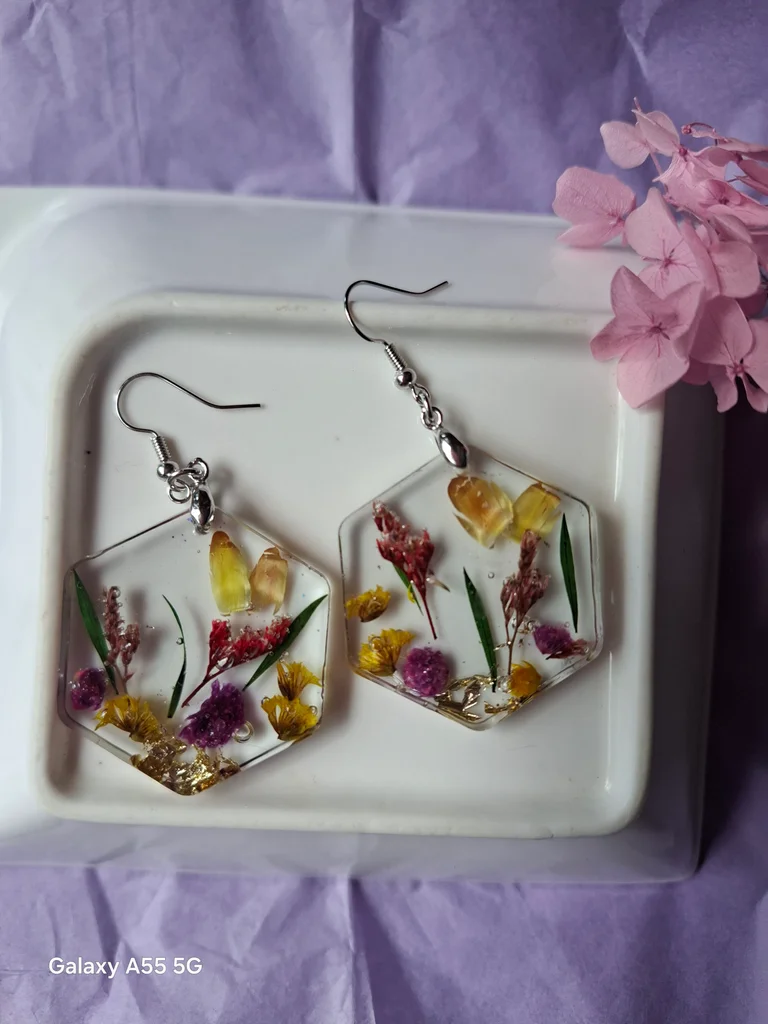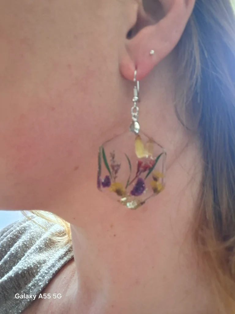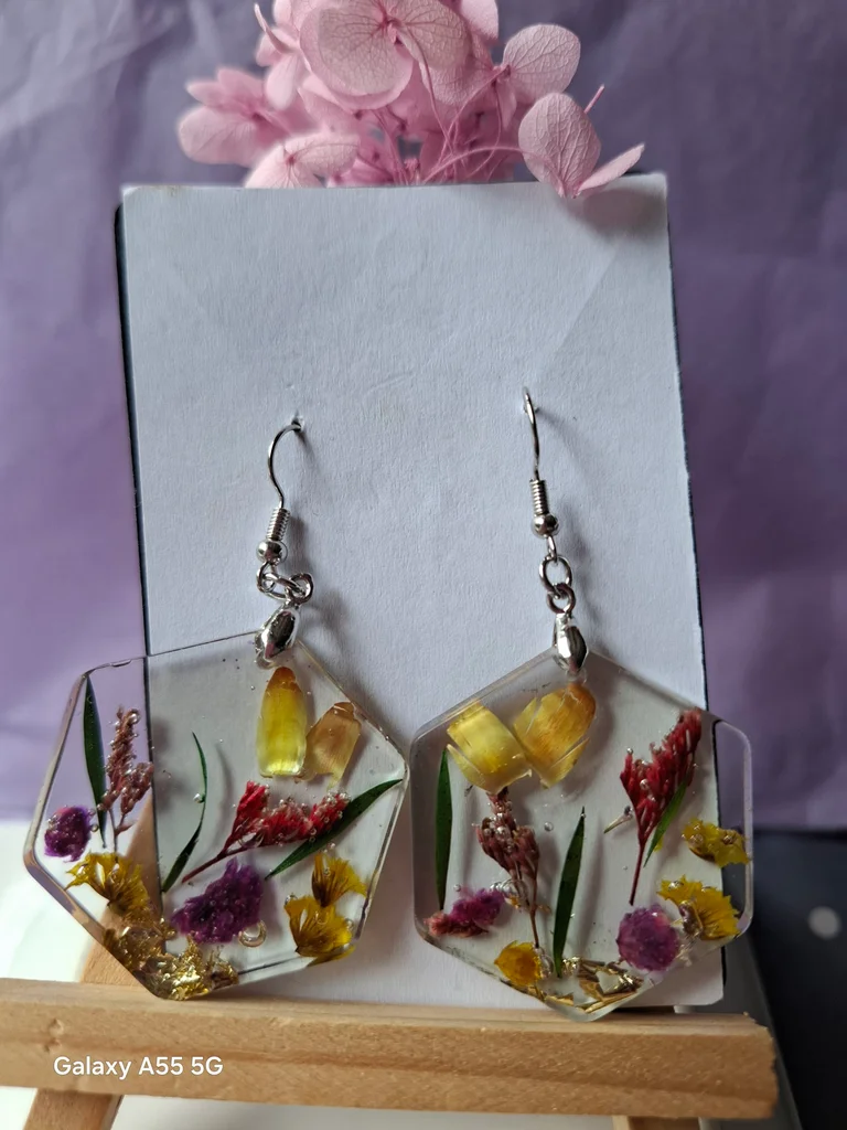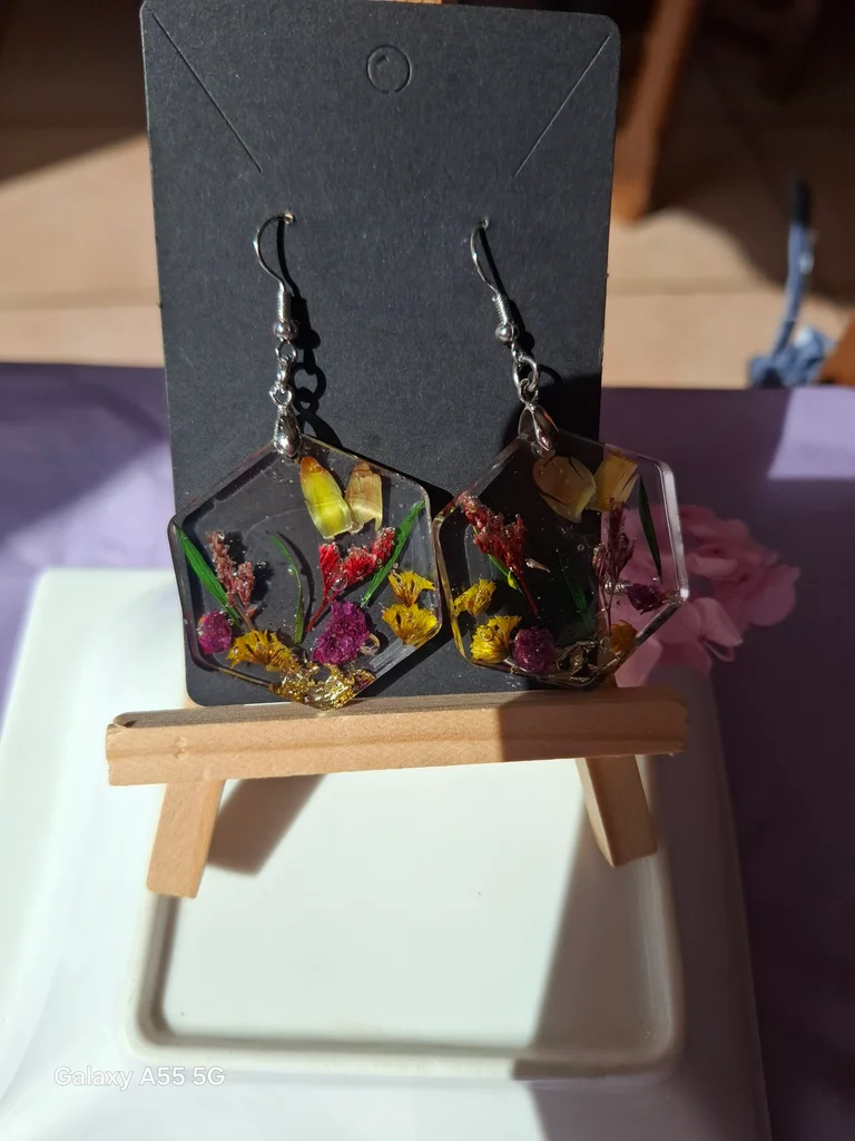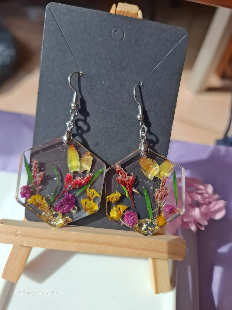 Comme un petit jardin sauvage figé dans le cristal… délicat, coloré et poétique 🌿💛 🌸 Ces boucles d’oreilles artisanales capturent la beauté simple et lumineuse des fleurs des champs dans une résine transparente éclatante ✨