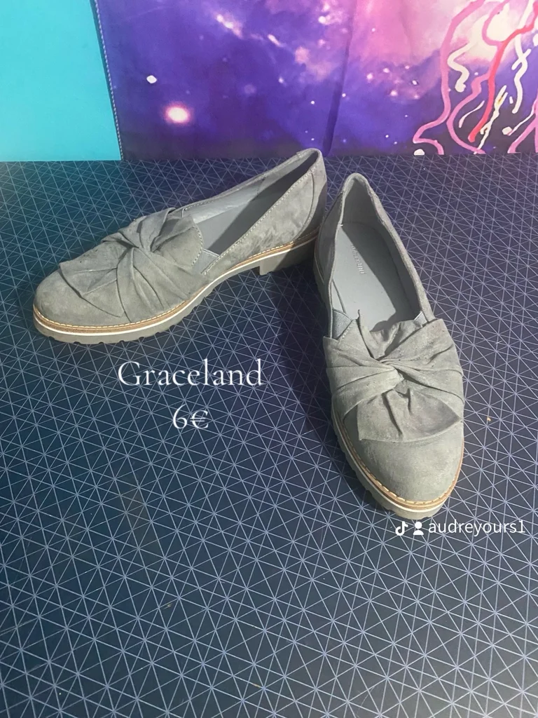 Mocassins Graceland – Taille 41 – Élégance raffinée Sublimes mocassins Graceland en suédine gris délicat, alliant parfaitement raffinement et confort ✨ Leur design épuré est rehaussé par un élégant détail noué sur le dessus, apportant une touche sophistiquée à toutes vos tenues. Une pièce intemporelle idéale pour une allure chic au quotidien, que ce soit avec un pantalon structuré ou une tenue plus casual. ✔️ Taille : 41 ✔️ Marque : Graceland ✔️ Matière : effet suédine douce ✔️ Couleur : gris élégant ✔️ État : très bon état Chaussures confortables, finitions soignées, parfaites pour un style distingué sans effort 💫