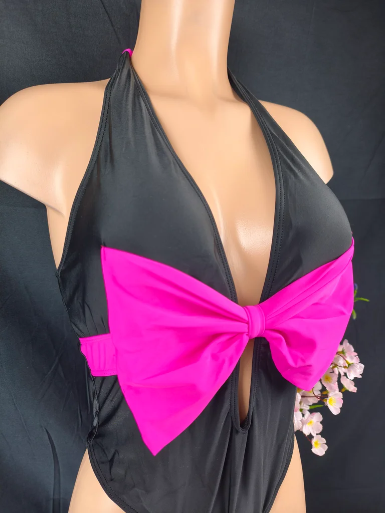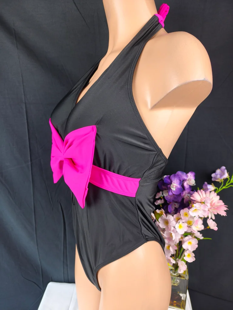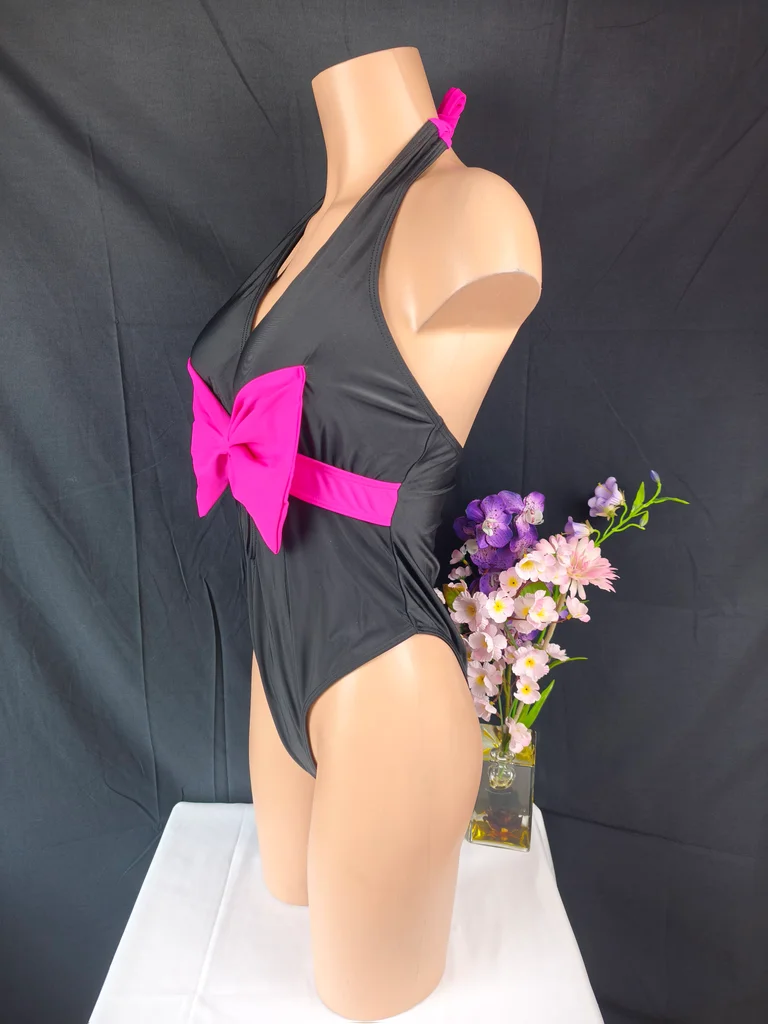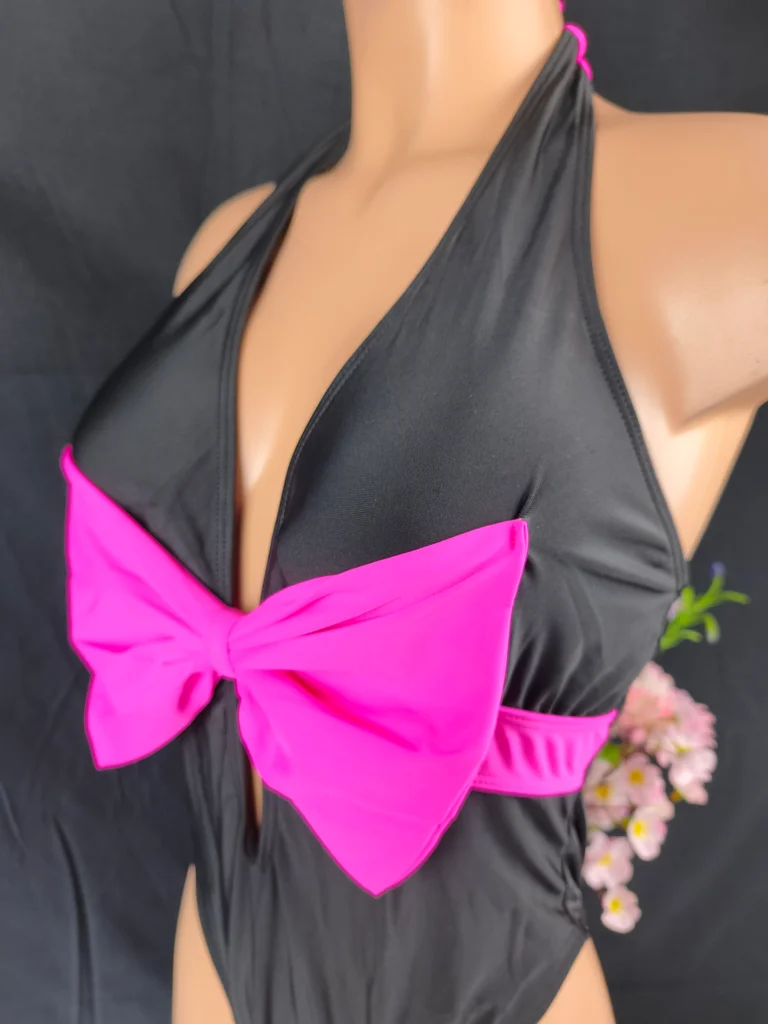 Faites sensation cet été avec ce superbe maillot de bain une pièce au design audacieux et ultra féminin ! Une pièce originale qui ne passe clairement pas inaperçue. Couleur noir intemporel avec grand nœud rose fuchsia flashy, en matière extensible, doux et confortable. Décolleté plongeant très flatteur, orné d'un magnifique nœud oversize sur le devant ! Attache autour du cou (style dos nu) pour un maintien ajustable. Coupe échancrée qui allonge la silhouette et dos dégagé pour une touche sexy et élégante. Ce maillot incarne parfaitement le mélange entre chic et glamour. Le contraste noir / fuchsia apporte une touche moderne et fashion, idéale pour se démarquer à la plage ou à la piscine. Design unique avec nœud XXL très tendance, il met en valeur le décolleté et la silhouette. Idéal pour bronzer avec style ! Taille L 40 mais convient aussi à une taille M 38, état impeccable, jamais porté, photos conformes à l'article vendu. Livraison rapide et soignée. #maillotdebain #maill [Description tronquée]