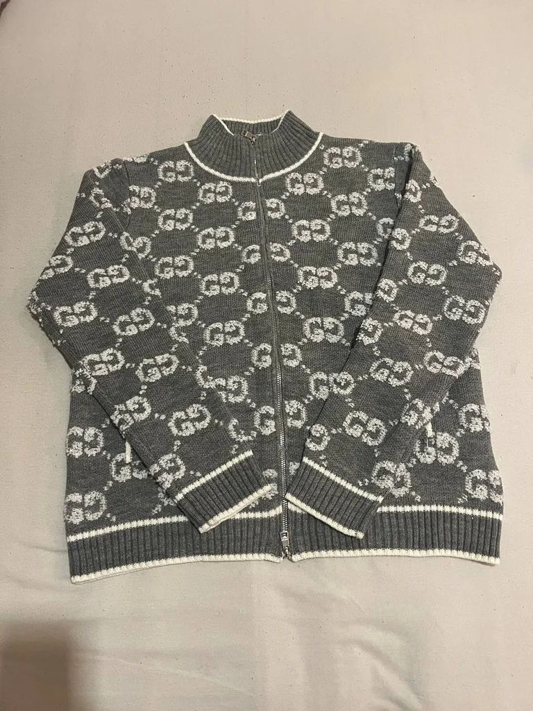 Gucci – Cardigan zippé GG Monogram Coloris : Gris / Blanc Maille jacquard GG monogramme all-over Col montant zippé Fermeture zip centrale argentée Bords côtelés blanc cassé Motif GG Gucci iconique 🔥 Taille : [à compléter] État : Très