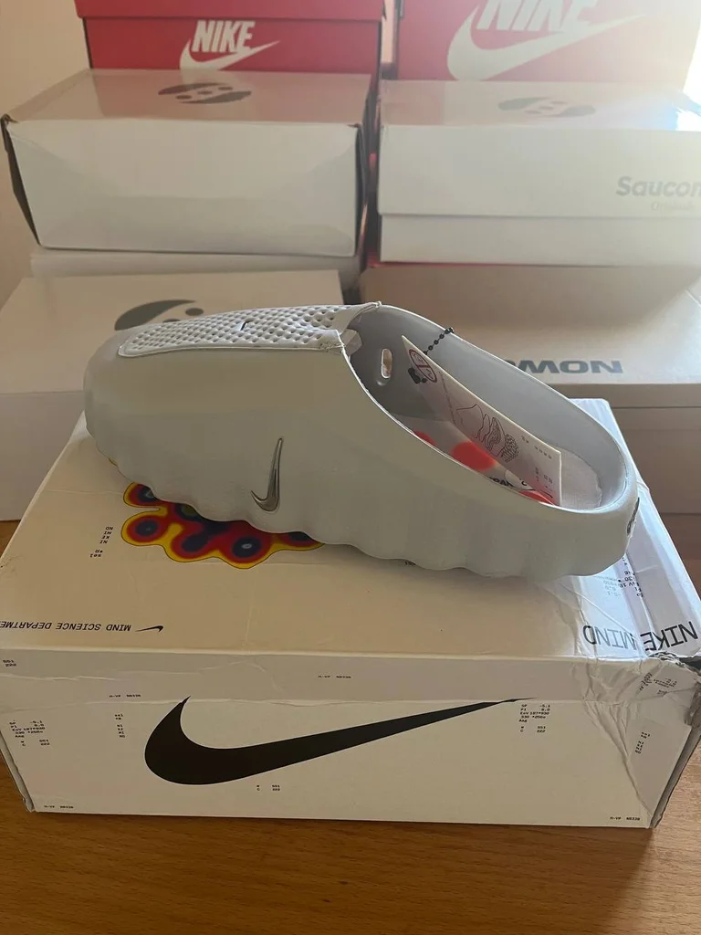 Nike CALM Mule – Light Bone / Grey Pointure : à préciser Upper perforé blanc/gris Swoosh argenté embossé Semelle mousse chunky sculptée Design mule fermée avant Boîte Nike Mind Science Dept édition spéciale 📦 Étiquette attachée 🏷️ NEUF avec boîte ✅ Coloris light bone ultra clean 🤍 Modèle très rare & hype 🔥
