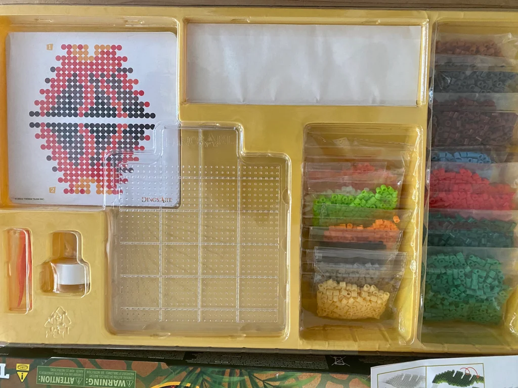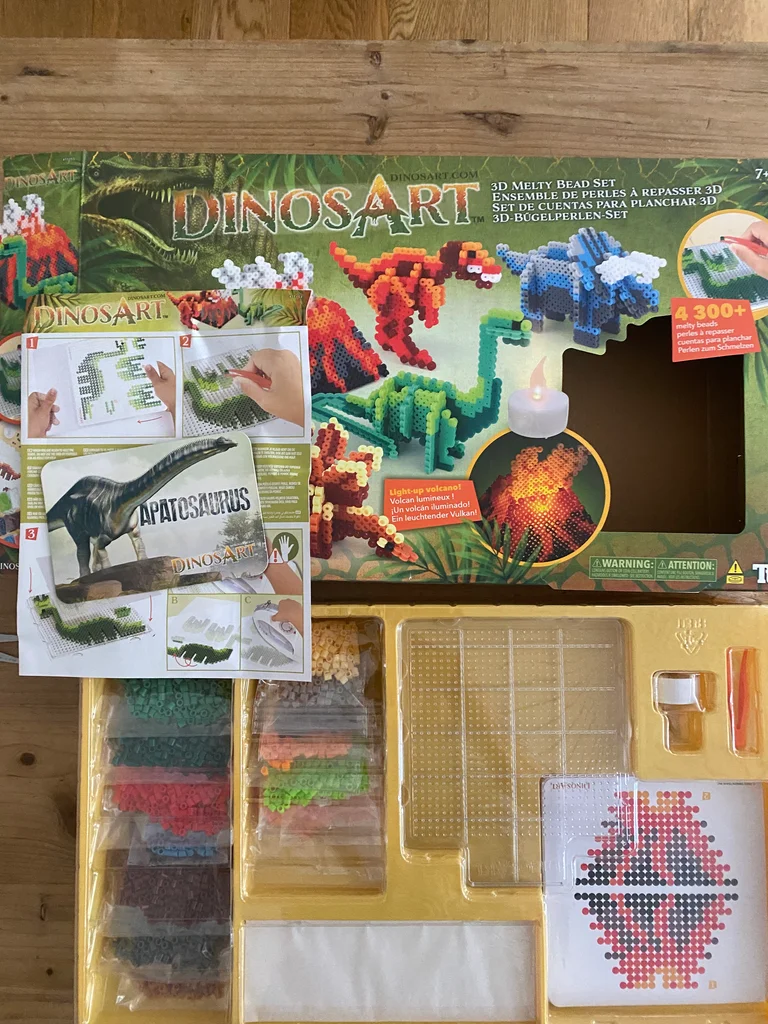 Ki loisir créatif pour enfants, réalisation de perles à repasser sur le thème des dinosaures jamais utilisé, mon fils n’a pas adhéré juste un sachet ouvert