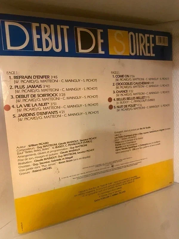 "Début de soirée" est un groupe de dance-pop française, originaire de Provence-Alpes-Côte d'Azur. Entre 1988 et 2011, il est composé de Sacha Goëller, directeur d'antenne d’une radio locale à Marseille et William Picard, DJ dans un club de la région d'Aix-en-Provence. Le groupe connait un énorme succès en 1988 avec le titre "Nuit de folie". En 2011, les membres, à la suite de désaccords, décident de se séparer et de continuer leurs carrières respectives chacun de leurs côtés. Label:CBS – 465206 1 Format:Vinyle, LP, Album, Stereo Pays:France Sortie:1989 Genre:Electronic, Pop Style:Europop, Synth-pop, Disco Etat: Pochette VG+, disque VG+ Envoi rapide et soigné