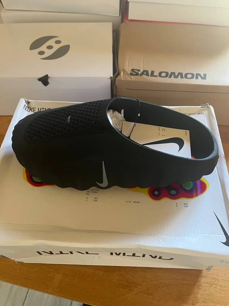 Nike CALM Mule – Triple Black Pointure : 43 Upper perforé full black Swoosh gris argenté embossé Sangle noire intérieure Swoosh blanc Semelle mousse chunky sculptée noire Boîte Nike Mind Science Dept 📦 Étiquette chaîne attachée 🏷️ NEUF avec boîte ✅ Coloris triple black ultra rare 🖤 Modèle hype & limité 🔥