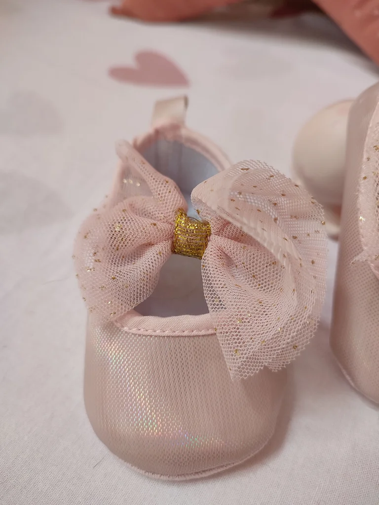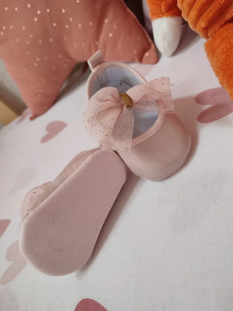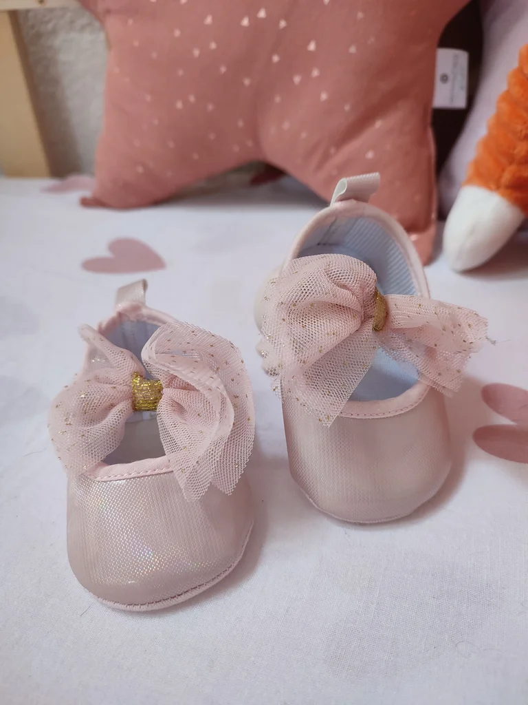 🌸 Adorables ballerines/Chaussures pour bébé fille. 🌸 Couleur rose pâle avec un joli nœud papillon en tulle sur le dessus. 🌸Très bon état, très peu portées. 🌸 Parfaites pour une tenue chic ou une occasion spéciale (baptême, anniversaire, séance photo, etc.). 🌸 Souples et confortables pour les petits pieds de bébé. 🌸 Taille 16. 🌸 N'hésitez pas à aller faire un tour sur mon dressing, pleins d'articles bébé/enfant. 🌸 🌸 Pour mieux vous y retrouver, mon dressing est trié par # dans la partie "A propos". 🌸