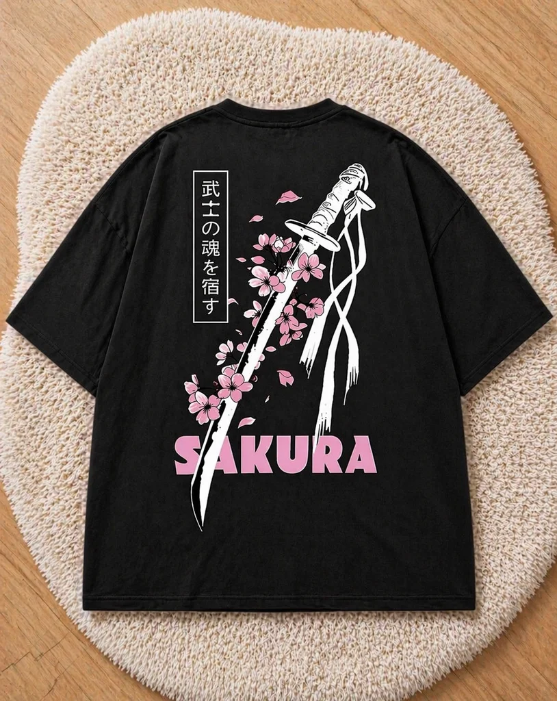 T-shirt noir style streetwear avec imprimé sakura + katana japonais Design tendance et original, partait pour un look urbain / casual. Etat : jamais porté n9f Taille : L (coupe oversize) Couleur: noir avec imprimé rose et blanc Matière : 100% coton (confortable et respirant) Le devant est simple et épuré, et le dos a un gros visuel stylé qui attire direct Idéal pour outfit streetwear, été, ou layering ou fan de manga Envoi sous 12h et soigné