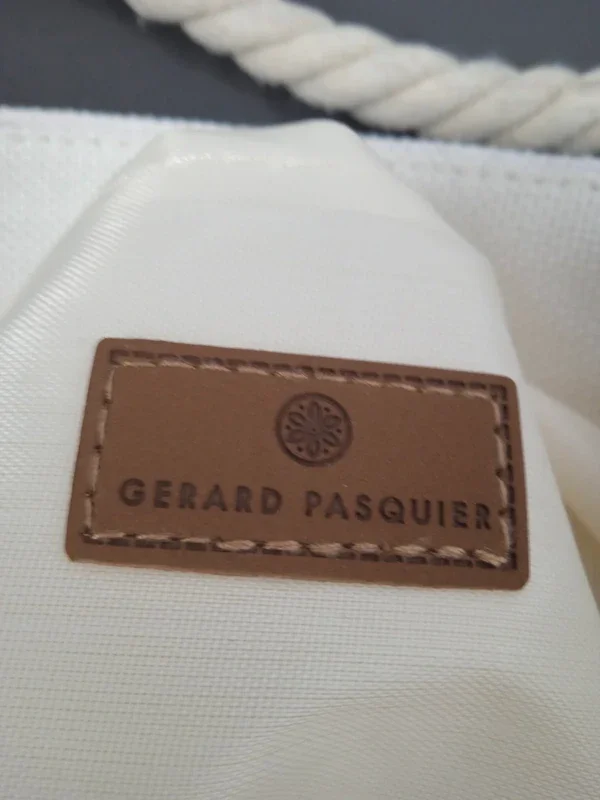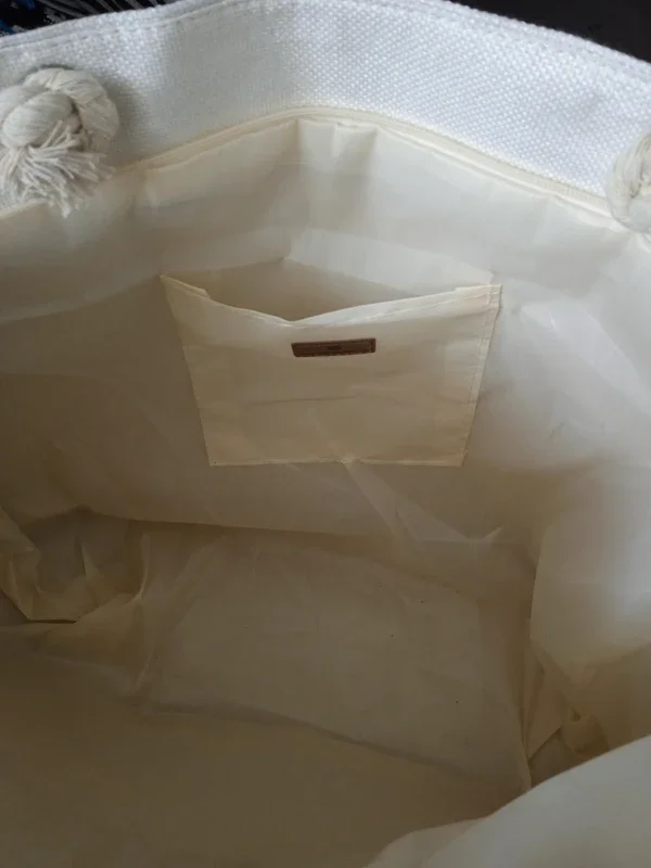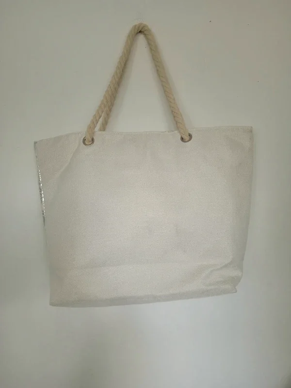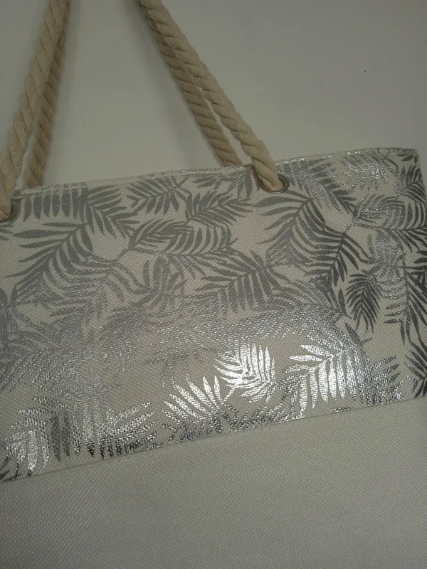 Grand sac style sac de plage beige haut gris brillant déco palmier, imperméable plastifié a l'intérieur très bon état marque Gérard pasquier #grandsac #sacdeplage #grandsacdeplage #sacgerardpasquier #sacbeigegerardpasquier