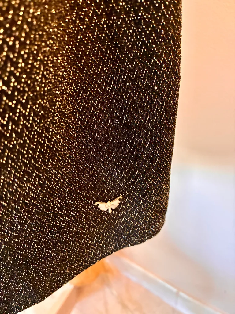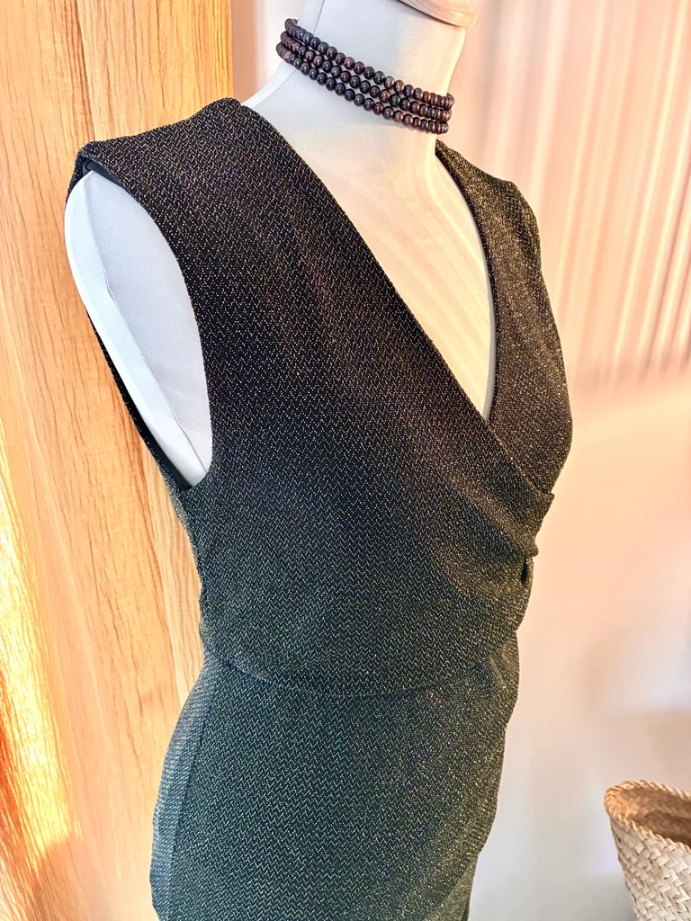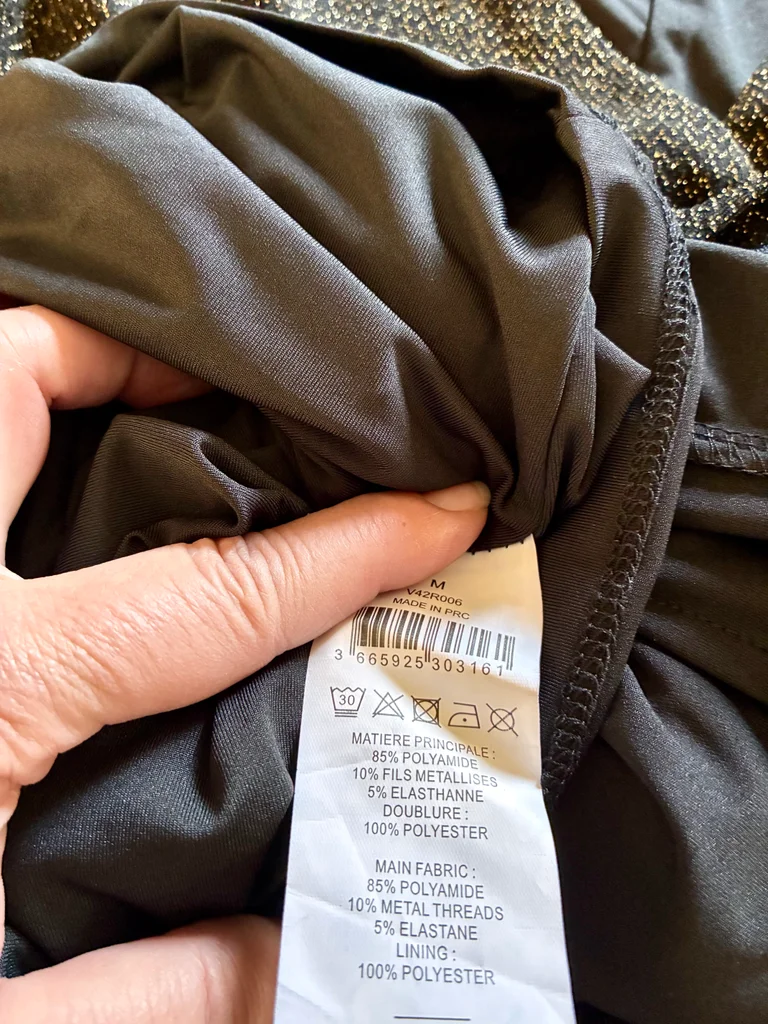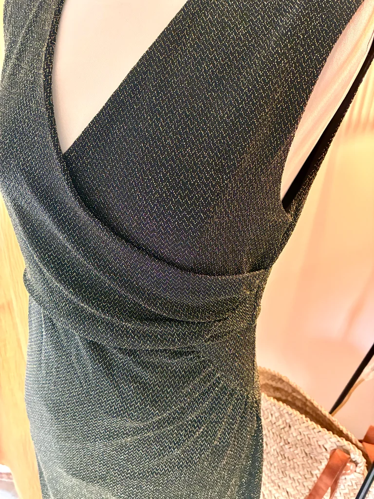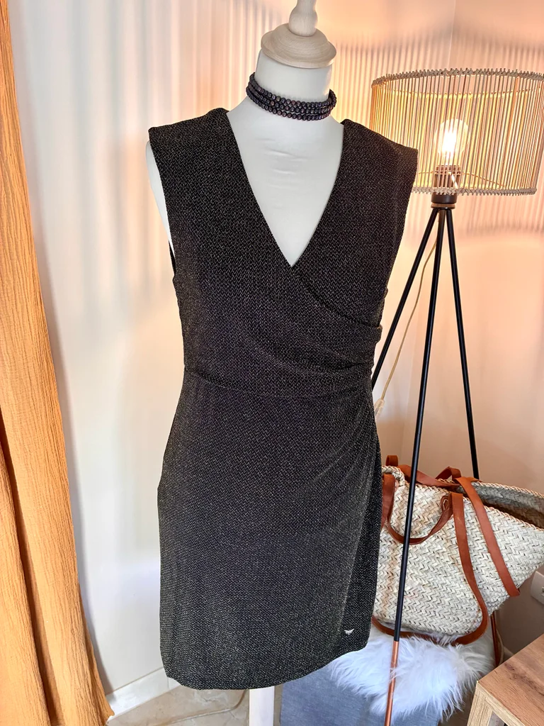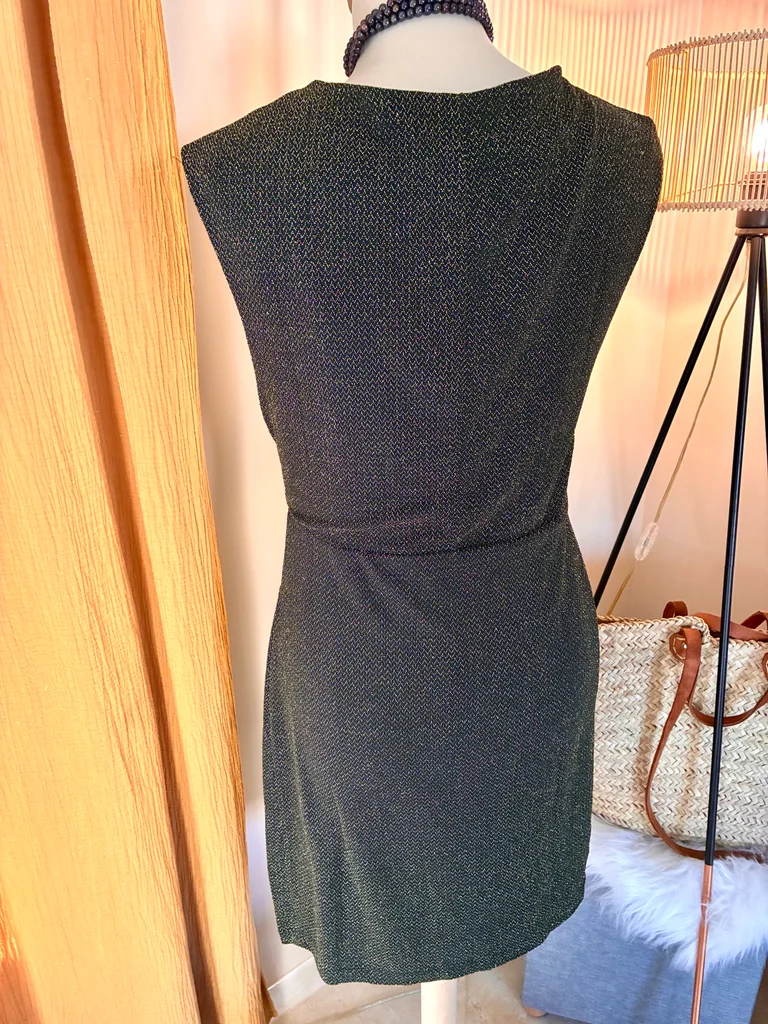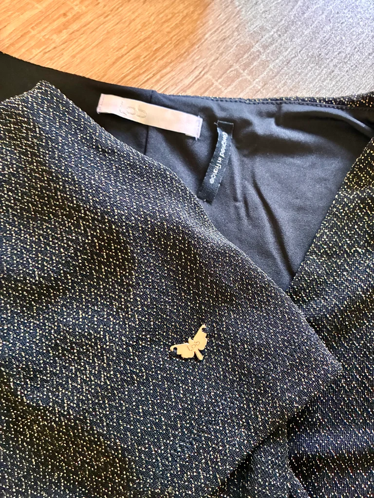 Robe Scintillante LPB – Coupe Drapée (Neuve) Vends robe de la marque française Les Petites Bombes (LPB). Pièce lumineuse et élégante, idéale pour un événement, un cocktail ou une sortie habillée. État & Qualité • État : Neuf (jamais portée). • Origine : Designed in France. • Finitions : Logo papillon métallique emblématique de la marque sur le bas de la robe. Design & Coupe • Silhouette : Coupe ajustée avec jeu de drapé asymétrique à la taille qui sculpte la silhouette. • Encolure : Décolleté croisé type cache-cœur en V. • Texture : Maille noire dense entrelacée de fils d’or pour un scintillement subtil et sophistiqué. Caractéristiques techniques • Taille : M (38) • Matière : Tissu stretch (élasthanne) pour un confort total et un ajustement parfait. • Entretien : Lavable à 30°C (cycle délicat recommandé). #Opla #LPB #ModeResponsable #RobeDeSoiree #LookChic #CreateurFrancais #RobeDrapée #OccasionNeuve