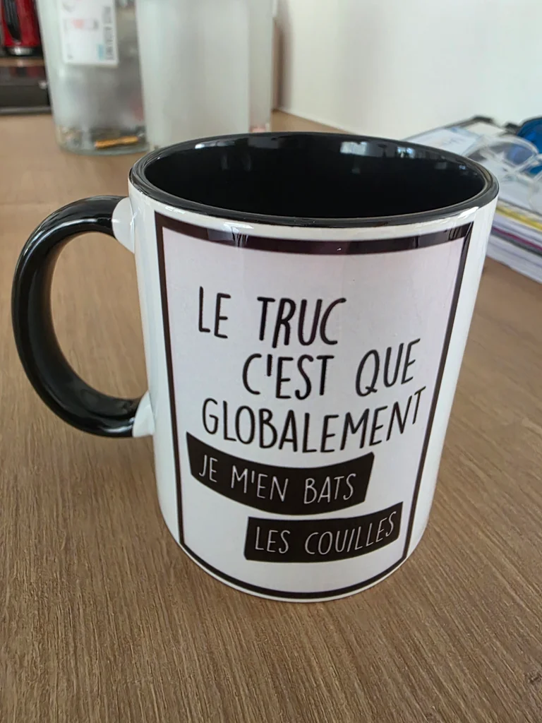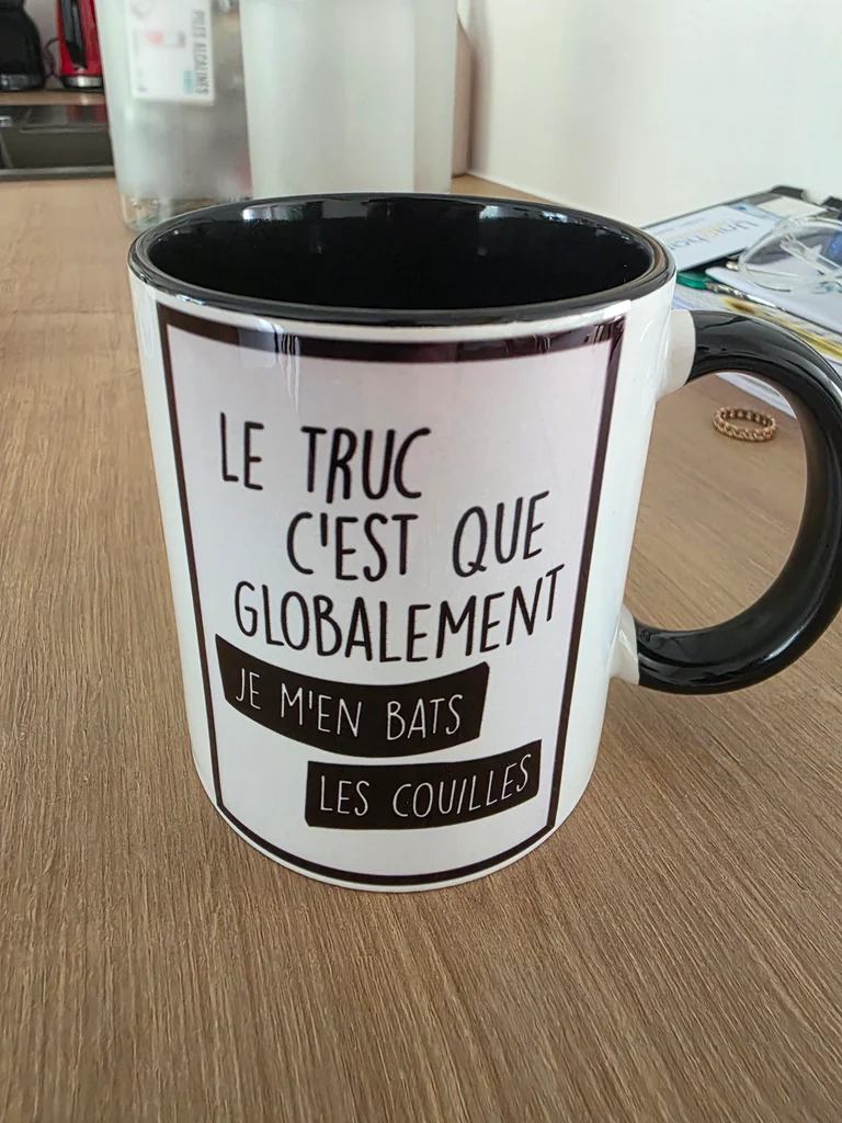 Je vends ce mug humour en céramique avec un message drôle et décalé. Parfait pour les amateurs de café ou de thé avec une touche d'humour au quotidien! - Type de produit : Mug - Matière : Céramique - Couleur : Blanc avec intérieur noir - Motif : Texte humour « Le truc c'est que globalement je m'en bats les couilles » - Anse : Noire - Contenance : Standard État neuf N'hésitez pas à me contacter pour plus d'informations ou de photos.