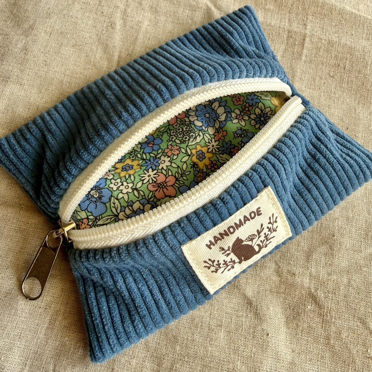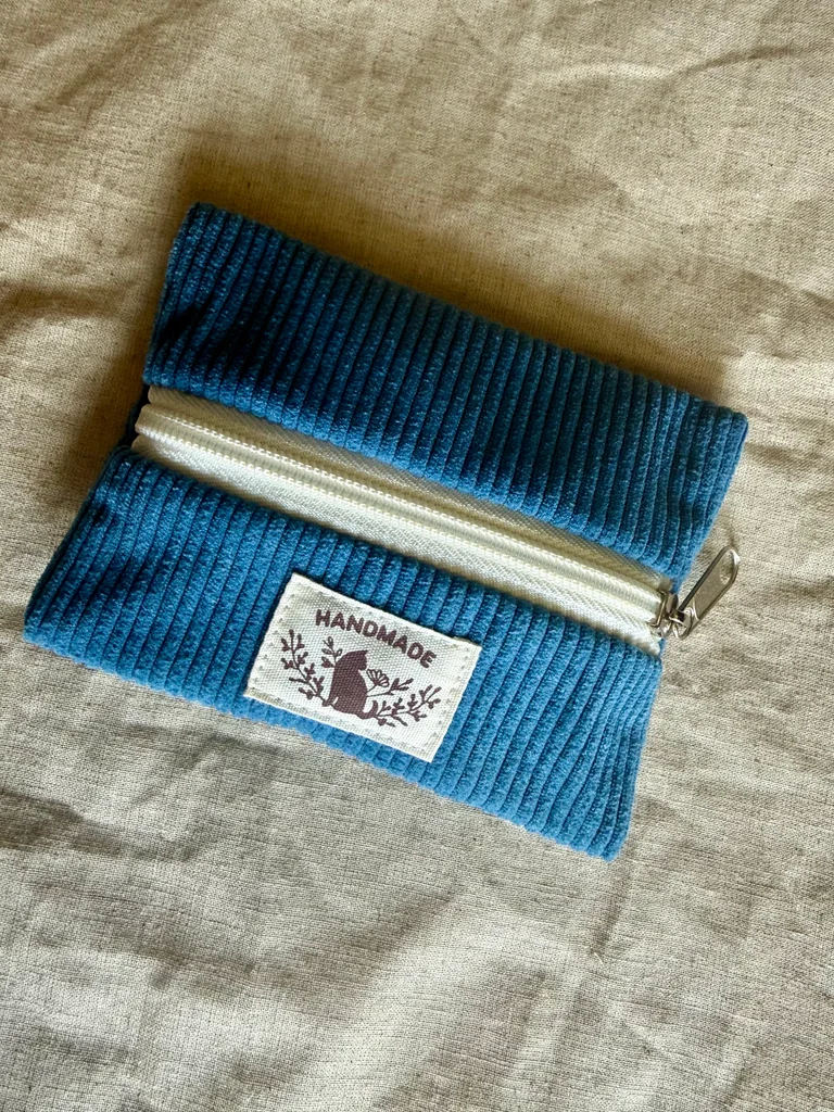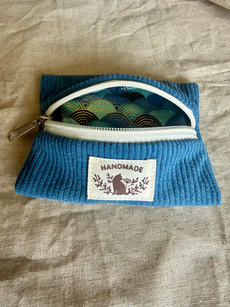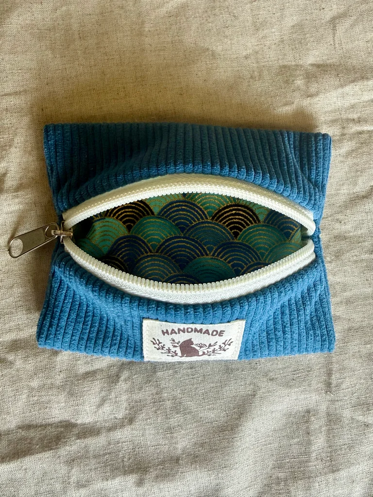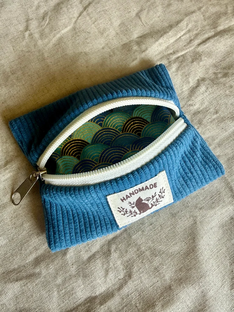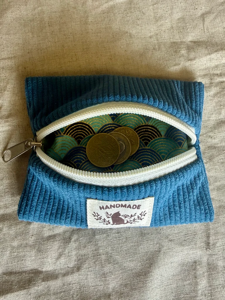 Porte monnaie en velours côtelée bleu, plat et rembourré, avec une doublure assortis. Dimension 13 x 9,5 cm Peut contenir des cartes, CB, petits bijoux. Idée cadeau