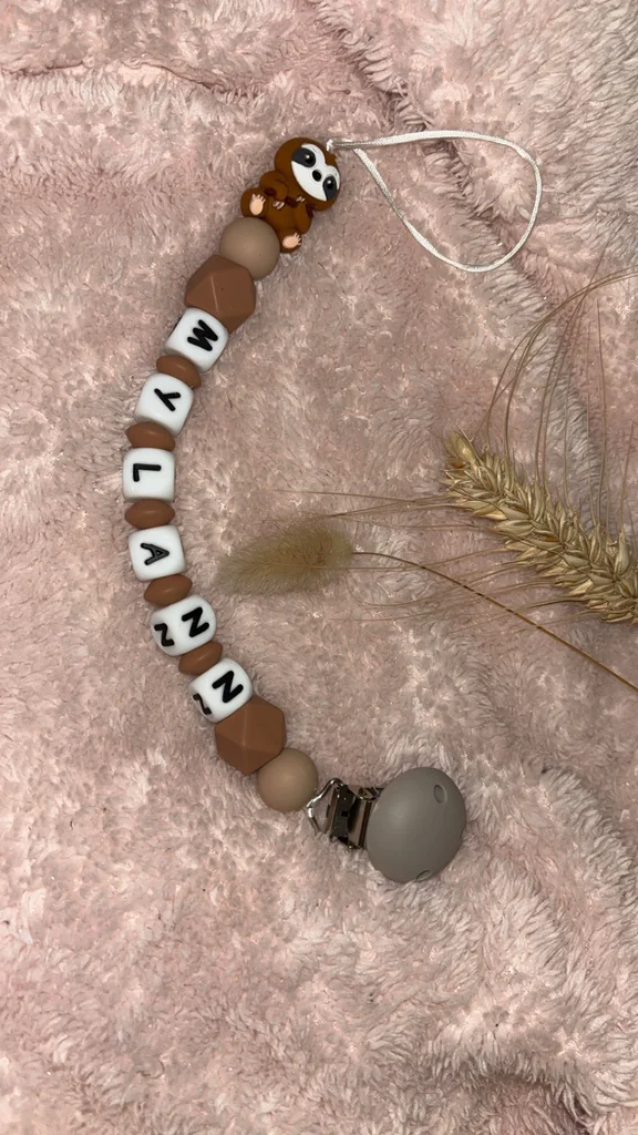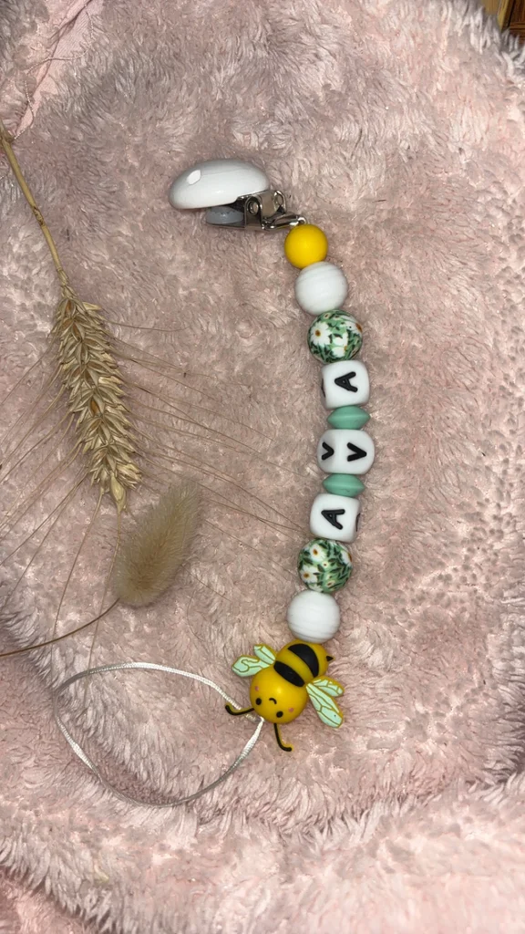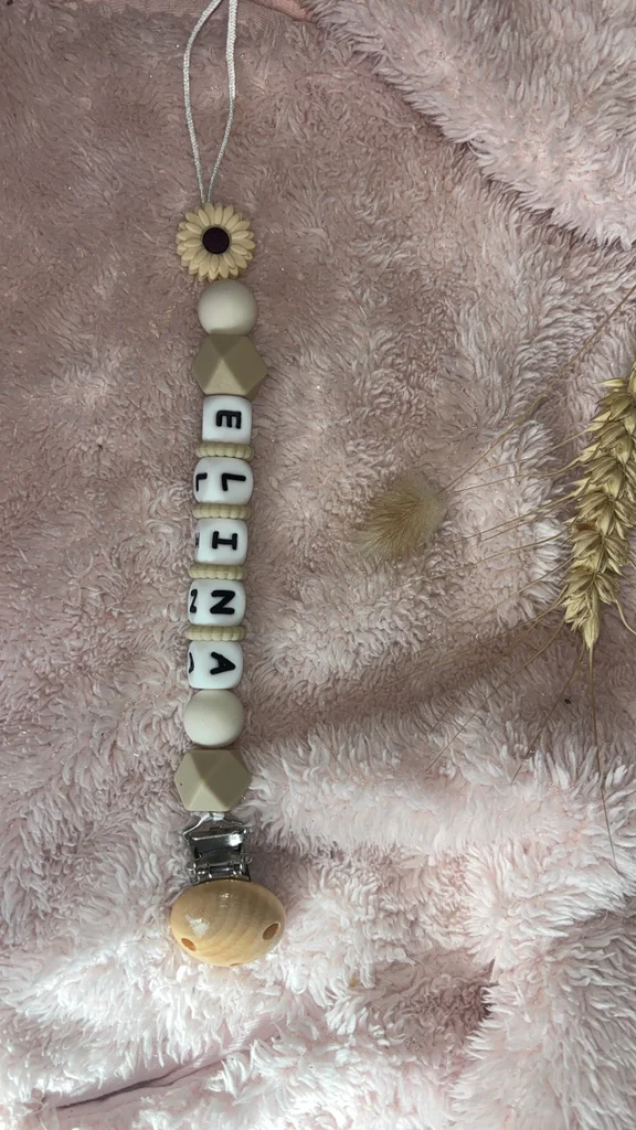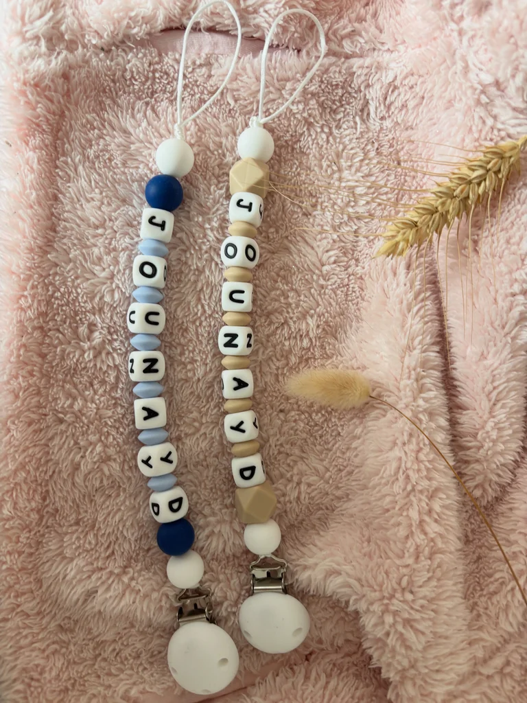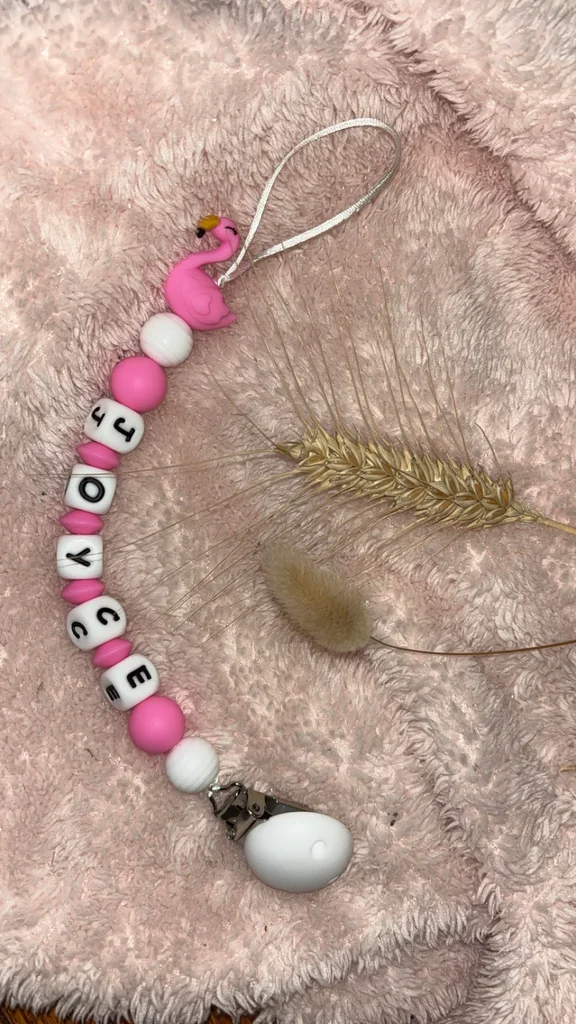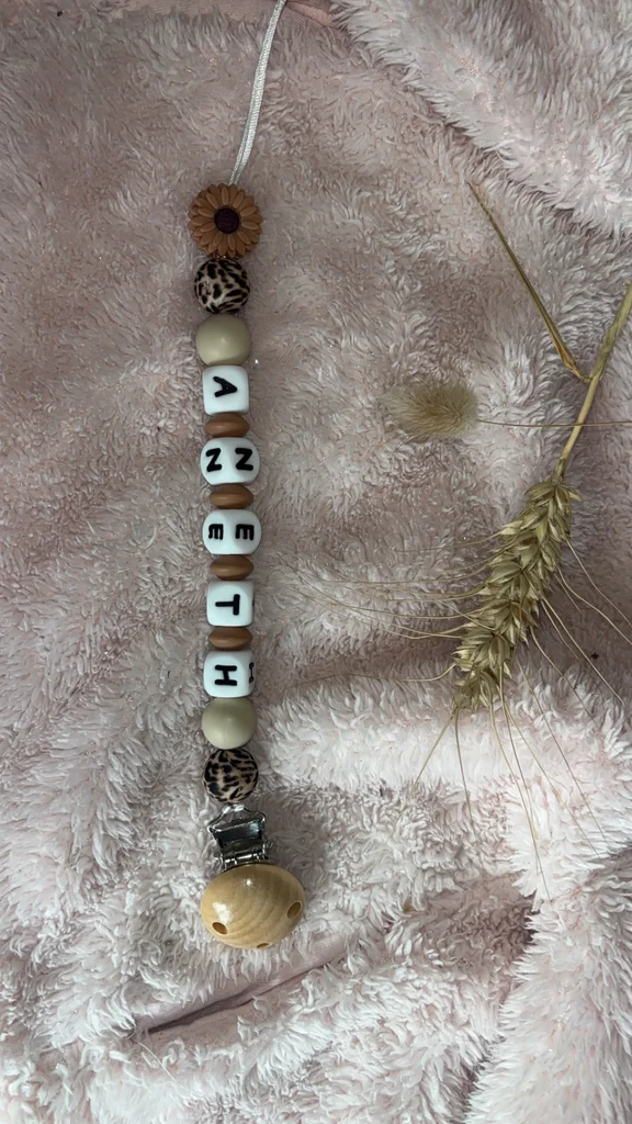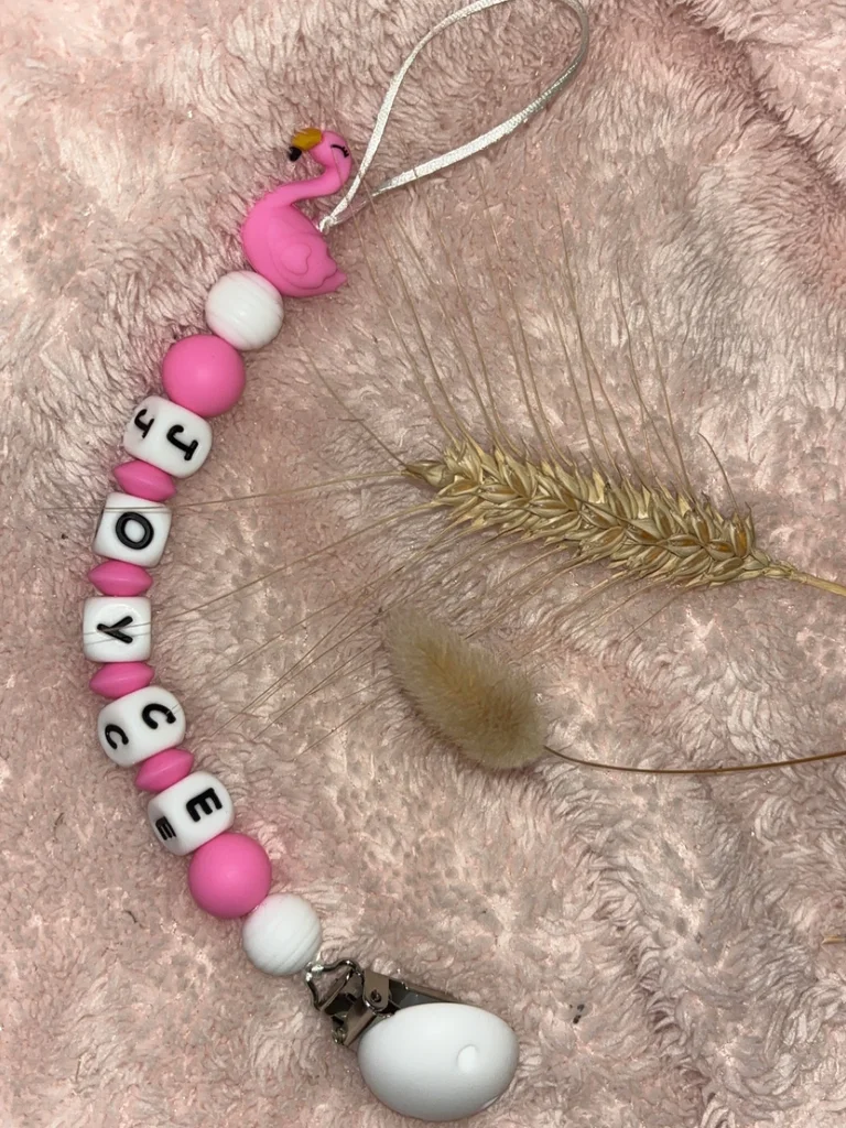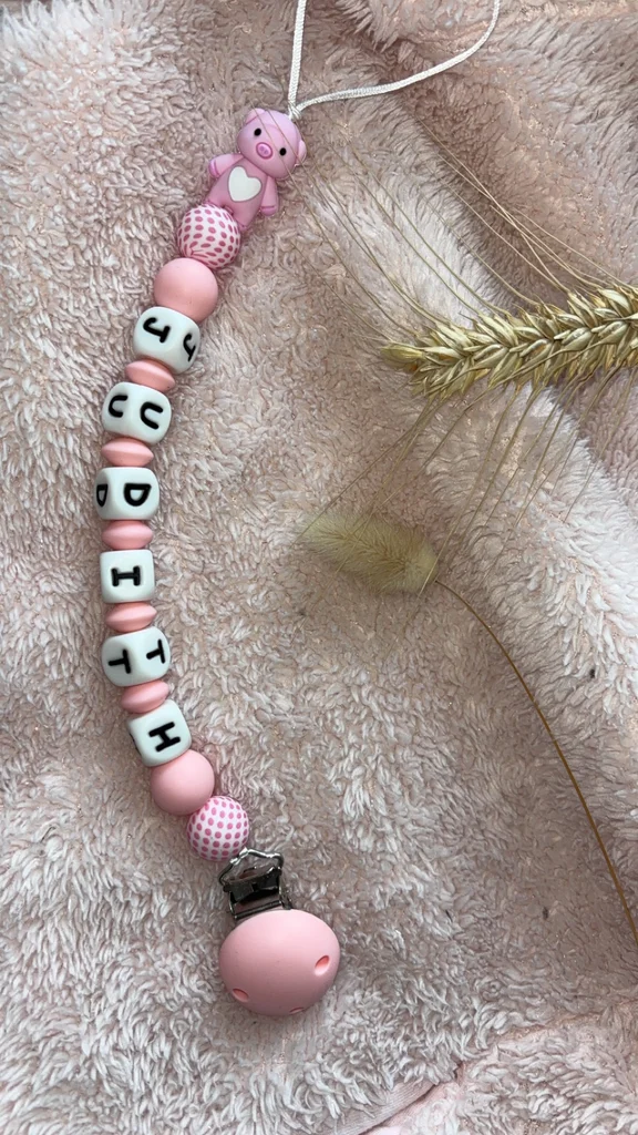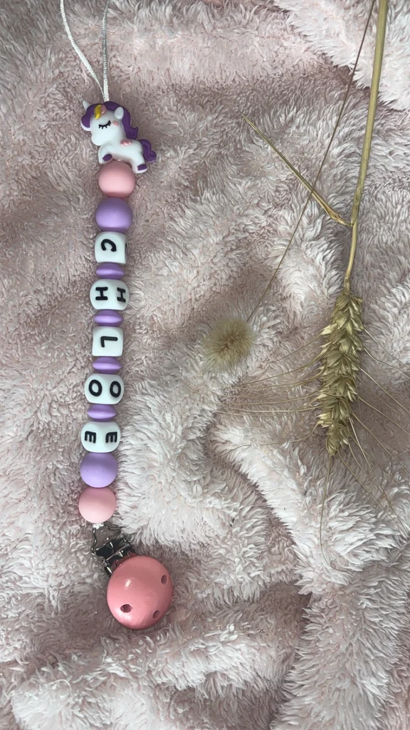 Créatrice déclarée, je réalise des attache tétines personnalisable 🌸 Les perles sont au normes européenne et l’attache est sécuritaire conformément au normes également. Possible de crée des Disney ( 15€) Sans prénom ( 10€)