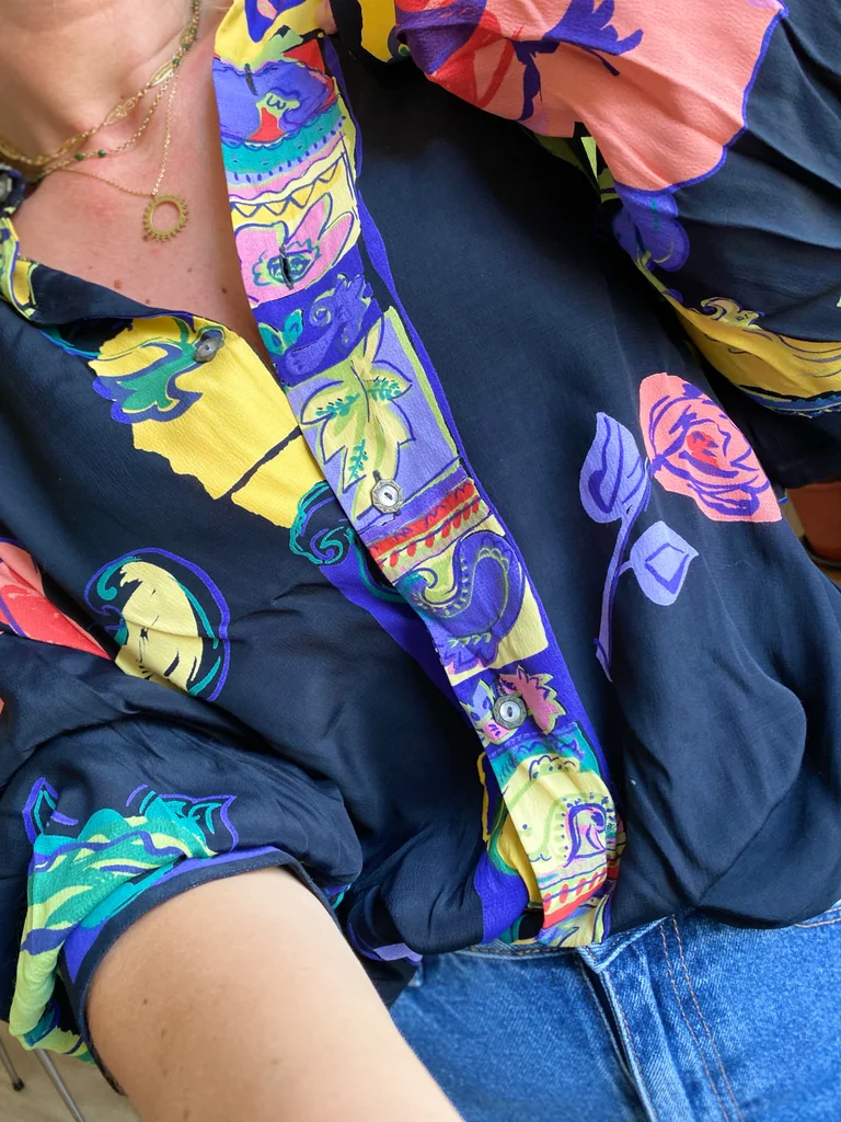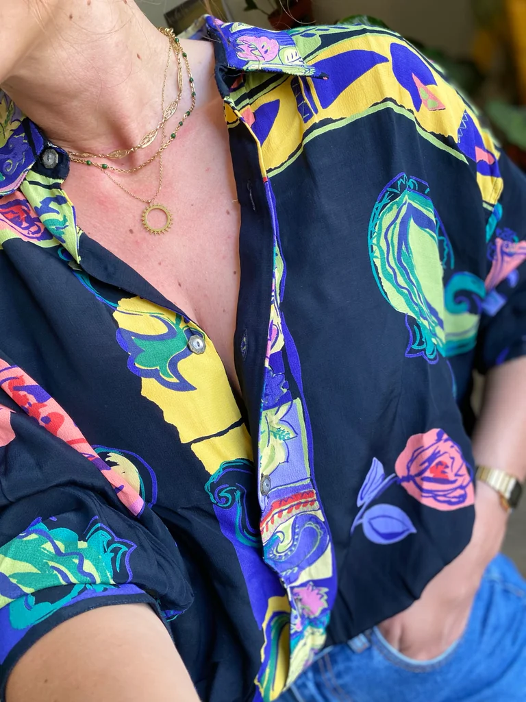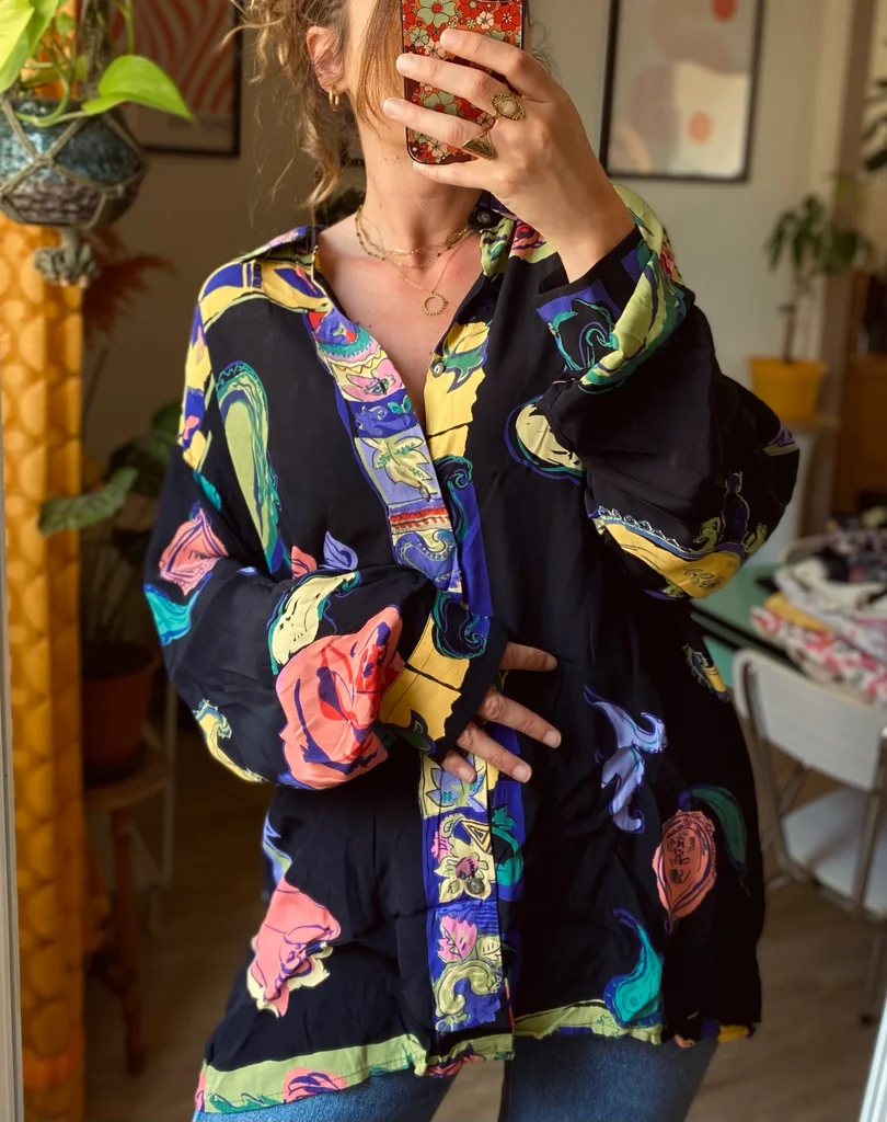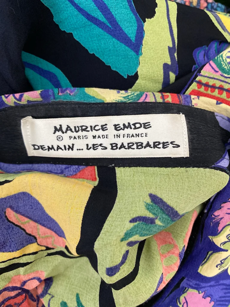 Chemise vintage signée Maurice Emde – “Demain les barbares” 🎨 Motifs riches et colorés mêlant fleurs et compositions abstraites, dans un esprit baroque / arty ✨ Coupe fluide et confortable 🇫🇷 Fabrication française 🕰️ Époque : années 90 📏 Taille estimée : XL, convient à partir du M suivant le style recherché 👕 Coupe : ample / fluide 🔘 Fermeture : boutonnée 🧵 Matière : (probablement viscose ou polyester) 🎨 Couleurs : noir, rouge, bleu, touches florales multicolores #vintage90s #madeinfrance #chemisevintage #styleart #vintagestyle #retrolook #modevintage #friperie
