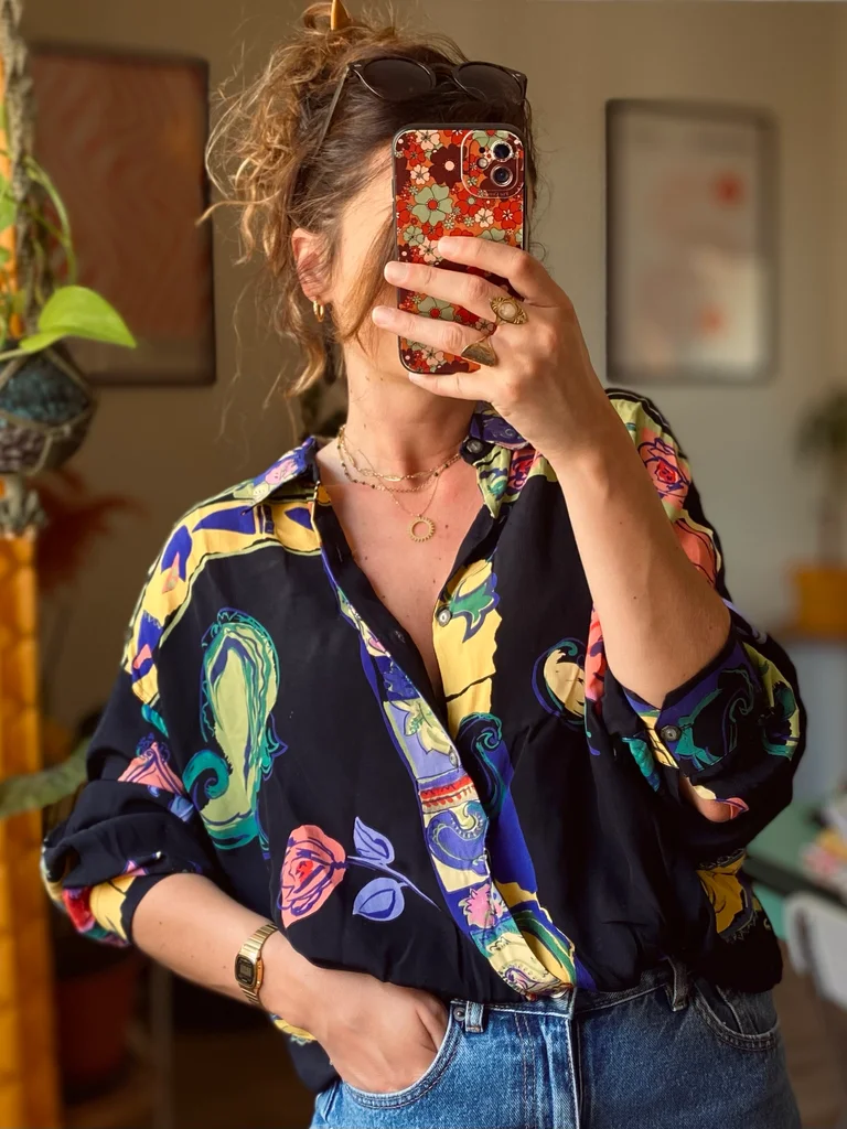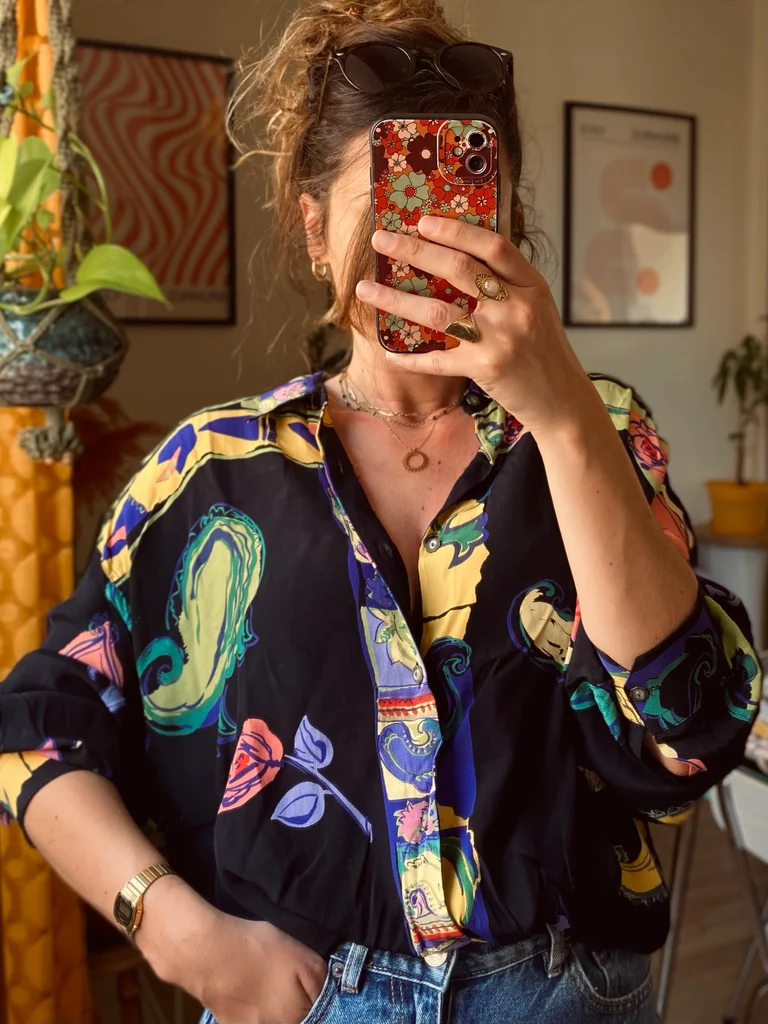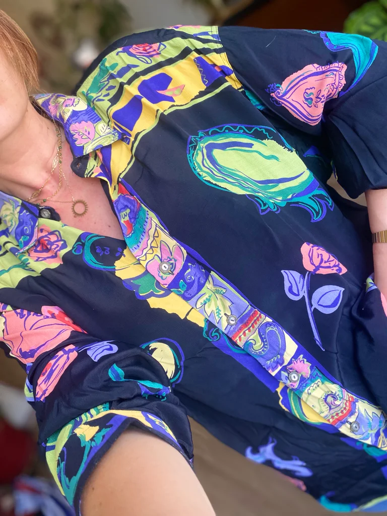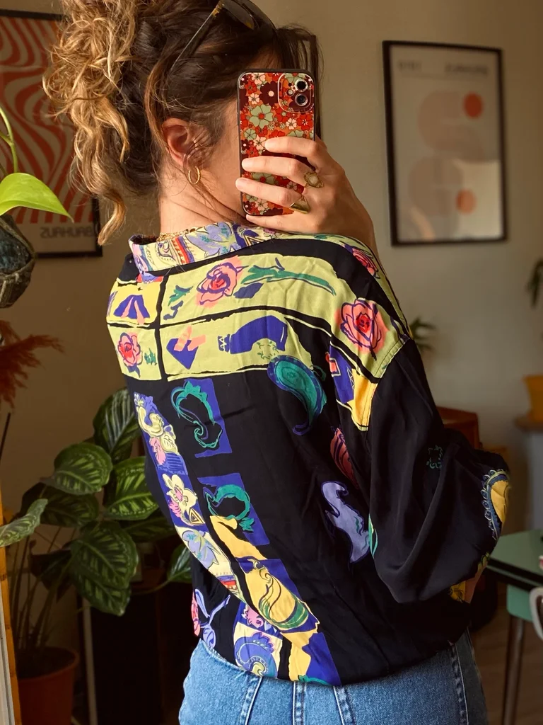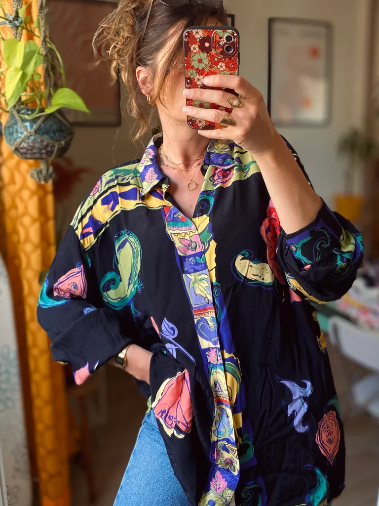 Chemise vintage signée Maurice Emde – “Demain les barbares” 🎨 Motifs riches et colorés mêlant fleurs et compositions abstraites, dans un esprit baroque / arty ✨ Coupe fluide et confortable 🇫🇷 Fabrication française 🕰️ Époque : années 90 📏 Taille estimée : XL, convient à partir du M suivant le style recherché 👕 Coupe : ample / fluide 🔘 Fermeture : boutonnée 🧵 Matière : (probablement viscose ou polyester) 🎨 Couleurs : noir, rouge, bleu, touches florales multicolores #vintage90s #madeinfrance #chemisevintage #styleart #vintagestyle #retrolook #modevintage #friperie