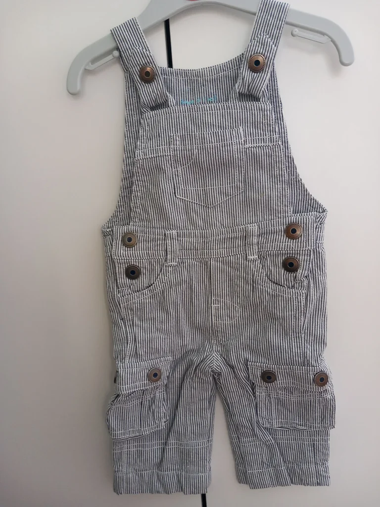 Description : Vends cette adorable salopette pour bébé de la marque Tape à l'œil. Taille : 3 mois (60 cm) Style : Rayures verticales fines (style "hickory stripe") gris et blanches. Détails : * Nombreux boutons décoratifs aspect laiton vieilli. Poches cargo sur les côtés et petite poche sur la poitrine. Bretelles ajustables. État : Très bon état, peu portée. Parfaite pour un look craquant et décontracté !