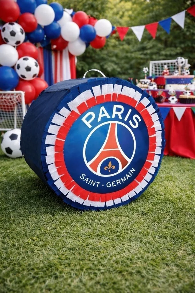 Pinata PSG pour anniversaire enfant. Dimensions 25cm de diamètre x13cm de profondeur. Pinata et bâton Tout est neuf.