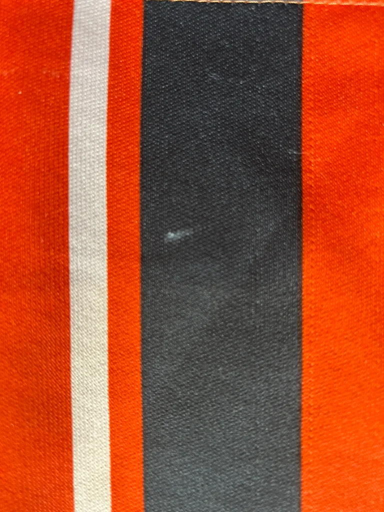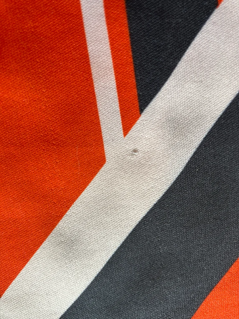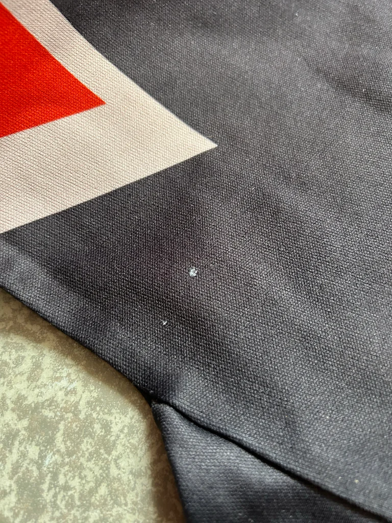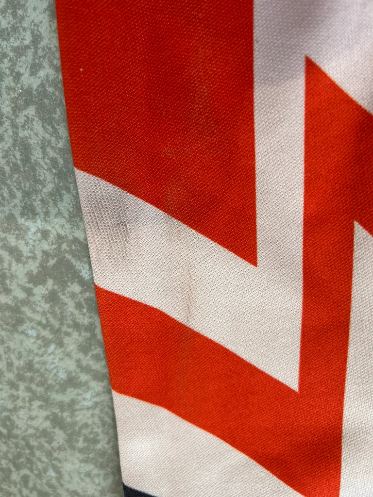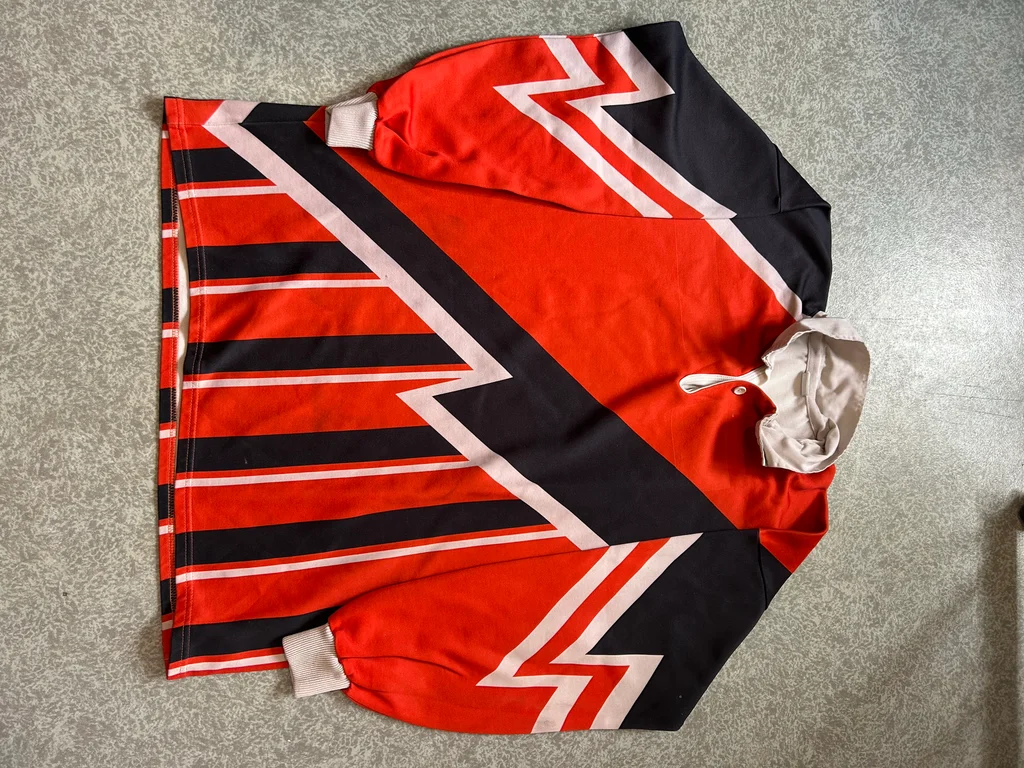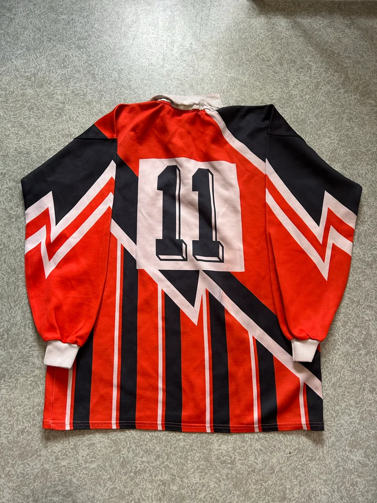 Maillot de rugby vintage au design graphique dynamique (chevrons et rayures). • Couleurs : Rouge, noir et blanc cassé. • Détails : Numéro 11 au dos, col polo blanc avec bouton. • État : État satisfaisant. À noter quelques signes d'usure visibles sur les photos (petites bouloches, légères taches et un petit accroc). Le prix tient compte de ces défauts. • Taille : Indiqué XL sur l'étiquette. La coupe est fidèle à un XL vintage (assez large). • Envoi : Rapide, sous 24h à 48h maximum ! #rugby #vintage #rugbyshirt #sportswear #annees90 #streetwear #tailleXL #maillotvintage #retro