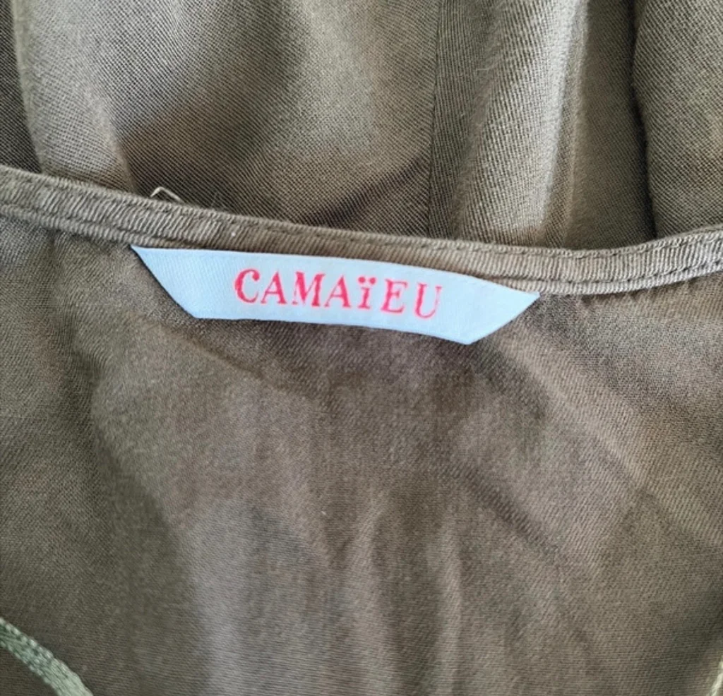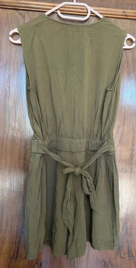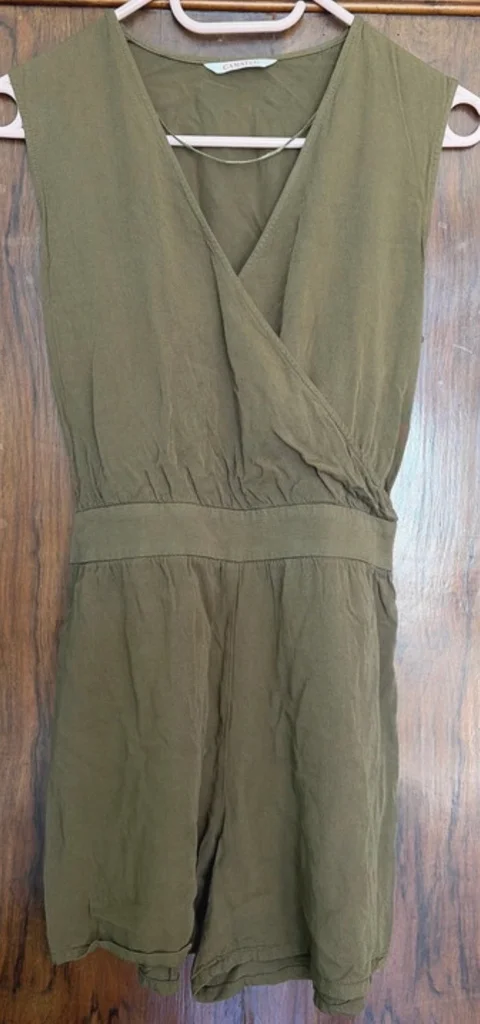 Combi short kaki, taille élastique à l’arrière , Dimensions : Épaule à épaule : 36 cm Aisselle à aisselle :44 cm Taille :34 cm Longueur : 72 cm