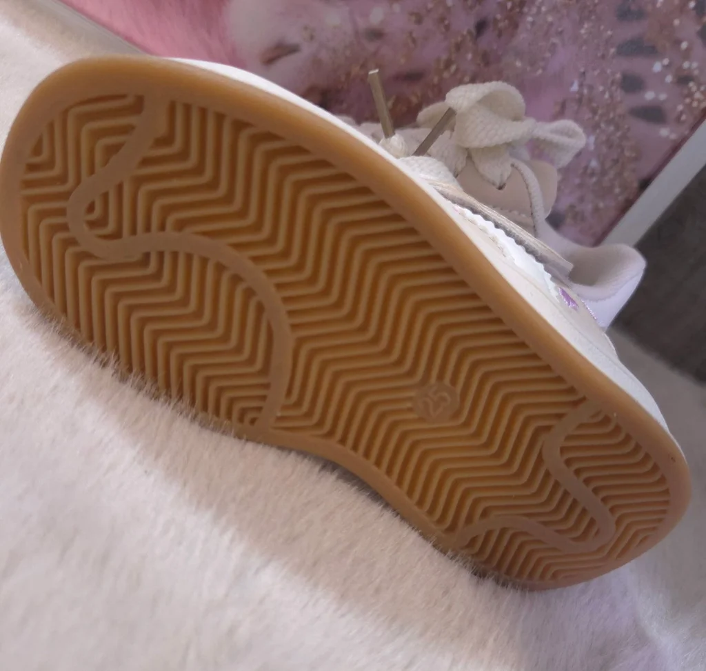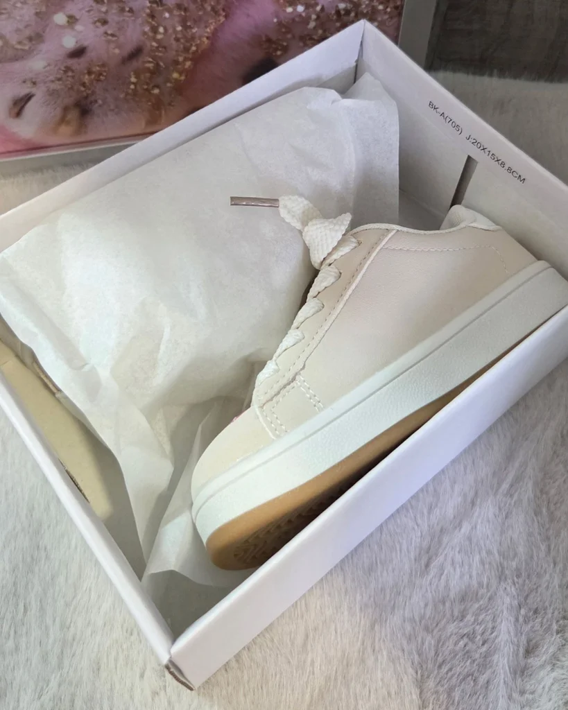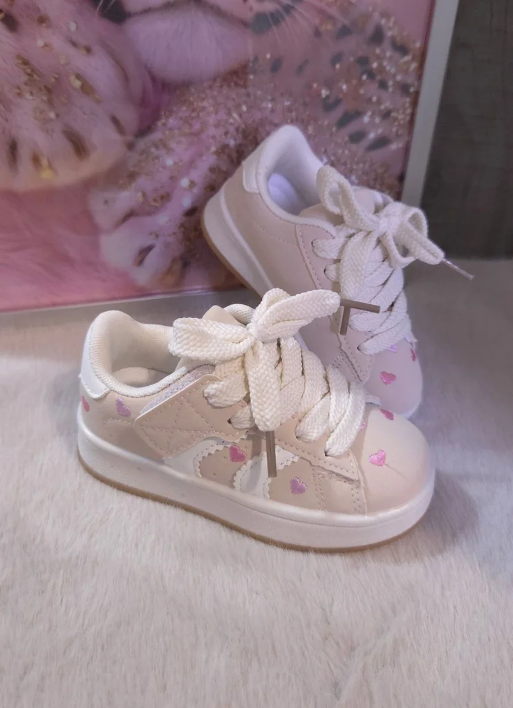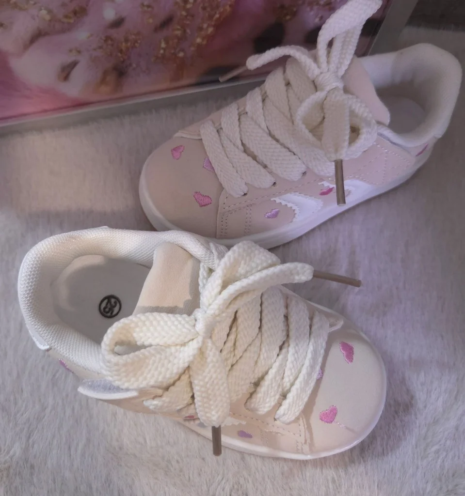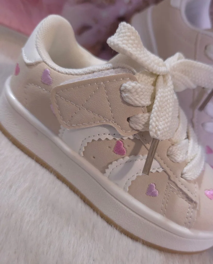 Basket à scratch + lacet Couleur beige avec petites coeurs roses brodés. Neuves. Taillent parfaitement bien.