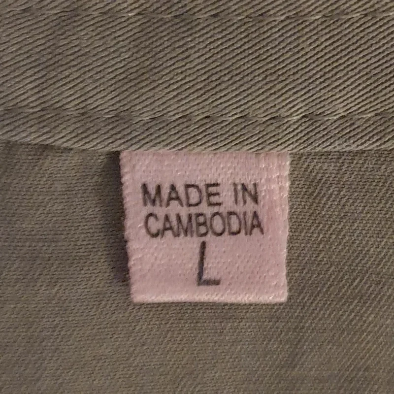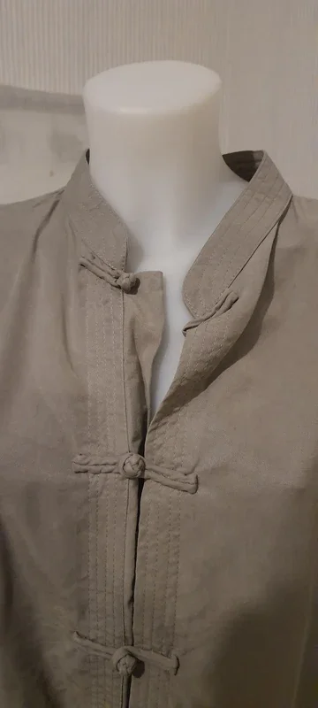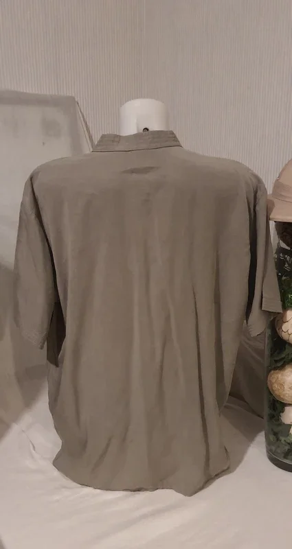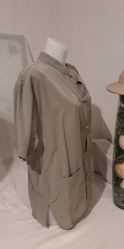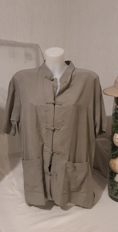 Tunique kaki #Cambodia, taille L Fermeture par lien, manche courte 2 poches, fendu en bas, tissus très doux Peut être porté aussi en surchemise Dimensions à plat: épaule 48 cm., sous aisselle 58 cm. Hauteur 72 cm.