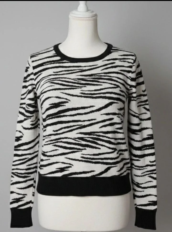 Je vends ce superbe pull col rond au motif zèbre (animal print) noir et blanc. Un classique indémodable qui apporte tout de suite du style à une tenue simple ! Coupe : Ajustée et moderne. Détails : Finitions bords-côtes noirs au col, aux poignets et à la taille pour un joli maintien. État : bon état, peu porté. Pas de bouloches ni de fils tirés. Style : Parfait avec un jean noir taille haute ou une jupe en similicuir pour un look rock. ✨ Mes petits plus : 📦 Envoi rapide et soigné (sous 24h/48h). 🧼 Article lavé et prêt à être porté. 💸 Réduction activée sur les lots, n'hésitez pas à faire un tour dans mon dressing !