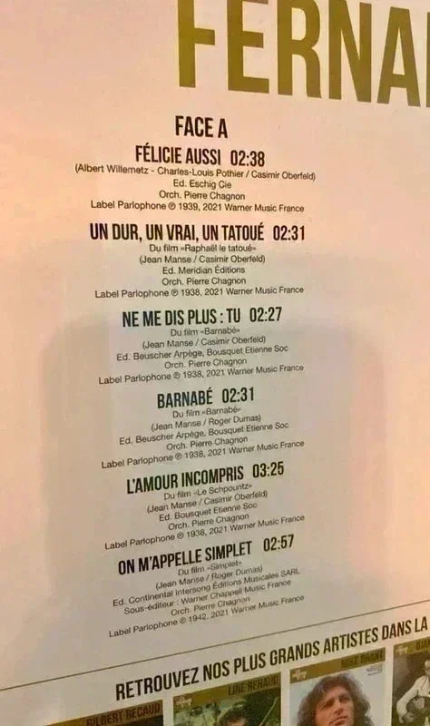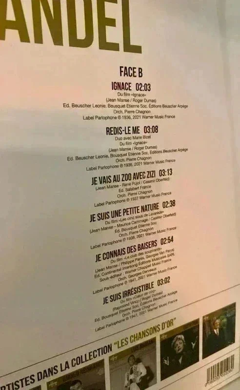 Fernand Contandin, dit Fernandel, né le 8 mai 1903 à Marseille et mort le 26 février 1971 à Paris 16e, est un acteur, humoriste, chanteur et réalisateur français. Issu du music-hall, il est durant plusieurs décennies l'une des plus grandes vedettes du cinéma français. Véritable champion du box-office, il parvient au cours de sa longue carrière à attirer plus de 200 millions de spectateurs dans les salles. Label:Parlophone – 0190295055080 Série:Les Chansons D'or (2) – Format:Vinyl, LP, Compilation Country:France Sortie:2021 Genre:Pop Style:Chanson Etat: Mint (Absolument parfait sous tous les aspects. N'a certainement jamais joué) Envoi rapide et soigné