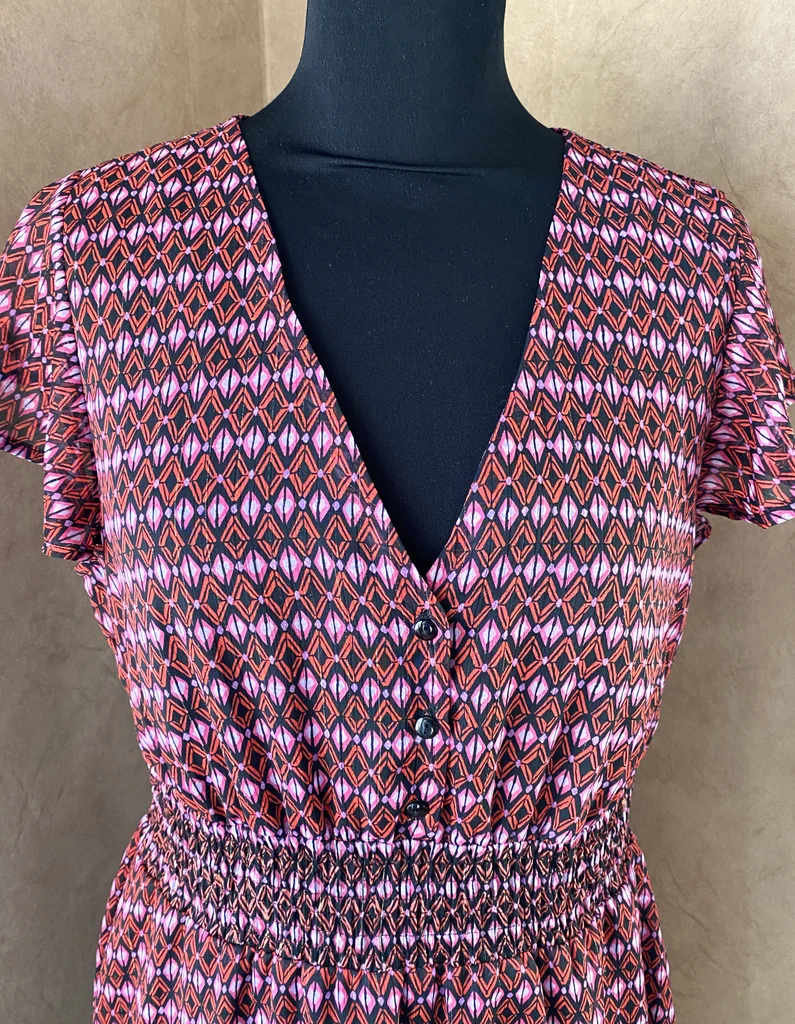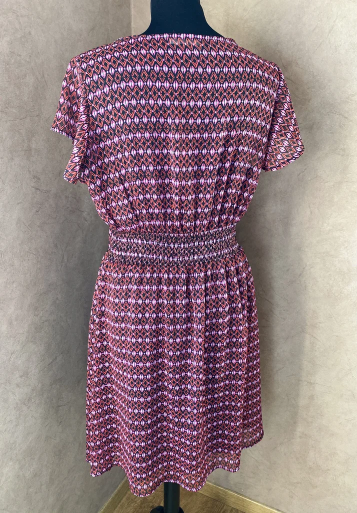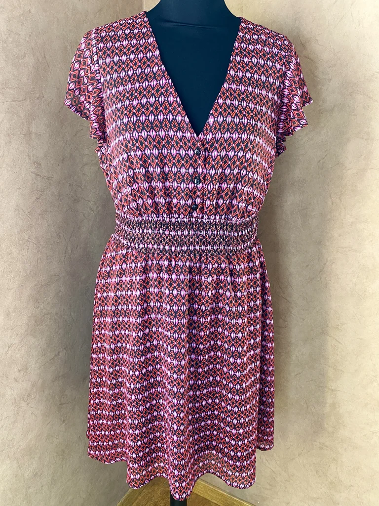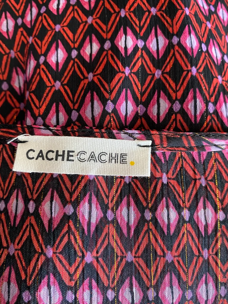 Très jolie robe CACHE CACHE au style moderne et féminin, parfaite pour le quotidien comme pour une sortie 🌺 ✨ Description : Robe courte à motifs graphiques géométriques dans des tons rouge, rose et noir, avec de fins fils argentés ✨ Taille : 42 En excellent état, jamais portée Matière légere, fluide et agréable à porter (99% polyester + fibre métal) 👗 Détails : Encolure en V avec boutons décoratifs Manches courtes légèrement volantées Taille smockée élastique pour une silhouette marquée et confortable Doublure noire unie sur la partie jupe (pas de transparence) Coupe fluide, idéale pour toutes les morphologies 📏 Dimensions : Taille : 42 Longueur : 89 cm Épaules : 37 cm Aisselle à aisselle : 44 cm ⚡envoi rapide du colis ⚡
