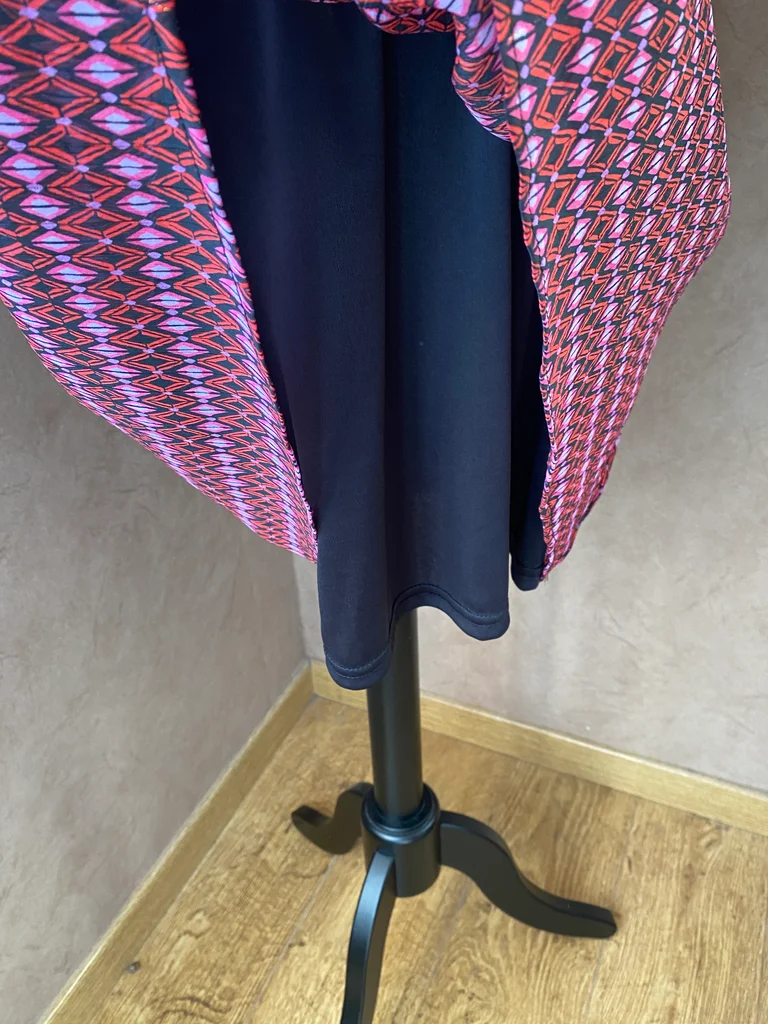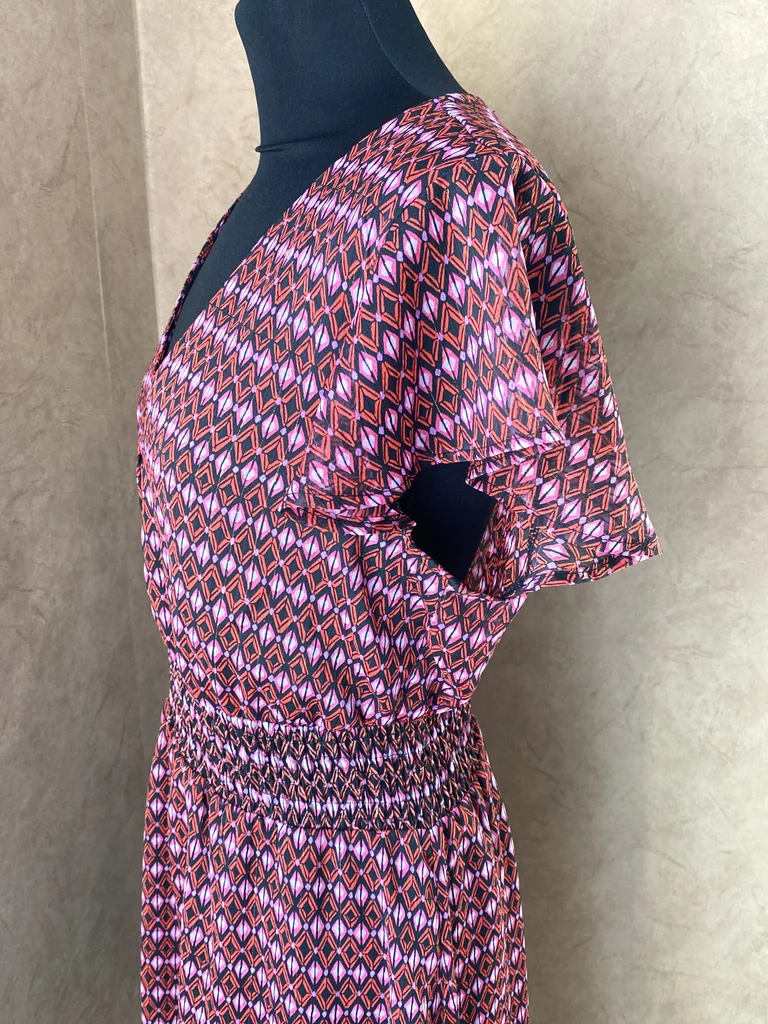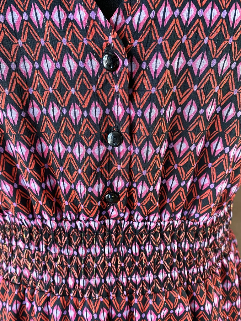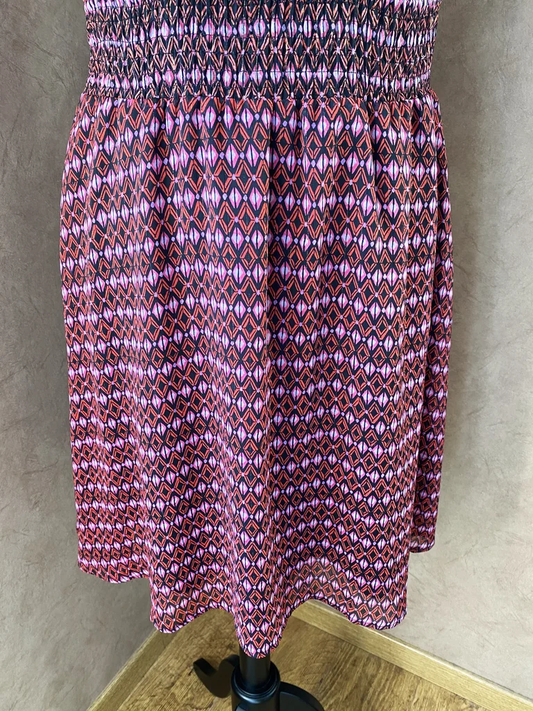 Très jolie robe CACHE CACHE au style moderne et féminin, parfaite pour le quotidien comme pour une sortie 🌺 ✨ Description : Robe courte à motifs graphiques géométriques dans des tons rouge, rose et noir, avec de fins fils argentés ✨ Taille : 42 En excellent état, jamais portée Matière légere, fluide et agréable à porter (99% polyester + fibre métal) 👗 Détails : Encolure en V avec boutons décoratifs Manches courtes légèrement volantées Taille smockée élastique pour une silhouette marquée et confortable Doublure noire unie sur la partie jupe (pas de transparence) Coupe fluide, idéale pour toutes les morphologies 📏 Dimensions : Taille : 42 Longueur : 89 cm Épaules : 37 cm Aisselle à aisselle : 44 cm ⚡envoi rapide du colis ⚡